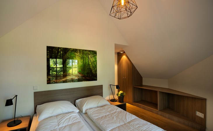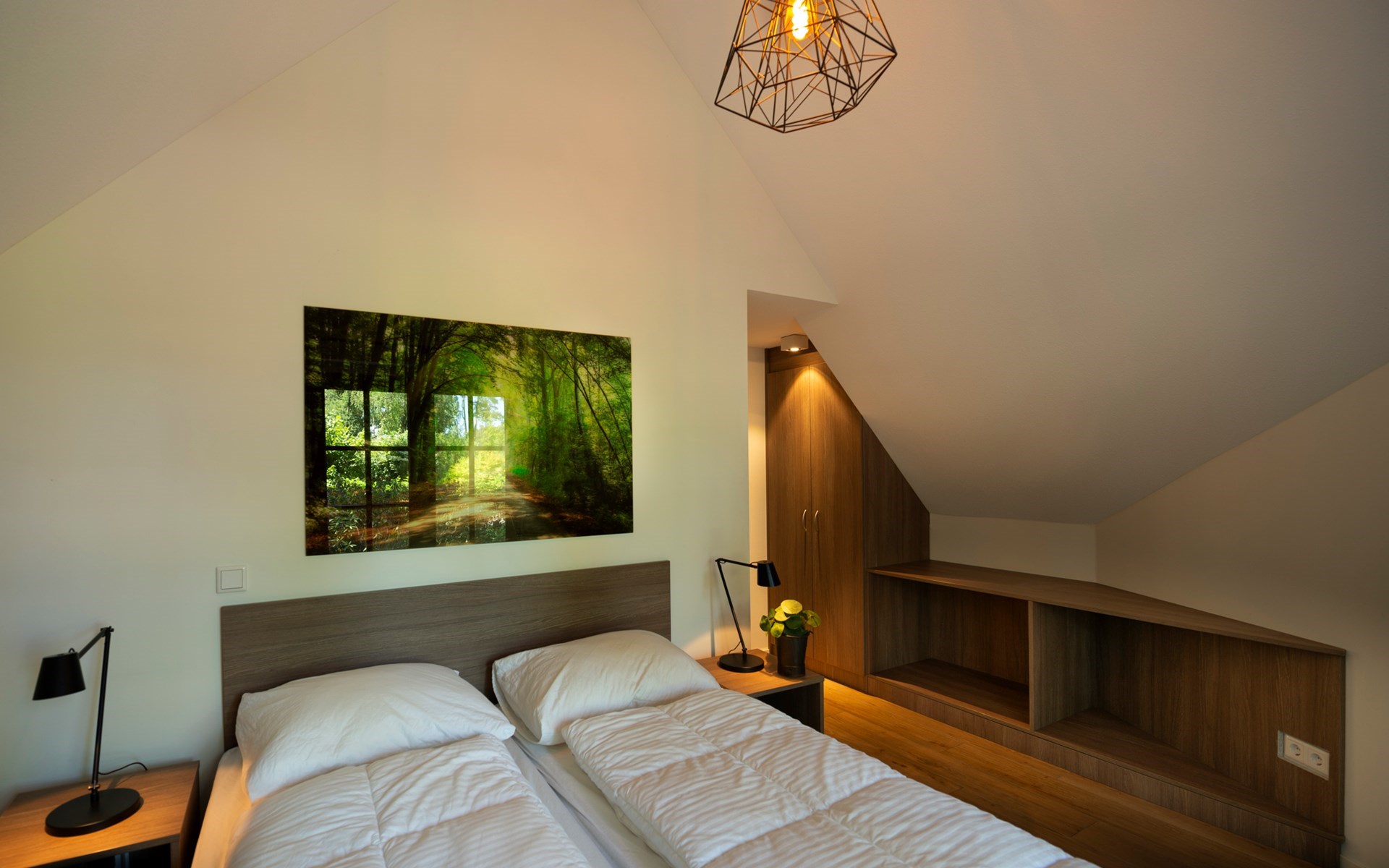 Das Ferienhaus ist gemütlich und stimmungsvoll eingerichtet, wobei die Farben des Waldes reingeholt wurden. Das komplette Haus ist von Holzoptik Fliesen ausgestattet und ist von allem Komfort und Annehmlichkeiten ausgestattet. Das Wohnzimmer verfügt über einen Holzkamin und grenzt an den Essbereich und der offenen Küche mit Naturstein Arbeitsplatte. Im Haus befinden sich Zwei 2 Personenschlafzimmer, auf einem der Schlafzimmer befindet sich ein Fernseher. Das Badezimmer hat eine begehbare Dusche und eine separate Toilette.