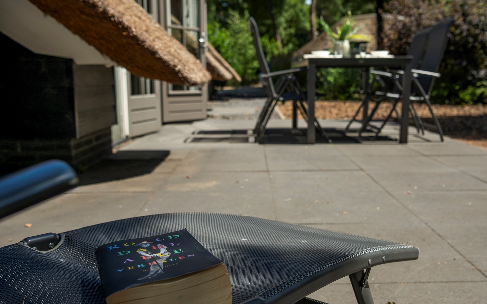 Rundum das Haus herum befindet sich ein Wald ähnlicher Garten und auf der Terrasse stehen Komfortable Gartenmöbel wo Sie auf der sonnigen Südseite oder unter der Überdachung vom Strohdach, herrlich entspannen und von den Wäldern und dem Sonnenuntergang genießen können. Es stehen Ihnen zwei Parkplätze mit einer 11 KW Ladestation für Elektroautos zur Verfügung und eine im Gartenhaus für eventuelle Elektroräder.