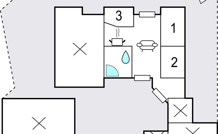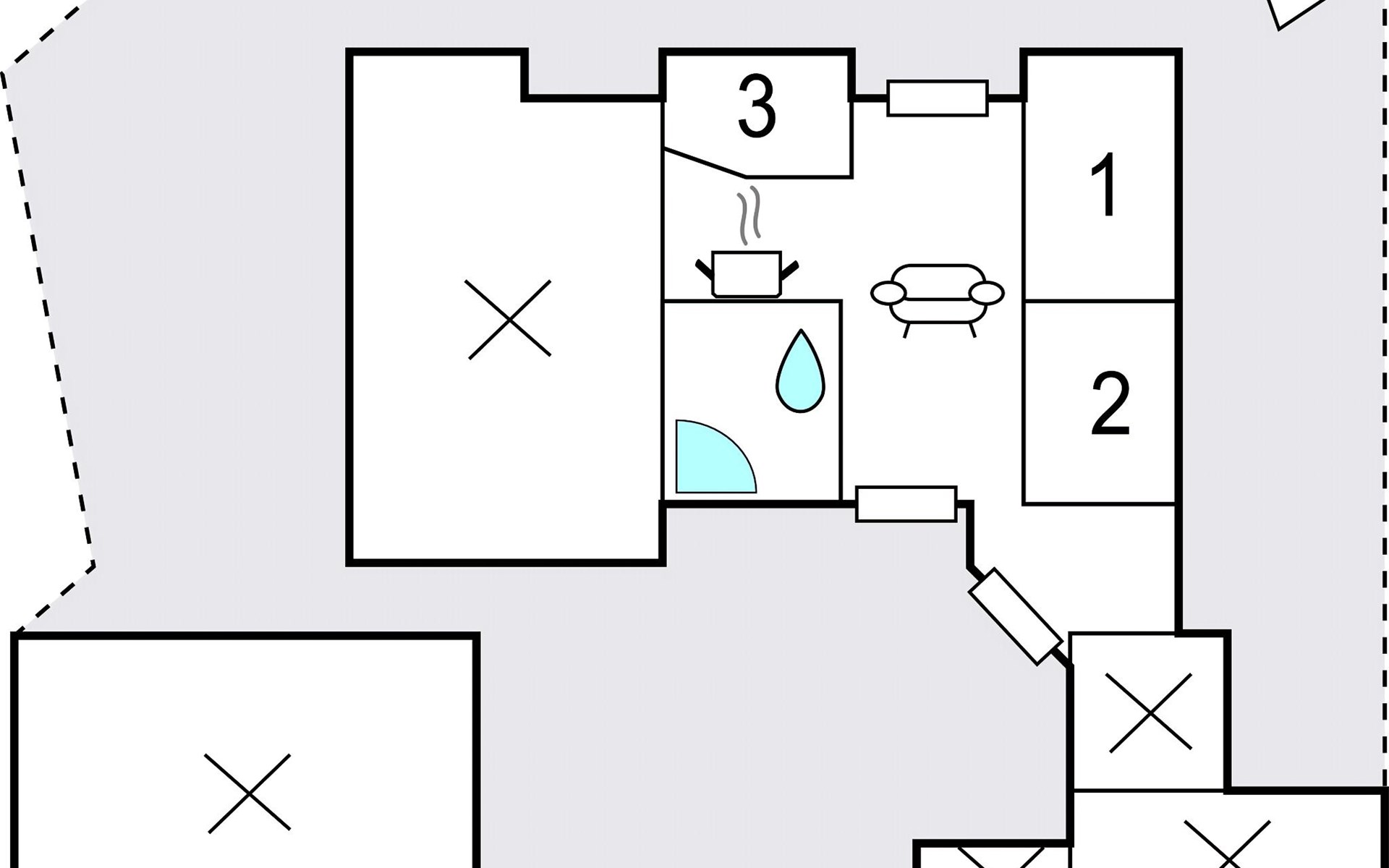 Es gibt drei Schlafzimmer und ein Badezimmer mit Whirlwanne und Dusche. Ein Teil des Hauses ist für Gäste nicht zugänglich und zeitweise bewohnt.