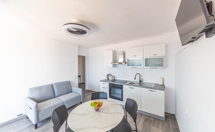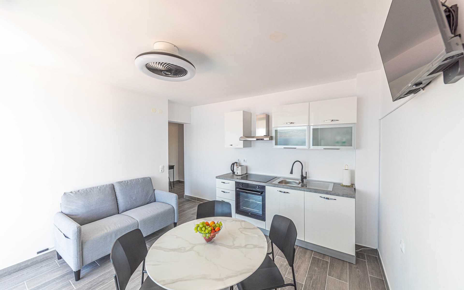 Diese einladende Ferienwohnung hält alles bereit, was Sie für einen erholsamen und sorglosen Urlaub benötigen: ein freundlicher Wohnbereich mit Esstisch, ein bequemes Sofa zum Ausspannen und ein kleiner Fernseher für entspannte Abende. Lassen Sie die Seele baumeln, während Sie Ihr Lieblingsgericht zubereiten und dabei ein Glas Wein genießen.