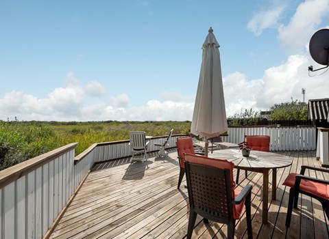 Genießen Sie in diesem Ferienhaus schöne Sommerabende auf der geschützten Terrasse.