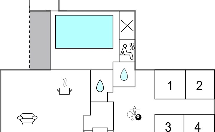 Freuen Sie sich auf dieses moderne und ansprechende Haus, das Sie zusammen mit Ihrer Großfamilie oder befreundeten Familien Ihr zuhause nennen können. Fühlen Sie sich hier rundum wohl und beginnen Ihre Urlaubstage mit einem gemeinsamen Frühstück, das Sie in der vollständig ausgestatteten Küche zubereiten und am langen Esstisch einnehmen können. Sollte das Wetter einmal nicht so gut sein, ist das Unterhaltungsprogramm im Haus gesichert. Das Schwimmbad mit Rutsche, eine Sauna und eine Whirlpool-Badewanne versprechen Badespaß und Entspannung bei Groß und Klein. Auch der Aktivitätsraum verspricht großen Unterhaltungswert. Fordern Sie sich zu Billardspielen oder Airhockey heraus oder schauen Ihren Kindern bei einem Theaterspiel zu.