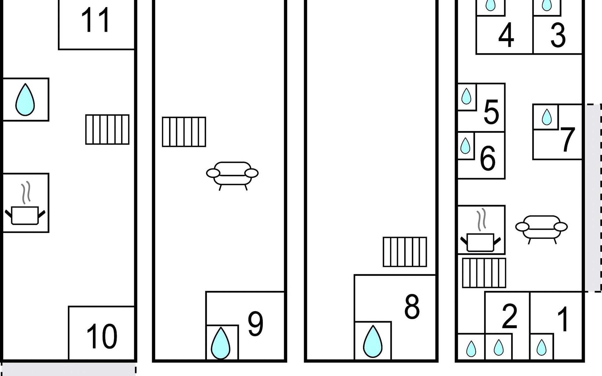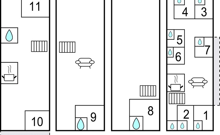 Die Räume der Hauptvilla befinden sich auf zwei Ebenen, ebenso wie im Nebengebäude, das 1 Doppelzimmer mit eigenem behindertengerechten Bad enthält. Im 1. Stock befinden sich 1 Schlafzimmer mit Doppelbett, 1 Schlafzimmer mit Einzelbett, Bad und Terrasse. Bis zu 20 Personen können hier zusammen Urlaub machen.