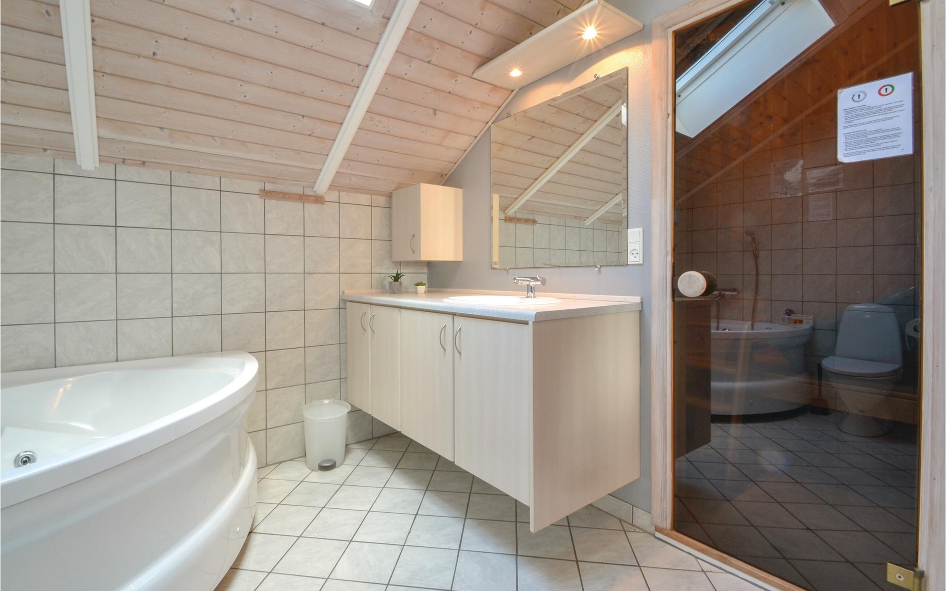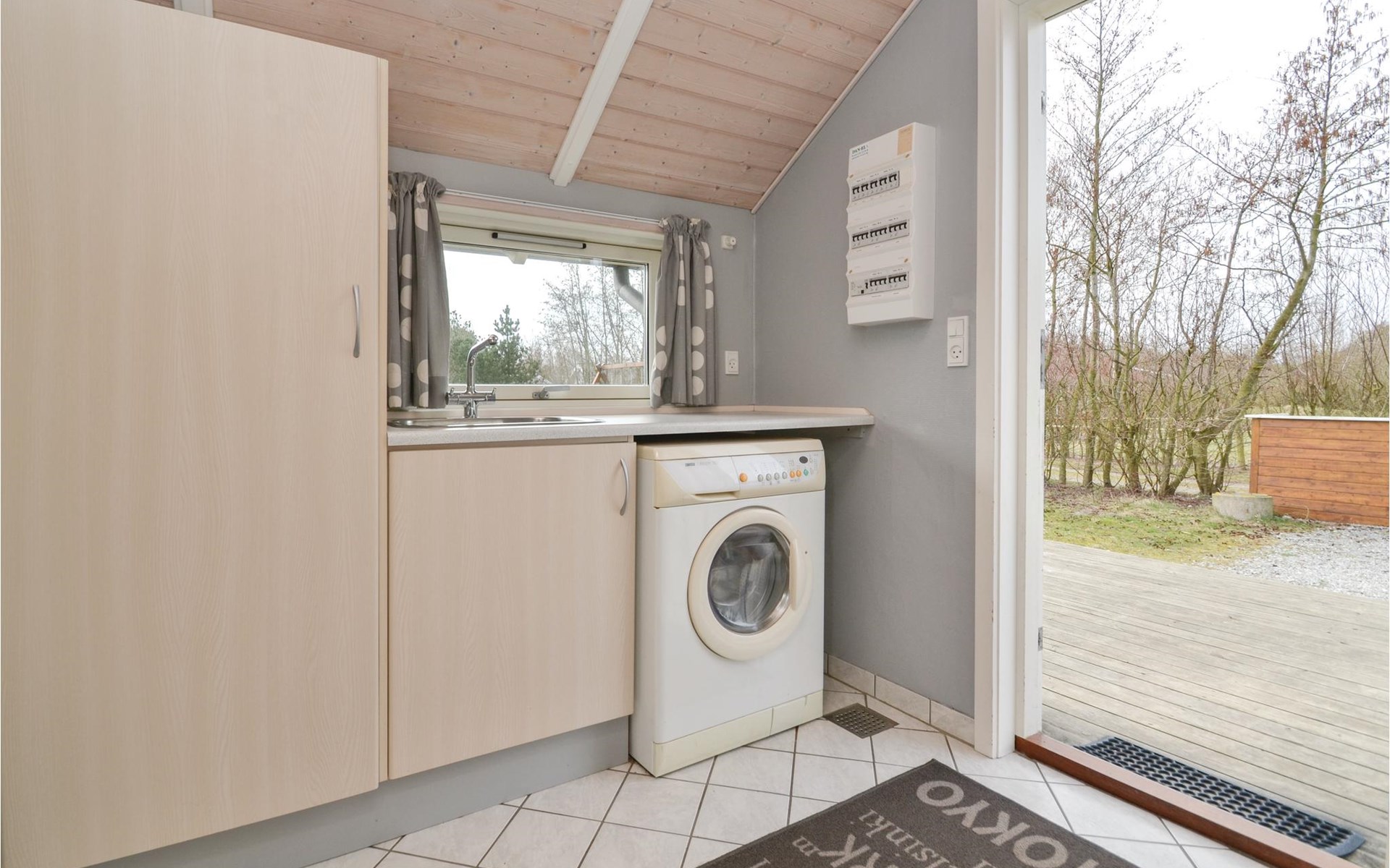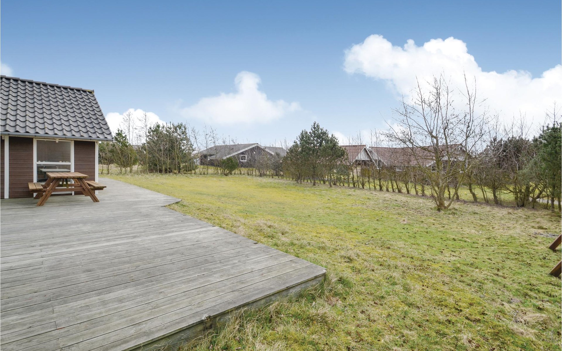 Rund um das Haus erstreckt sich eine schöne Holzterrasse, die Ihnen ganztägig Sonne bietet. Die weitläufige Grundstücksfläche lädt Kinder zum Spielen und Toben ein, während Sie die Ruhe und Natur genießen können.