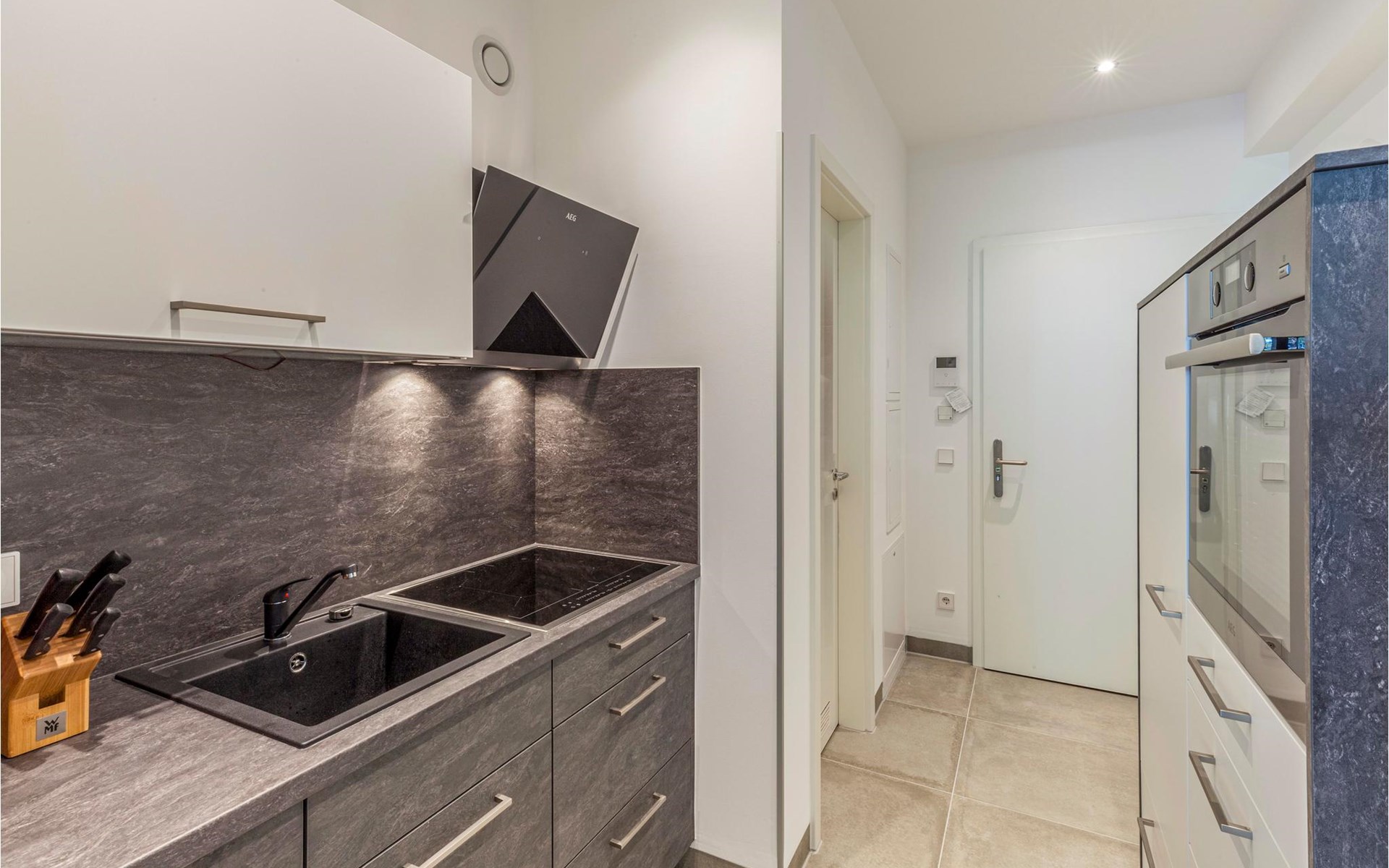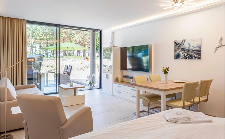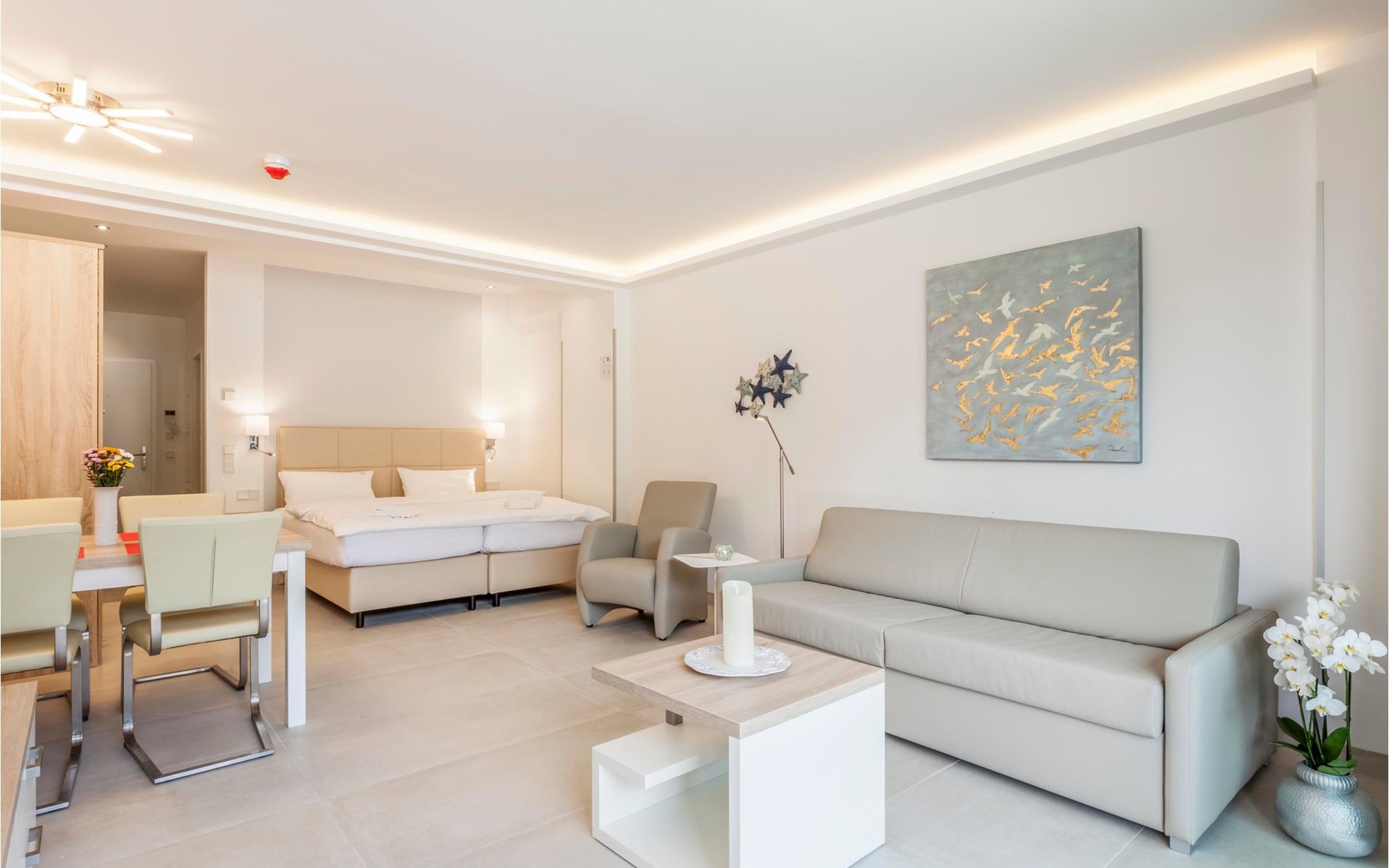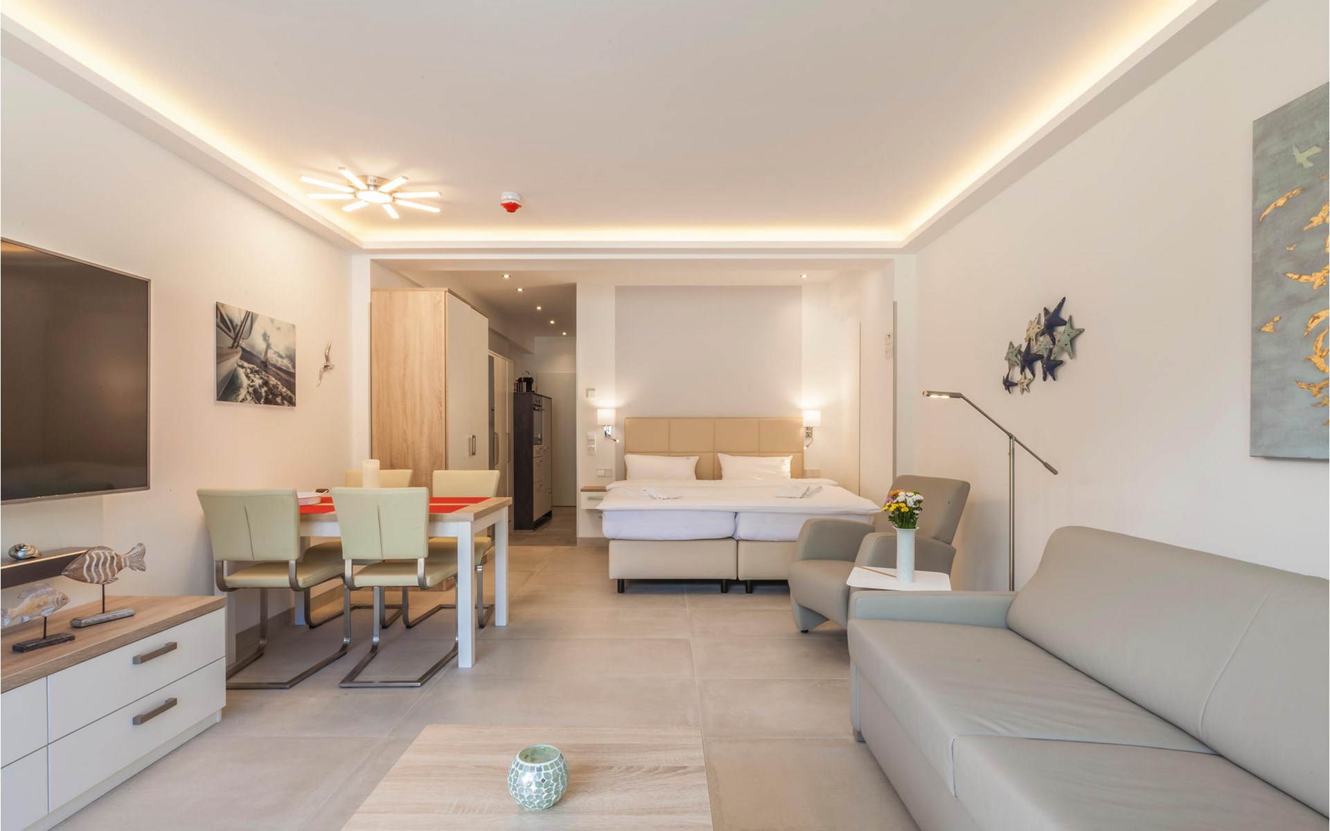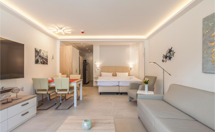 Das hochwertige und allergikerfreundliche "Panorama-Studio" liegt im Erdgeschoss und grenzt direkt an den Außenpool. Auf der Terrasse können Sie mit Blick auf den Pool frühstücken und mit etwas Glück sogar das Rauschen des Meeres hören während Sie die ersten Sonnenstrahlen genießen. In der Studiowohnung befindet sich Schlafen, Kochen und Wohnen in einem Raum. Neben dem gemütlichen Doppelbett befindet sich ein zusätzlicher Schlafplatz auf dem Schlafsofa. Die Küchenzeile ist hochwertig und vollständig ausgestattet, sodass Sie für Ihren Urlaub nichts vermissen werden. Spülmaschine, Gefrierfach und Kaffeemaschine stehen hier für Sie bereit. Kafeeliebhaber werden sich über die zusätzliche Nespresso-Maschien freuen (Kapseln bitte selbst mitbringen).