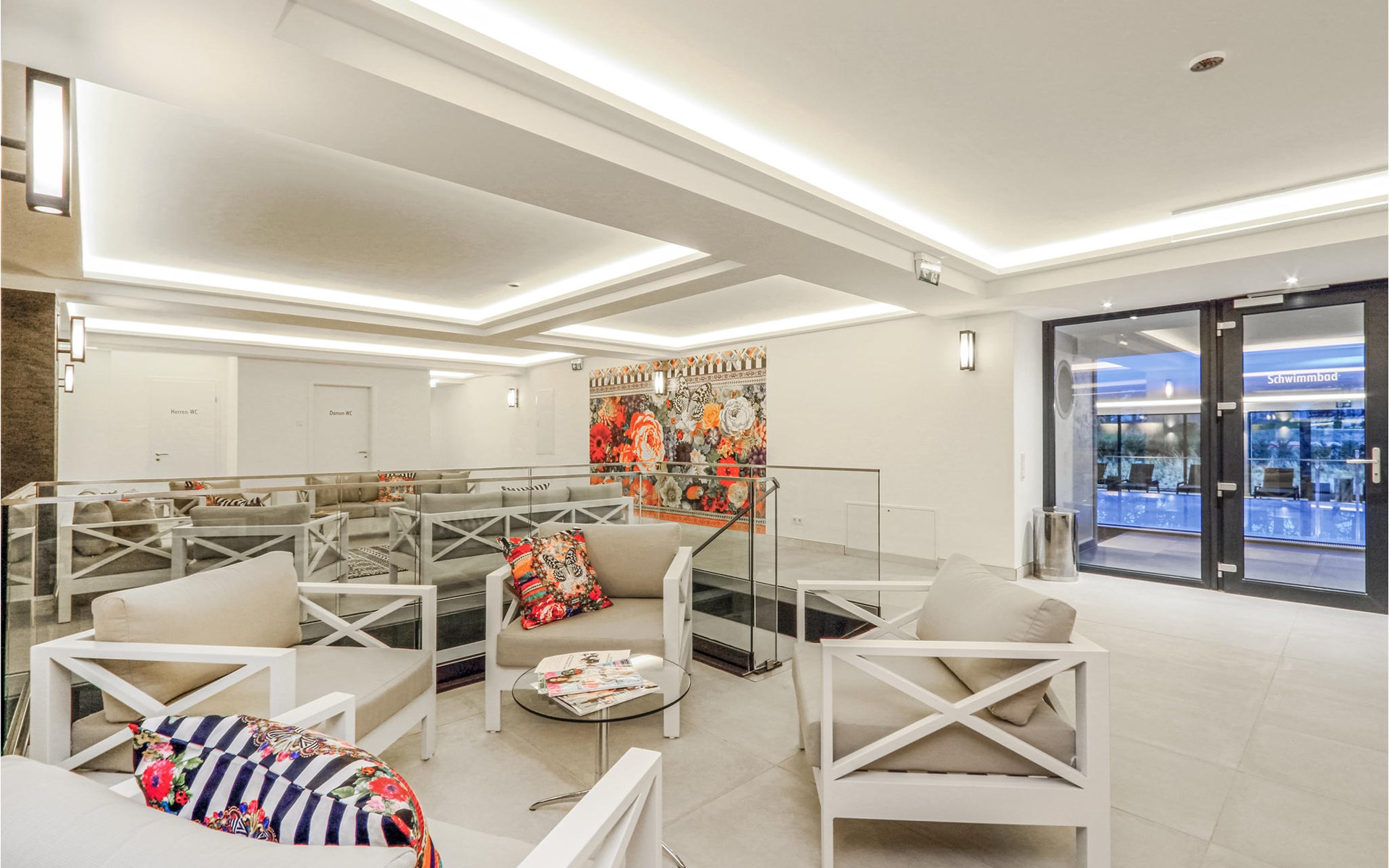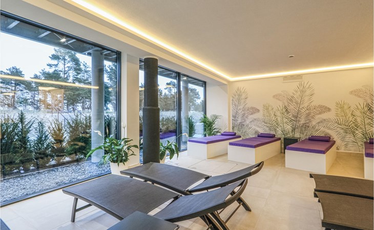 Allen Gästen von Prora Solitaire steht ein 1000 m² großer Wellnessbereich zur Verfügung, den Sie nach einem kleinen Spaziergang in ca. 250m Entfernung erreichen. Hier gibt es dann nicht nur einen großen Innenpool samt Kinderbecken, sondern auch verschiedene Saunen und Ruhebereiche, einen Fitnessbereich mit entsprechenden Geräten und die Möglichkeit für Massagen und andere Anwendungen, die an der Rezeption gebucht werden können. Weitere Besonderheiten sind das Restaurant und die hauseigene Bar.