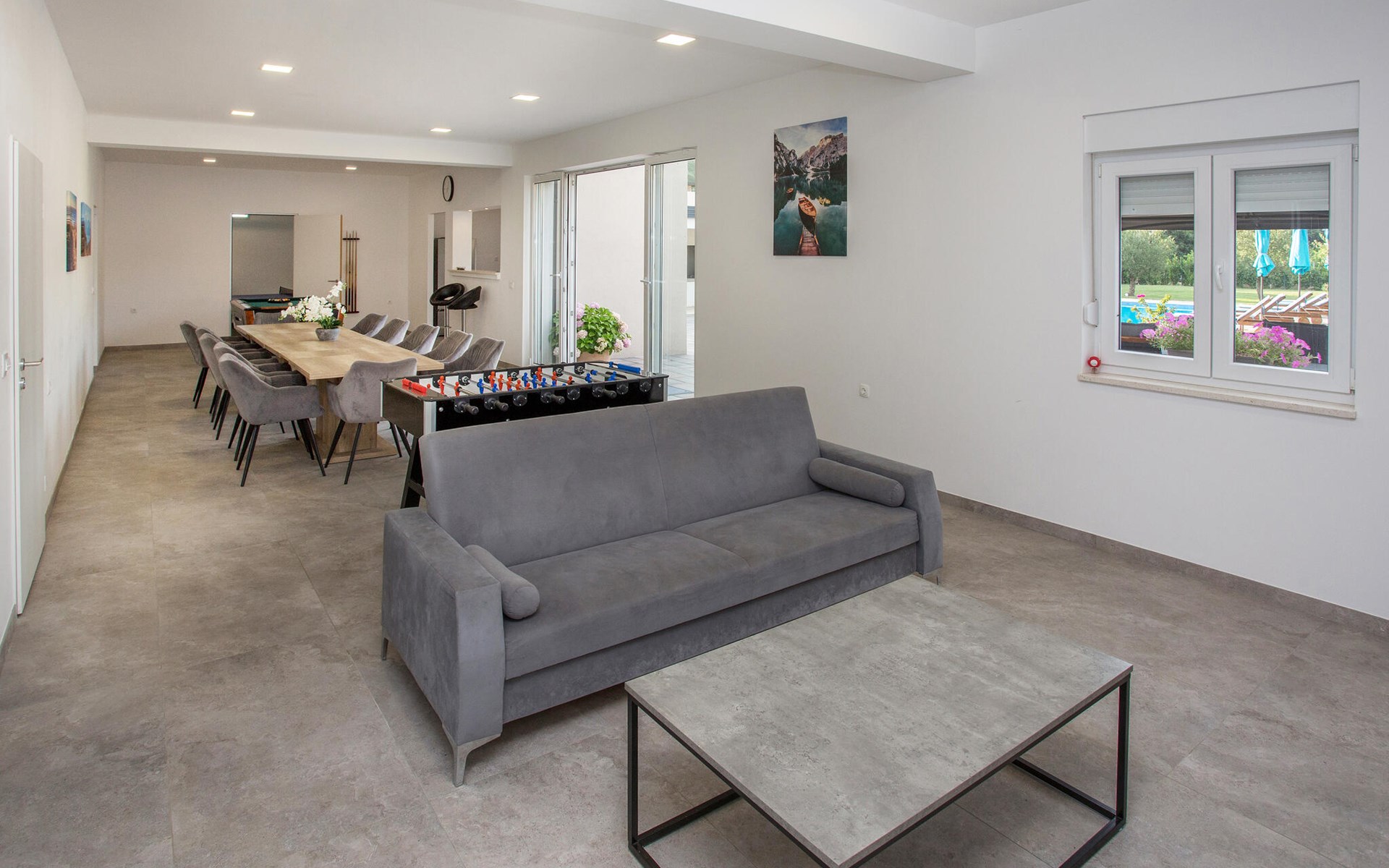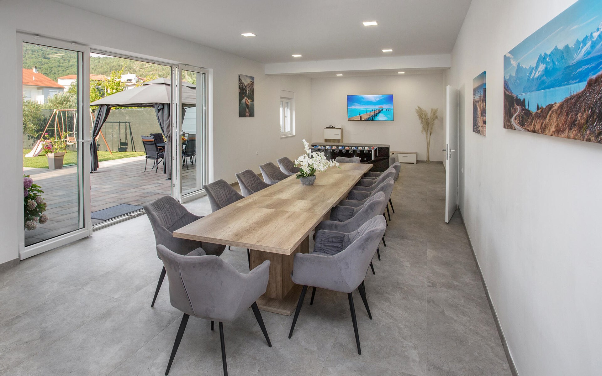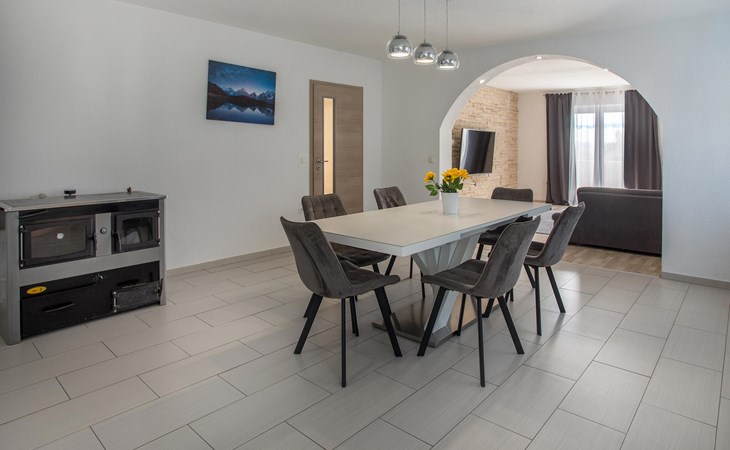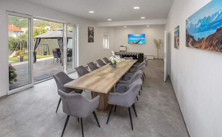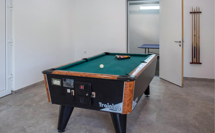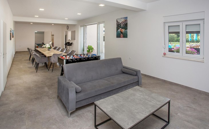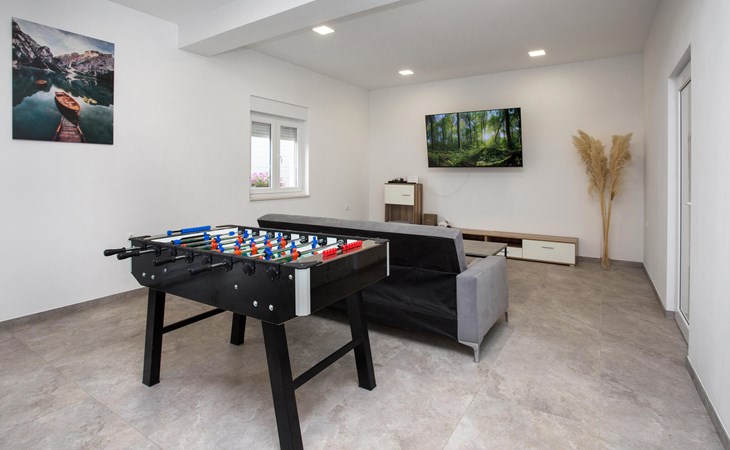 Dieses schöne, dreistöckige Ferienhaus befindet sich in Glavni Donja, nicht weit von Imotski entfernt. Es ist geräumig und geschmackvoll eingerichtet und eignet sich ideal für einen Urlaub mit mehreren Familien oder Gruppen von Freunden. Unterhalten Sie sich im Aktivitätsraum beim Dart oder Tischtennis oder spielen Sie eine Runde Billard - hier wird Ihnen nicht langweilig.