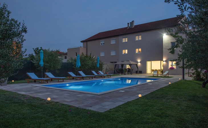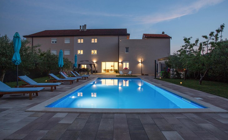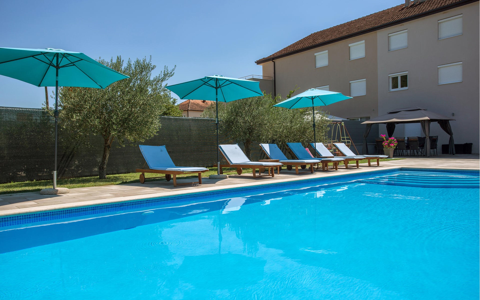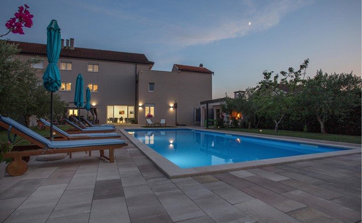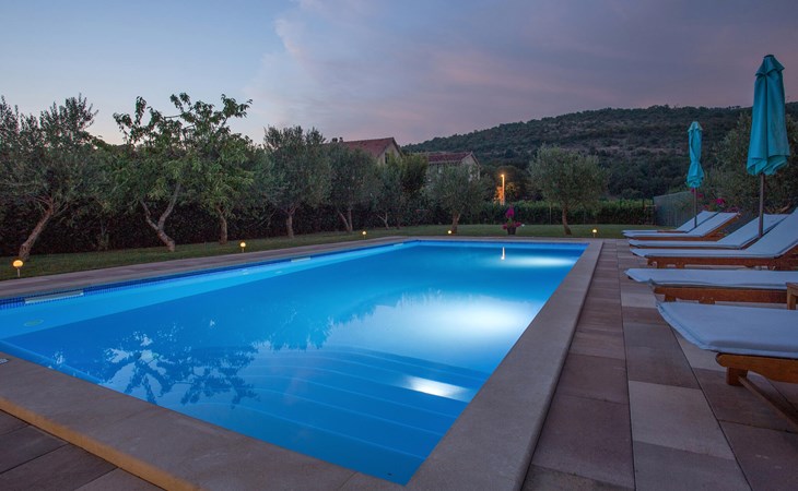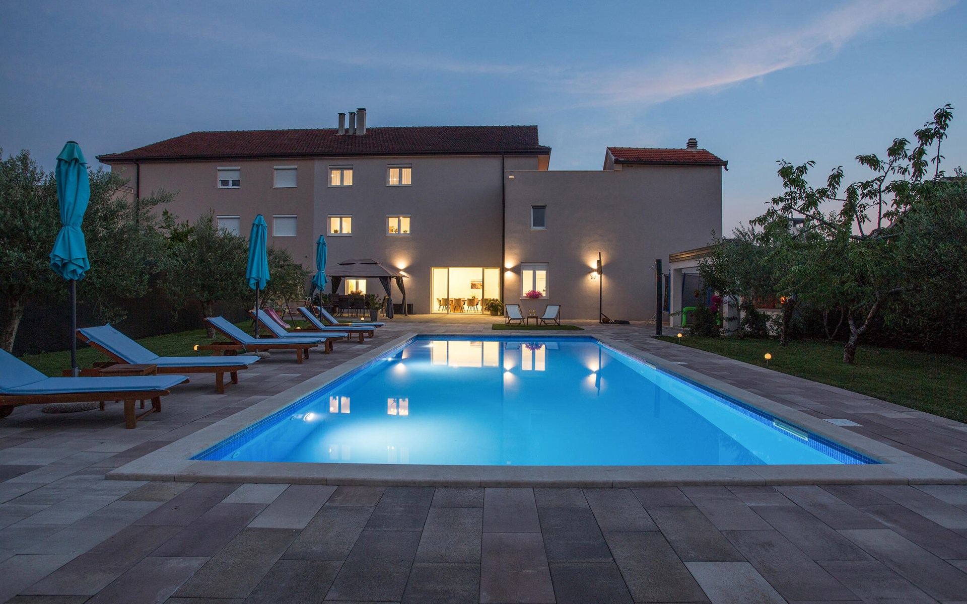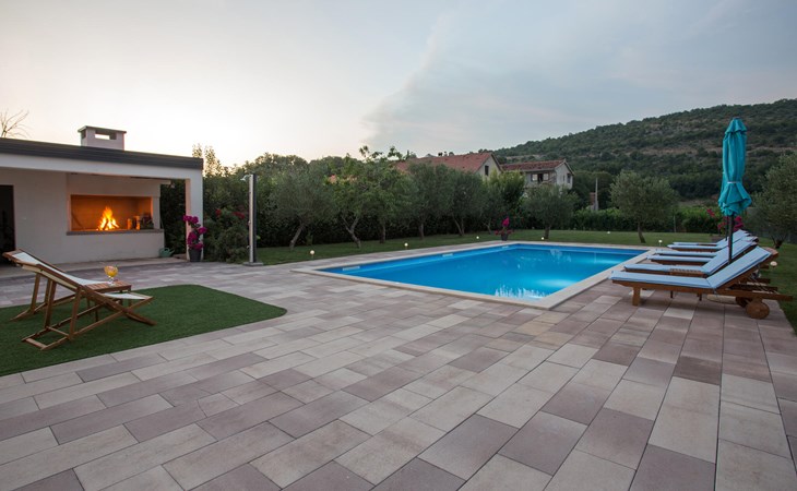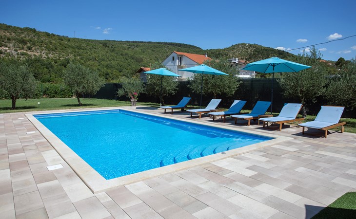 Großzügiges, familienfreundliches Poolhaus mit Blick auf die hügelige Landschaft.