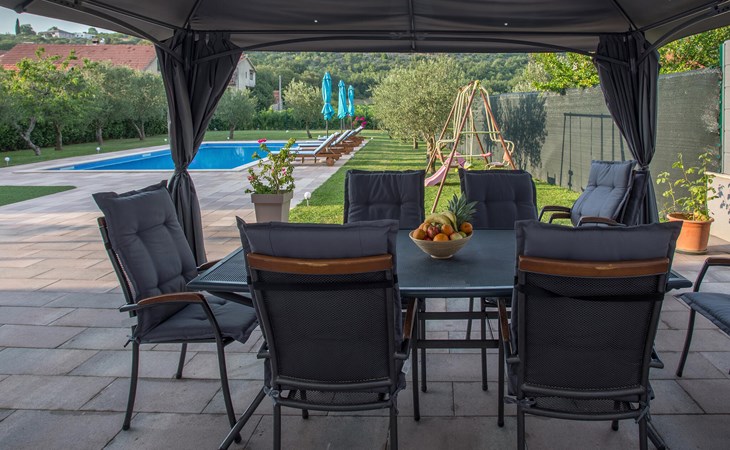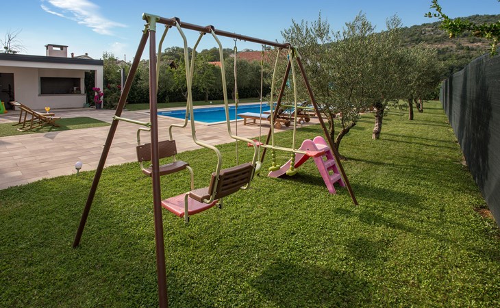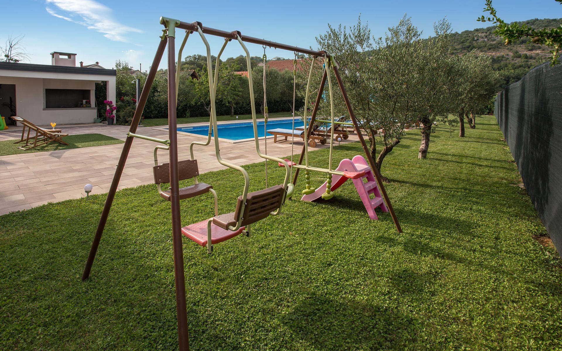 Das Haus verfügt über mehrere Terrassen und Balkone für viele entspannte Stunden im Freien. Genießen Sie Sommerabende auf der Terrasse mit Grill und erfrischen Sie sich im Pool hinter dem Haus, während die Kinder sich auf dem Kinderspielplatz vergnügen.