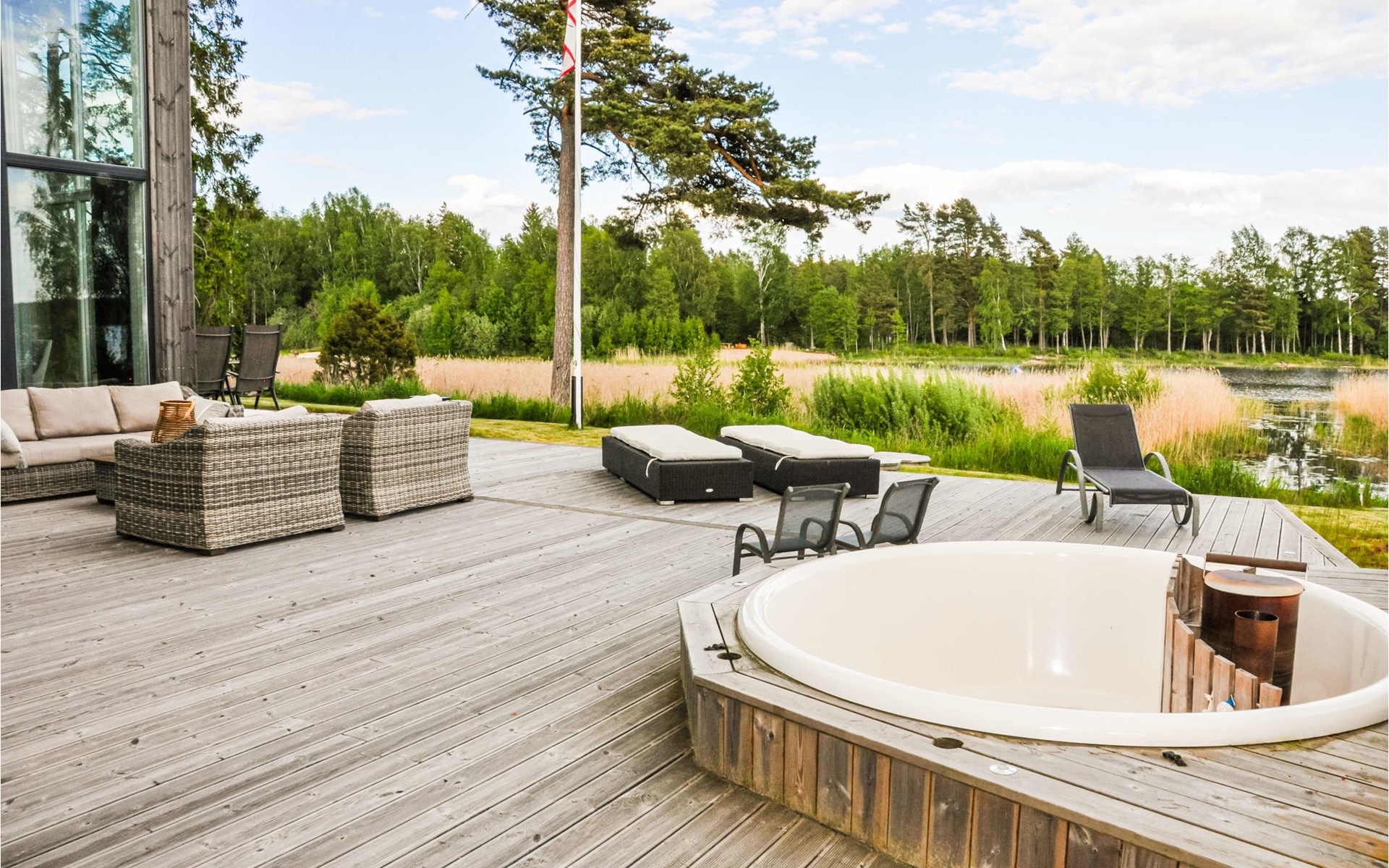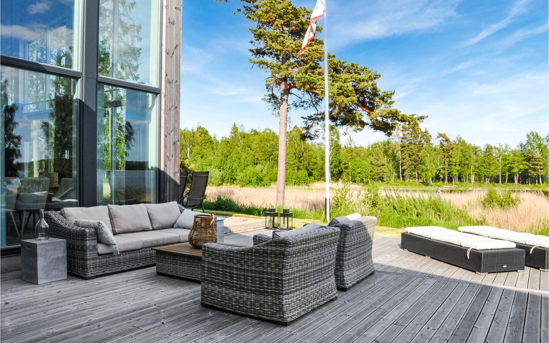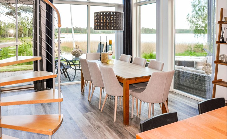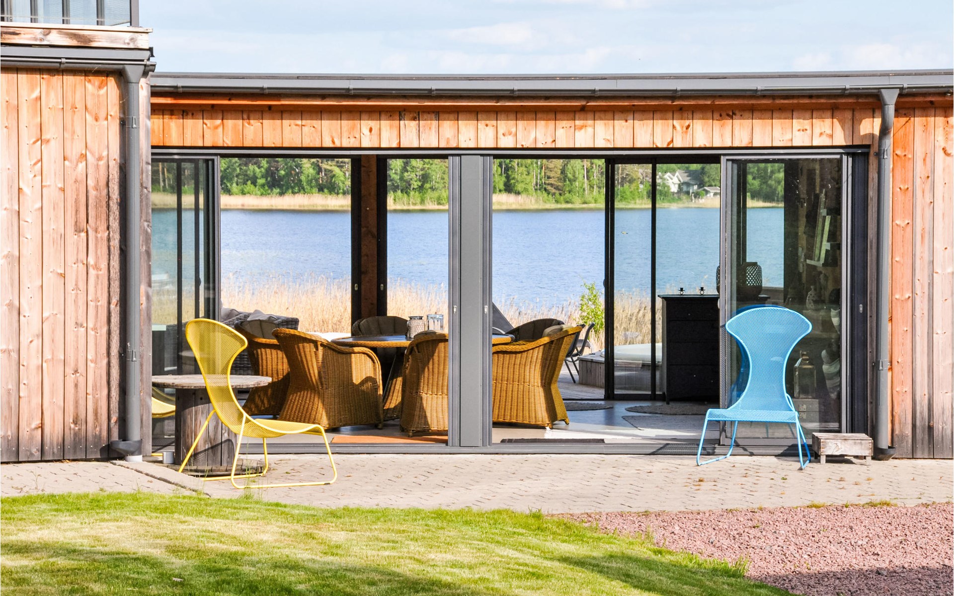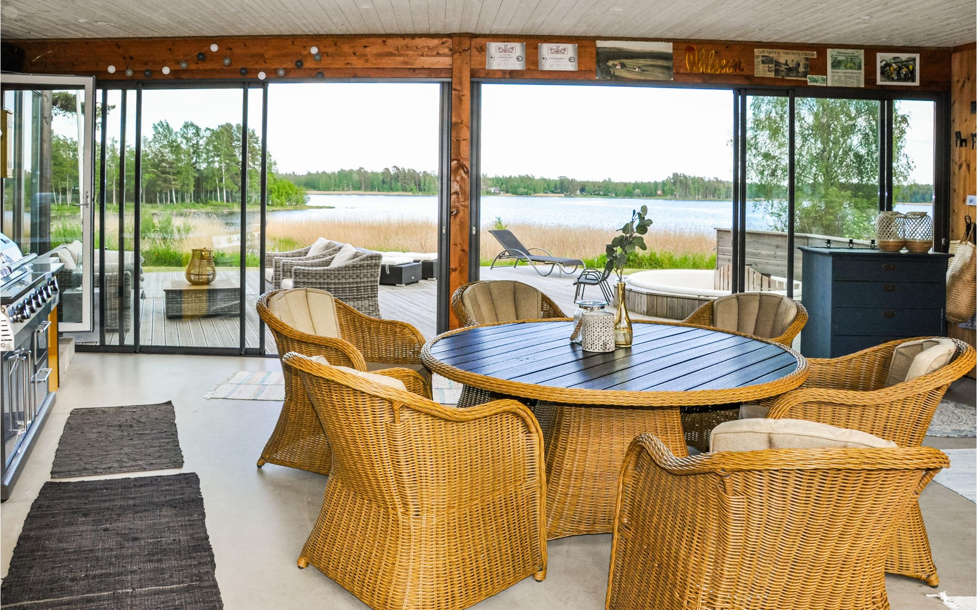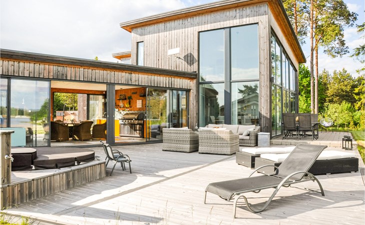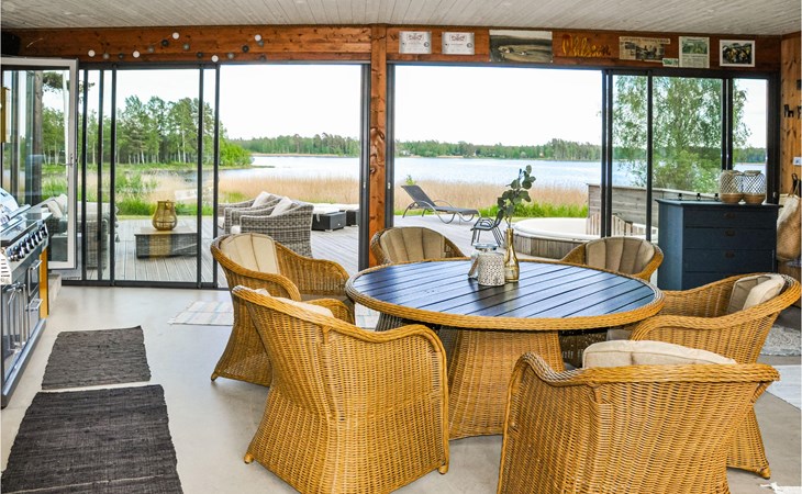 Im Inneren des Hauses erwarten Sie viele gemütliche Bereiche für Geselligkeit und Erholung. Durch die großen Glasflächen fällt viel Licht herein und Sie können den Blick über den Vänernsee schweifen lassen. Das Haus ist sehr modern und die Küche, die komplett ausgestattet ist, lädt zu gemütlichen Abendessen ein. Es gibt 2 Badezimmer mit Dusche und das Haus verfügt über 5 Schlafzimmer mit bequemen Betten. In der Mitte des Hauses befindet sich ein Wintergarten, der mit großen Glasflächen leicht geöffnet/geschlossen werden kann. Es gibt auch eine voll ausgestattete Außenküche.