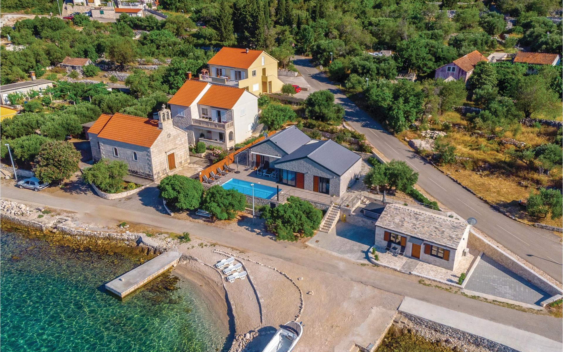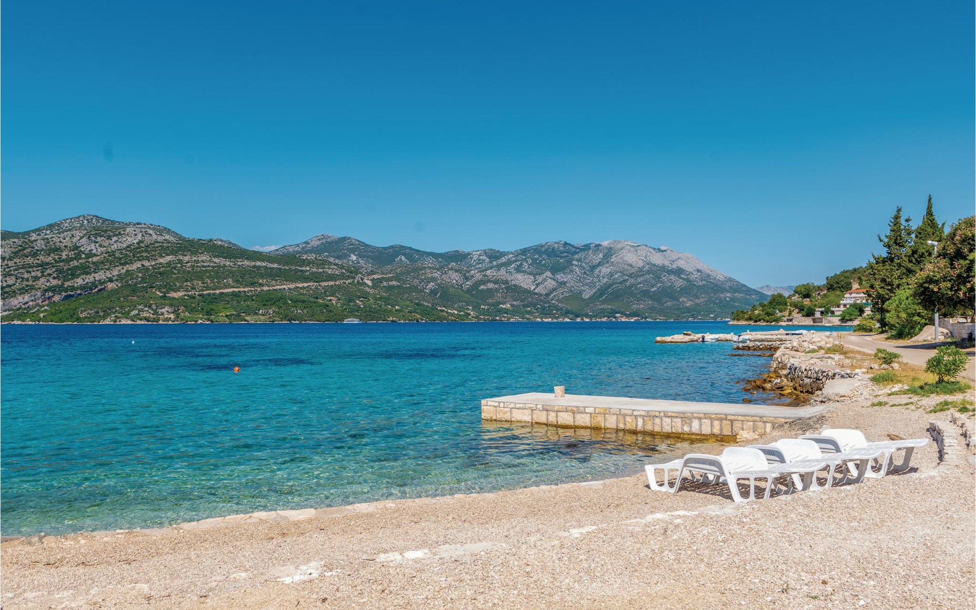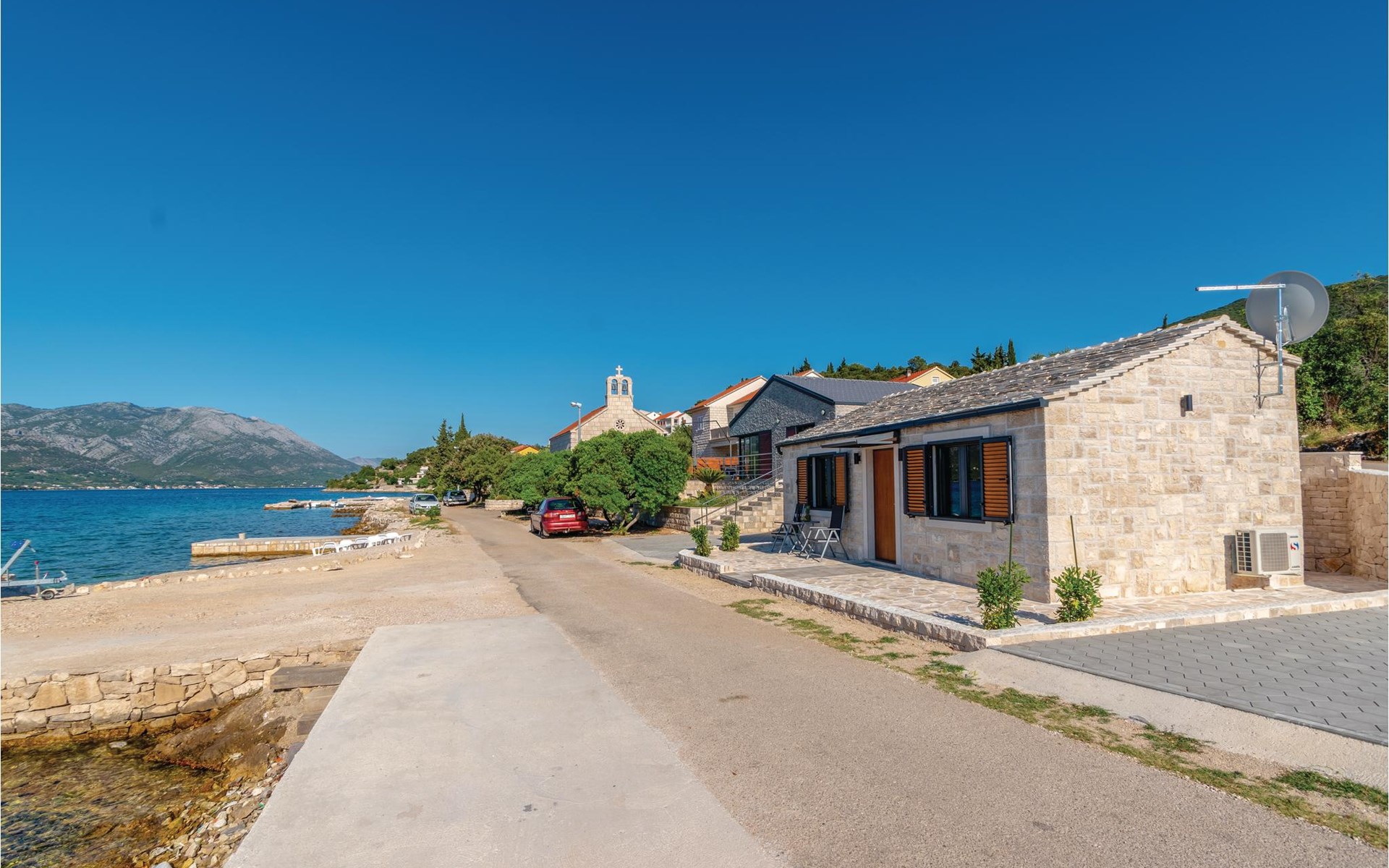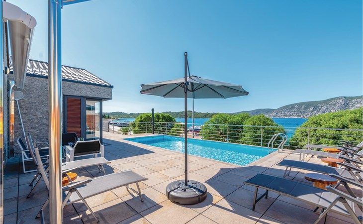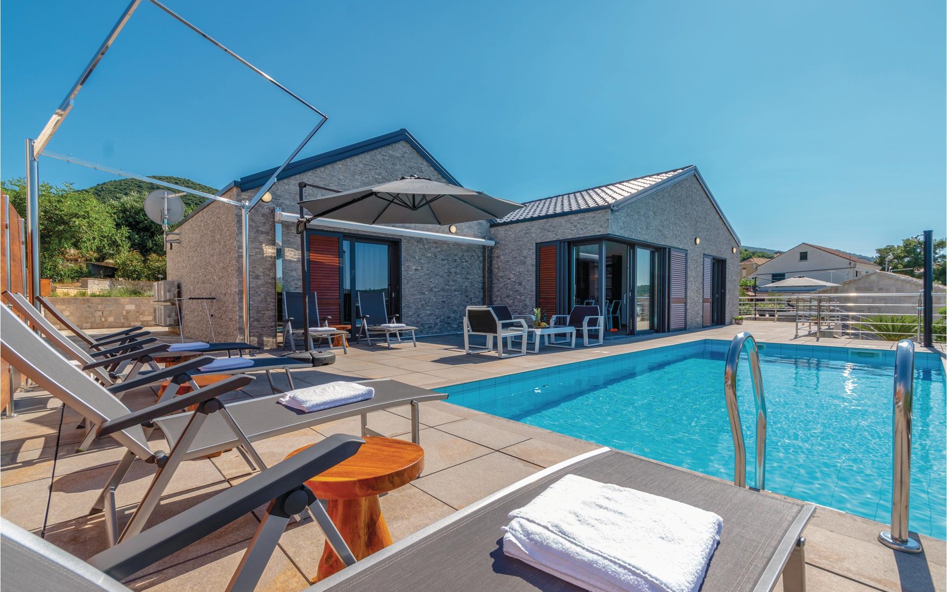 Das wunderschöne Ferienhaus mit Pool liegt fast direkt am Kiesstrand und ist der Traum eines jeden, der einen Sommerurlaub am Mittelmeer verbringen möchte. Terrassen umgeben das geschmackvoll eingerichtete Haus, in dem jedes Schlafzimmer über ein eigenes Badezimmer verfügt. Neben der Terrasse mit großzügigem Pool gibt es auch ein Anbauhäuschen, das als Freizeitraum fungiert, in dem ein Billardtisch und Videospielkonsole stehen. Gleich daneben ist der Whirlpool für fünf Personen. Hinter dem Haus befindet sich der Grillplatz, auf dem Sie Ihre Lieblingsspeisen zubereiten können. In etwa 50 m Entfernung gibt es ein Fischrestaurant. Empfehlenswert ist ein Besuch der Stadt Korčula, wo sich das Geburtshaus des Abenteurers Marco Polo befindet. Kosten Sie die ausgezeichneten lokalen Weine wie Pošipa und Dingača oder unternehmen Sie Bootsausflüge zu den umliegenden Inseln.
