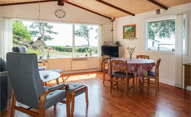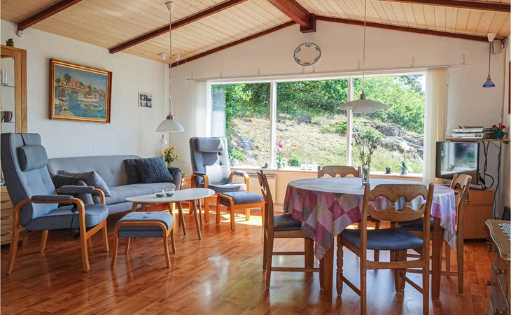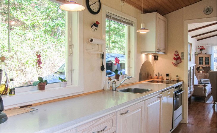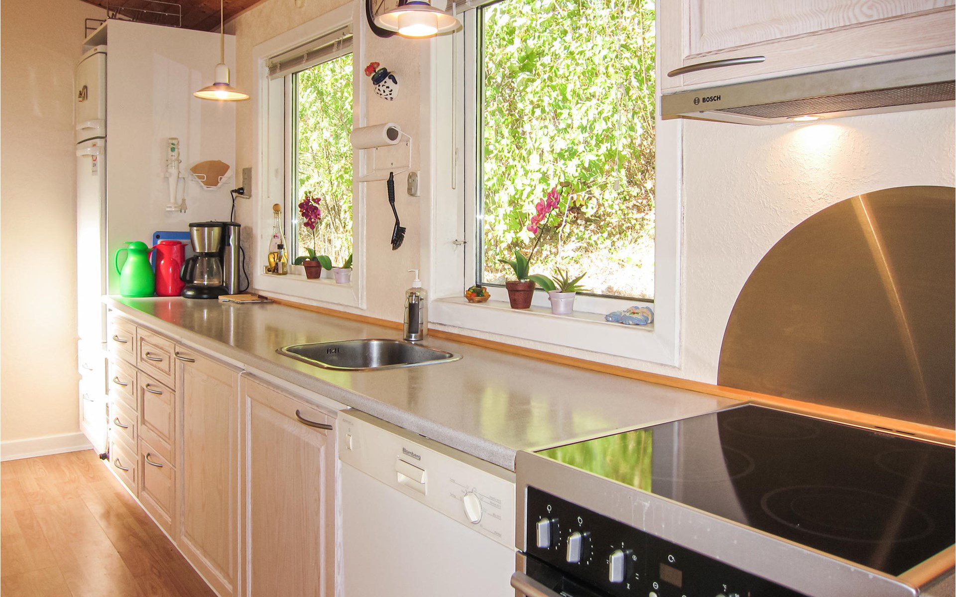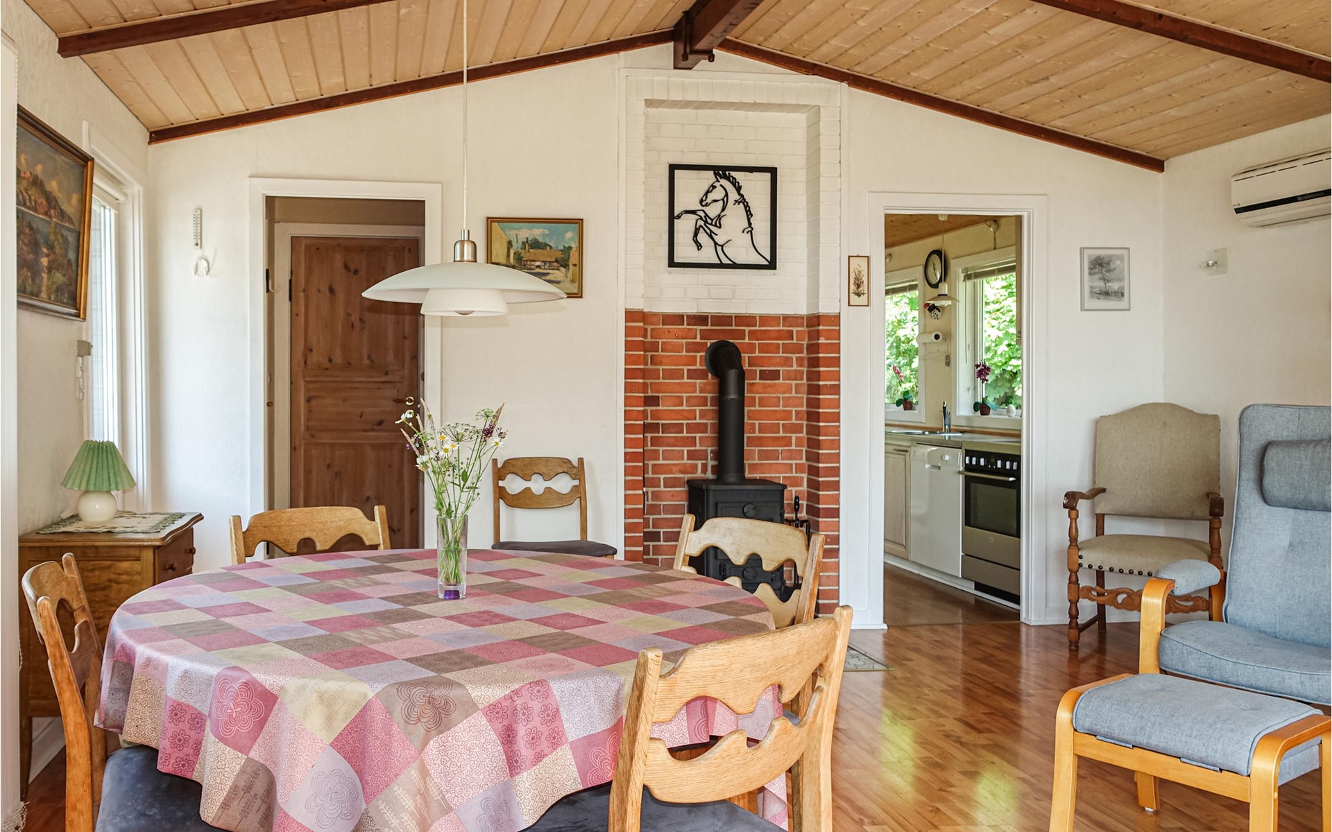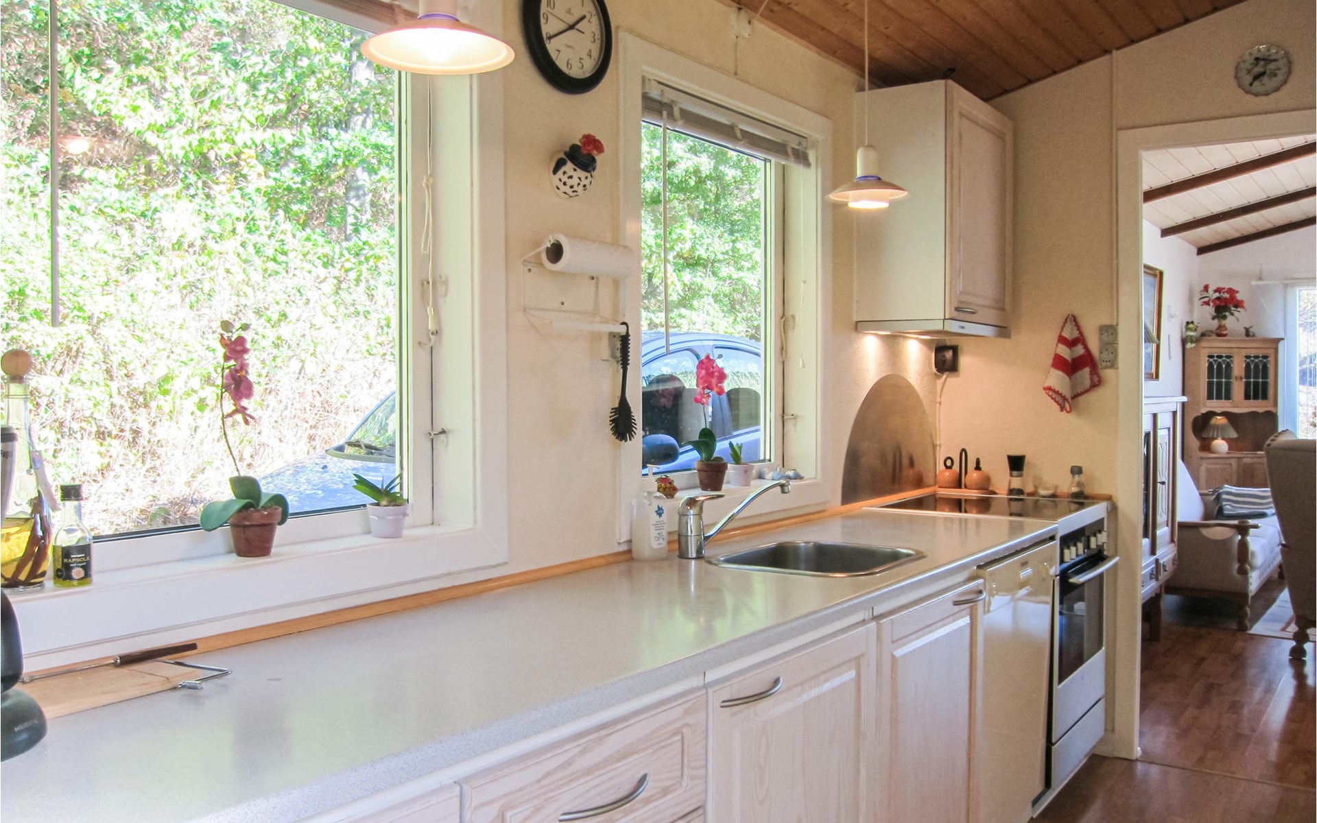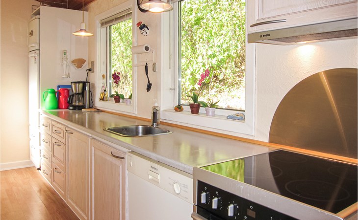 Das Haus ist bestens mit zwei Schlafzimmern ausgestattet - beachten Sie, dass das kleinere Zimmer nur für Kinder geeignet ist. Im Wohnzimmer herrscht eine warme und gemütliche Atmosphäre, erzeugt auch durch viele schöne Elementen in Boden, Decke und dem gemauerten Holzofenbereich. In der Küche haben Sie mehr als genug Platz zum Kochen.