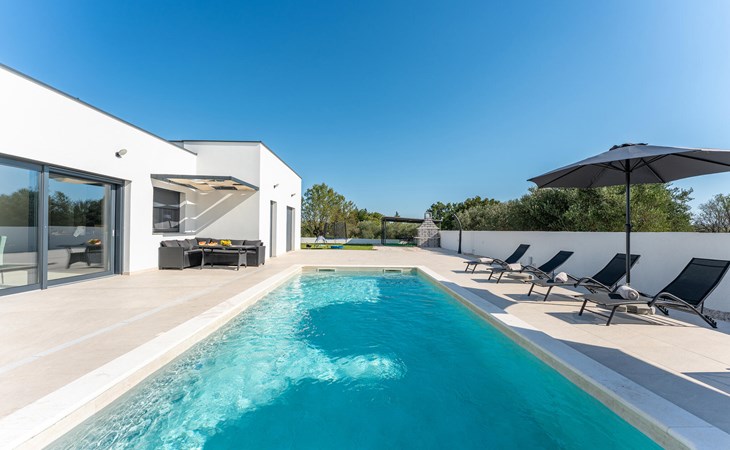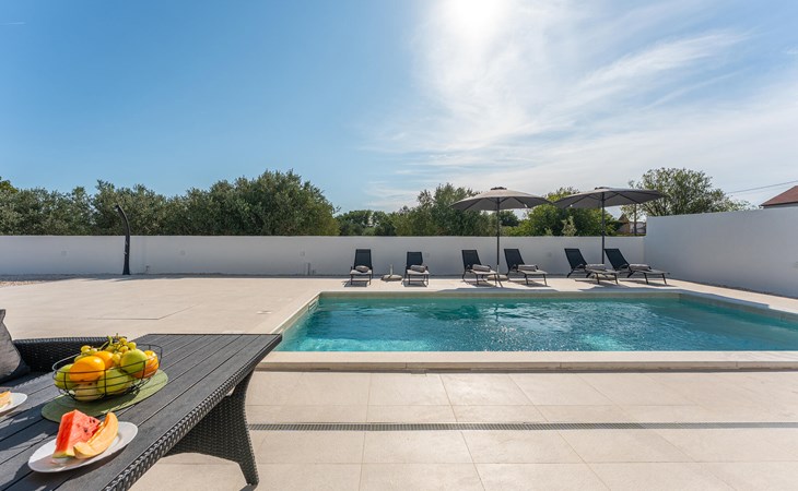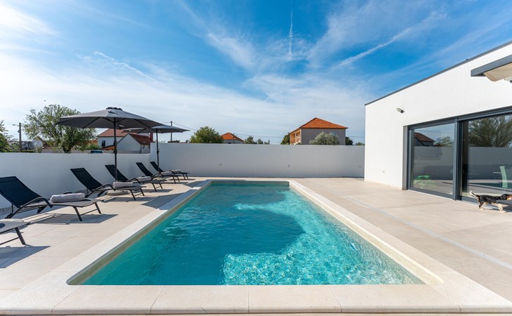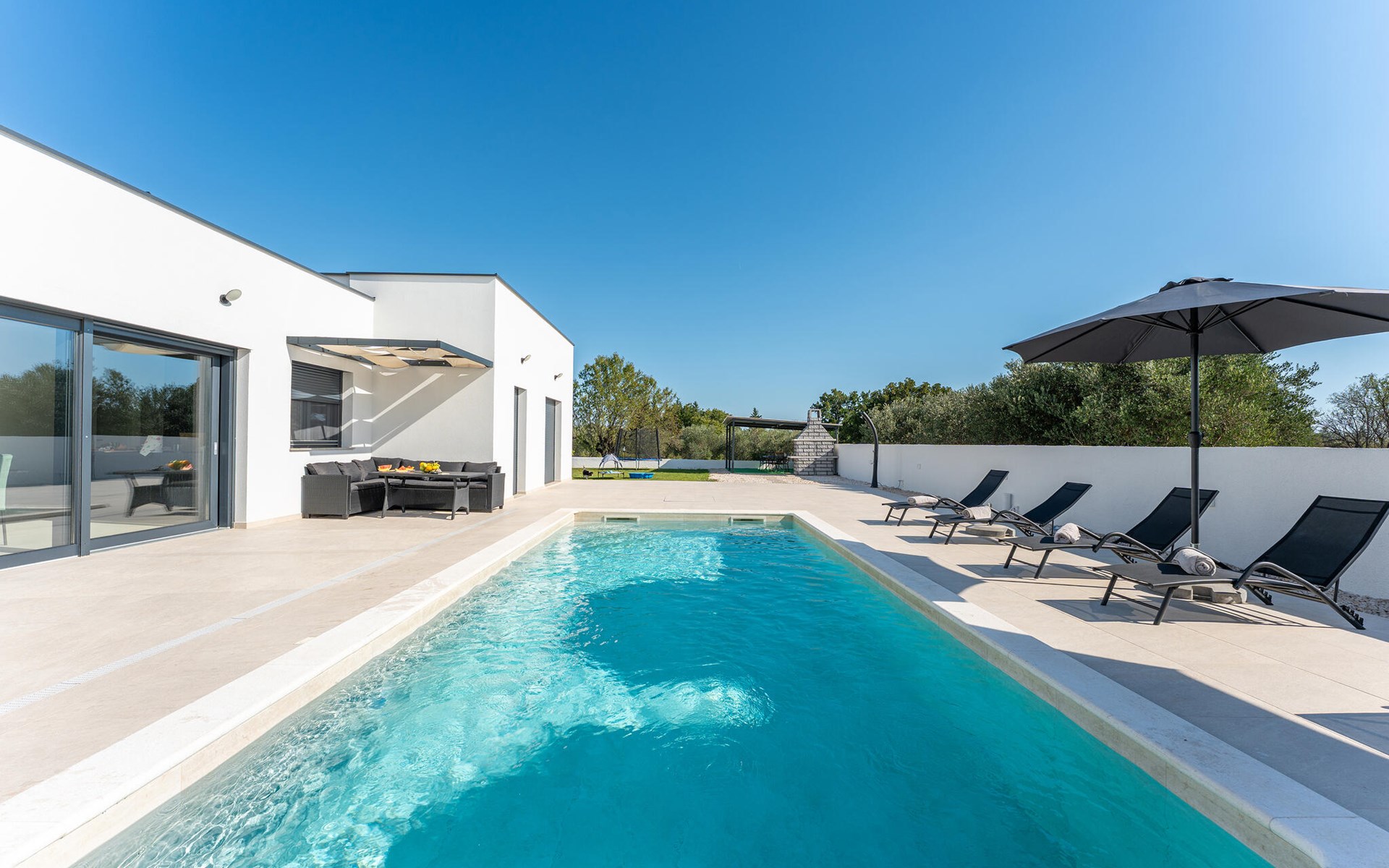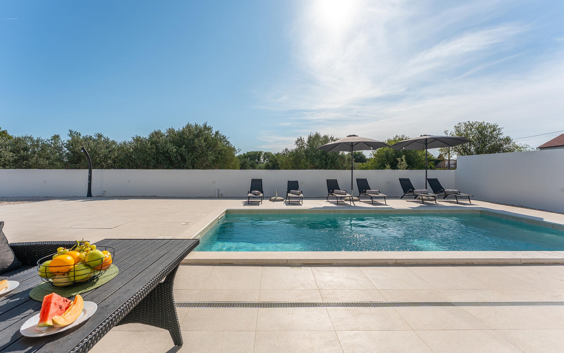 Draußen erwartet Sie ein herrlicher Pool, in dem Sie sich nach Lust und Laune erfrischen können. Lassen Sie auf der Liege die Seele baumeln, versammeln Sie sich für ein Glas Wein in der Outdoor-Lounge und zelebrieren Sie die lauen, mediterranen Sommernächte mit stimmungsvollen Grillabenden.