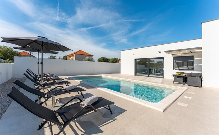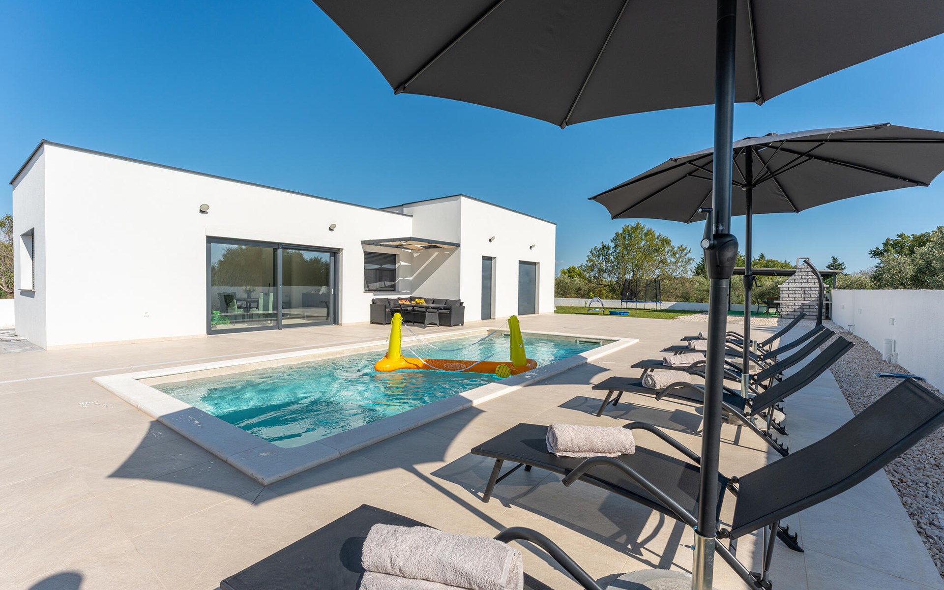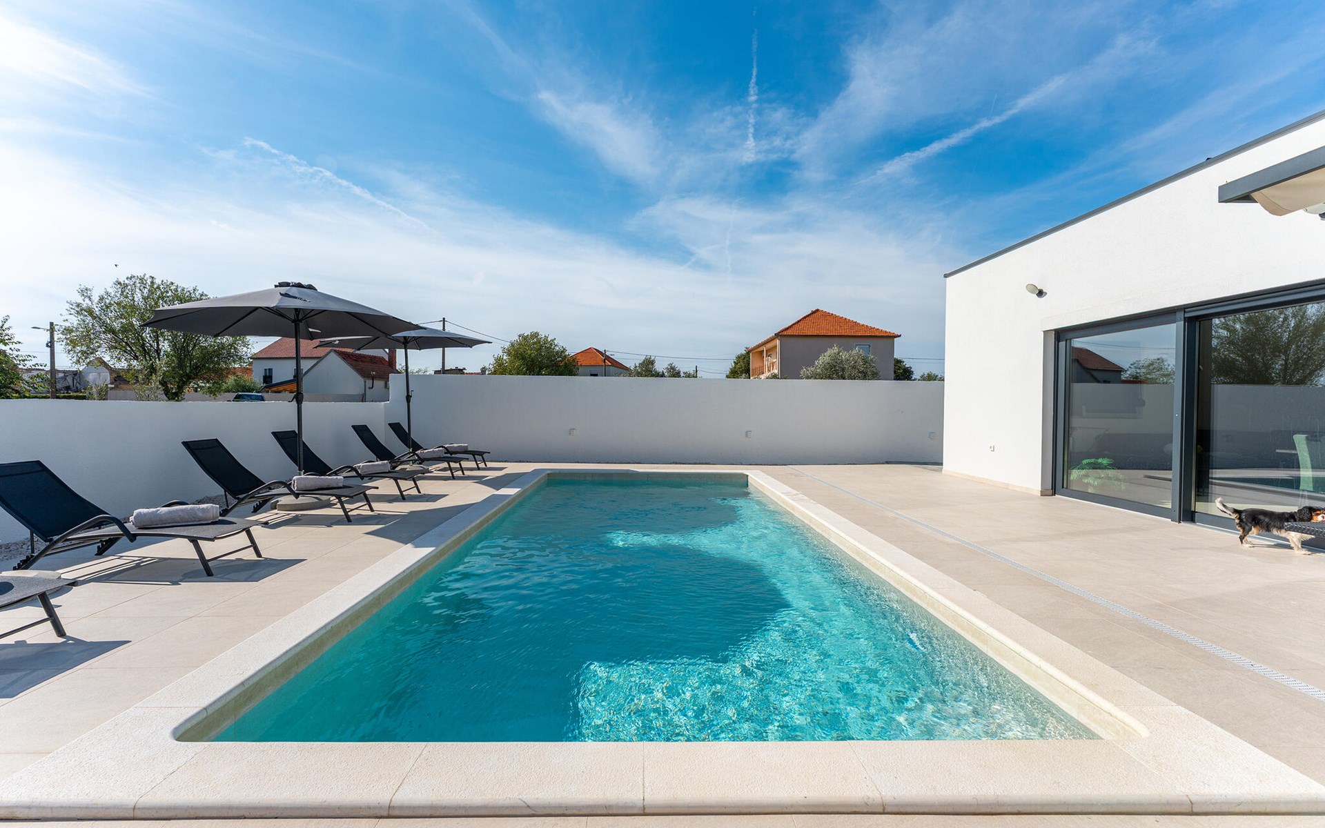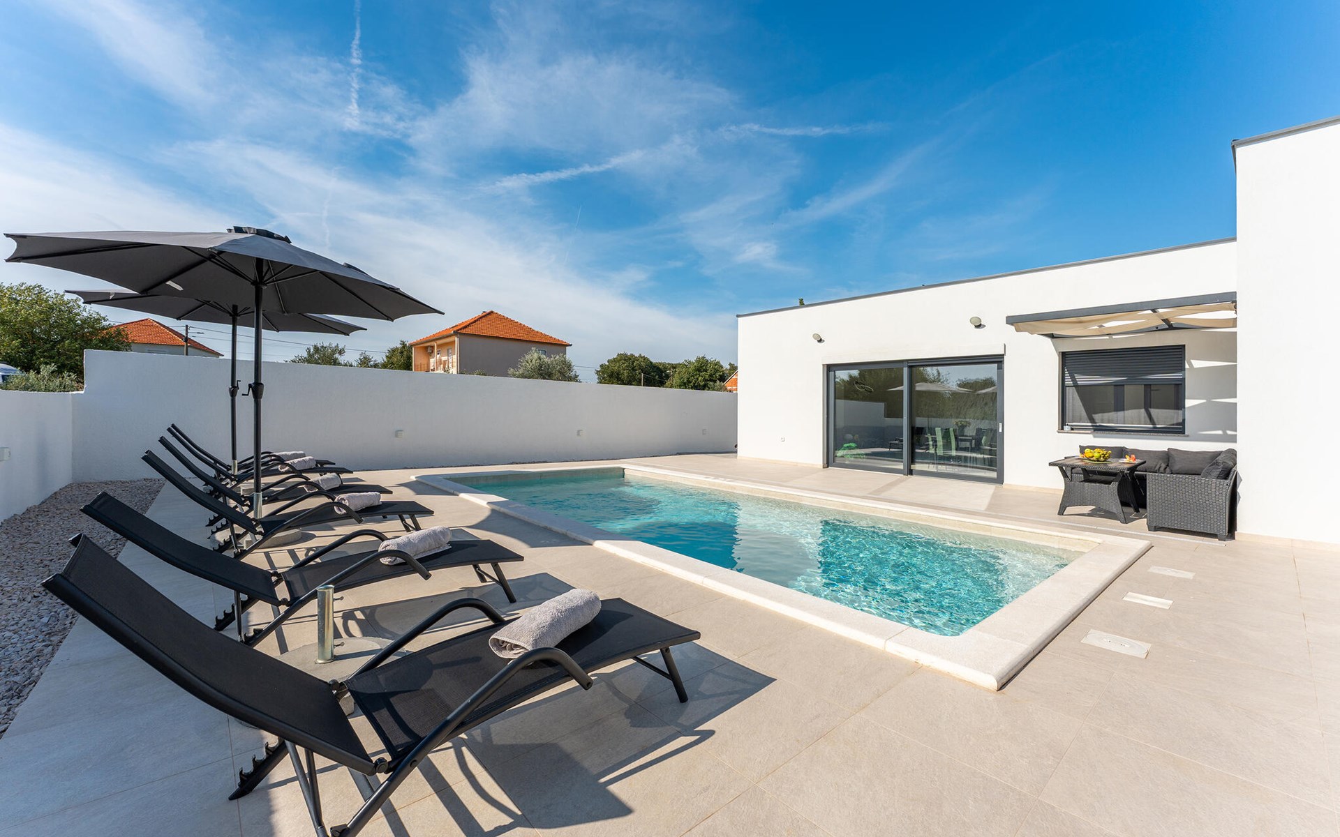 Draußen erwartet Sie ein herrlicher Pool, in dem Sie sich nach Lust und Laune erfrischen können. Lassen Sie auf der Liege die Seele baumeln, versammeln Sie sich für ein Glas Wein in der Outdoor-Lounge und zelebrieren Sie die lauen, mediterranen Sommernächte mit stimmungsvollen Grillabenden.