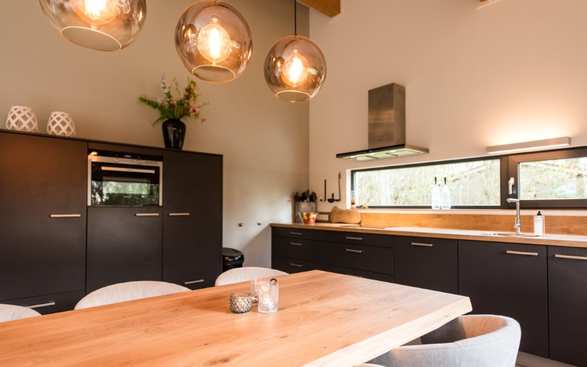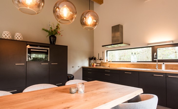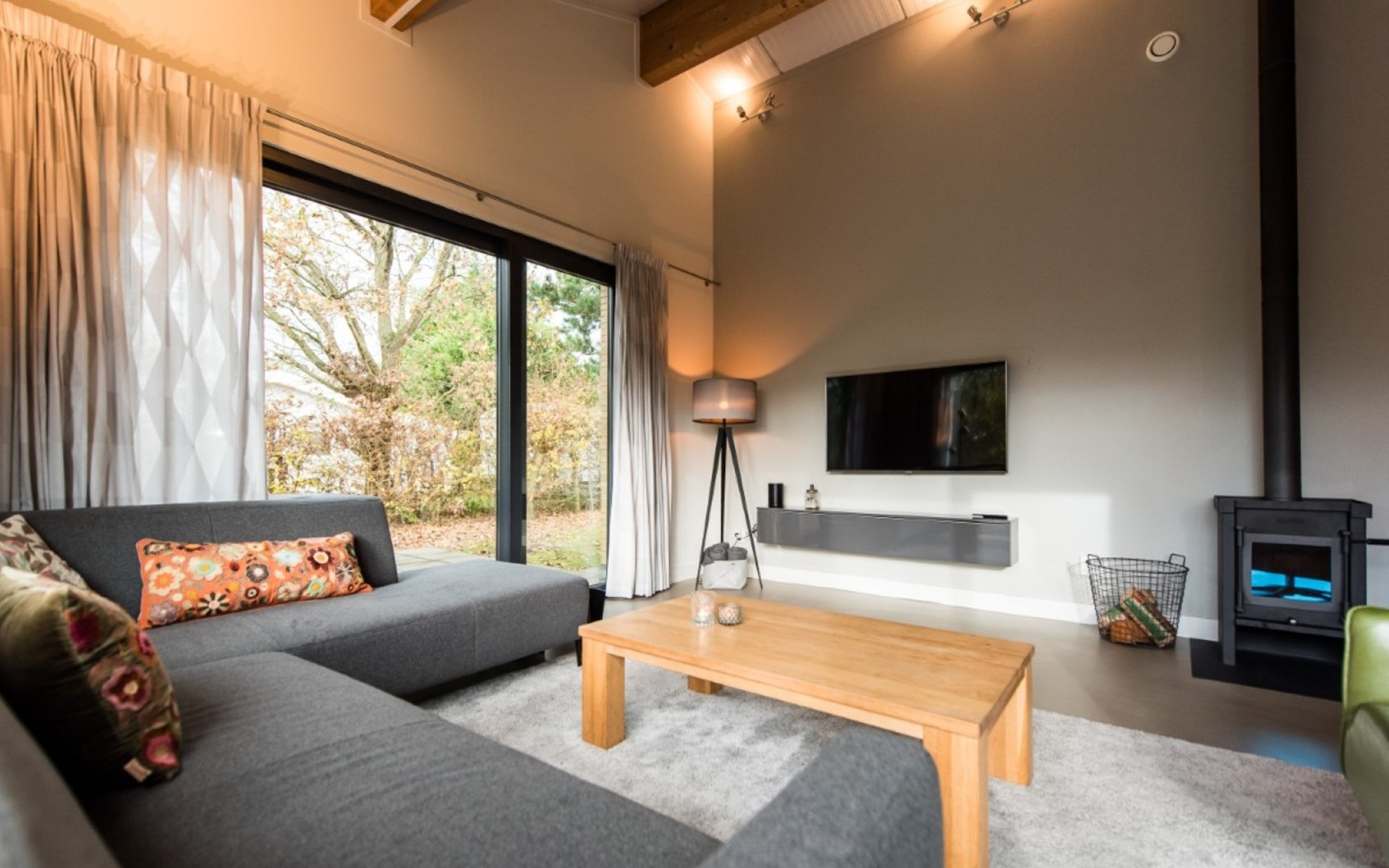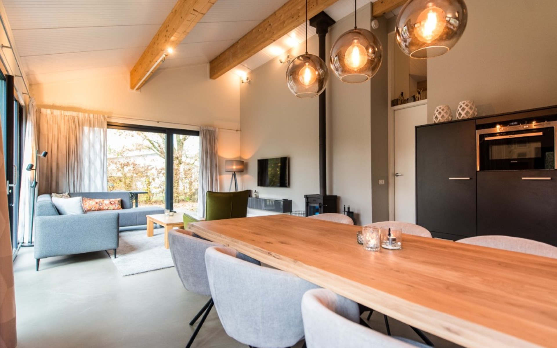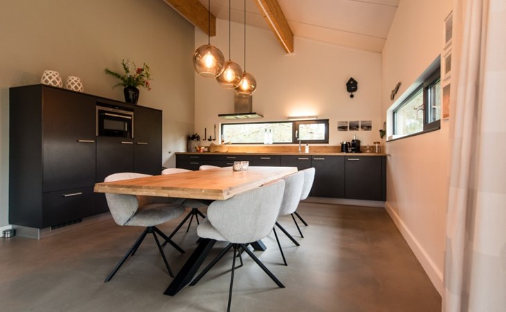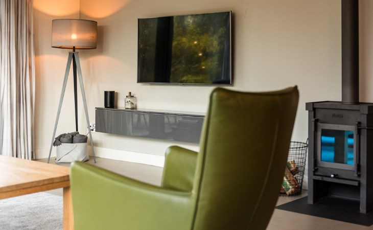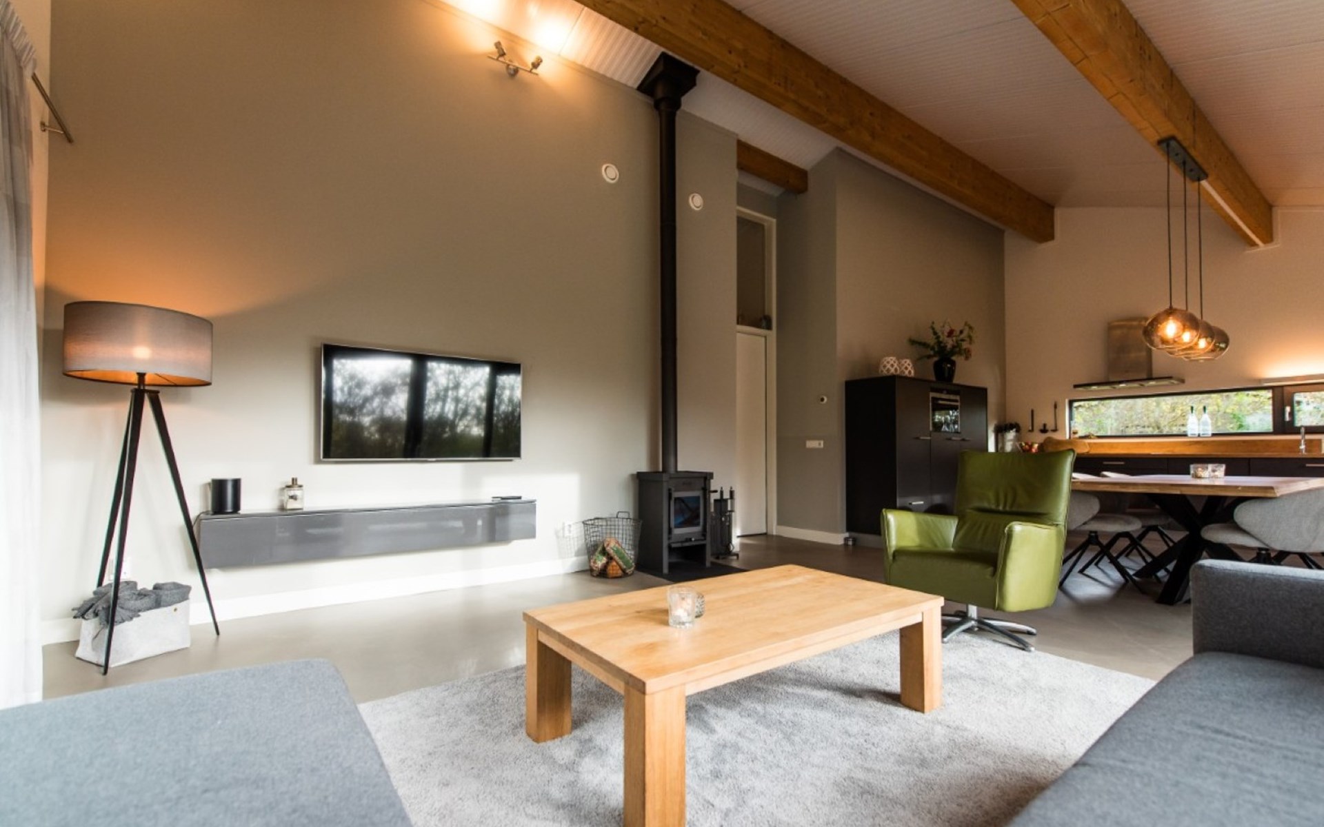 Wohnzimmer mit Sitzecke, Flachbildschirm und Holzofen. Offene Küche mit großem Esstisch, bequemen Stühlen, Geschirrspüler und Kombibackofen. Durch die Schiebetür gelangen Sie auf die nach Süden ausgerichtete Terrasse mit Lounge-Sofa und Tisch mit Stühlen.
