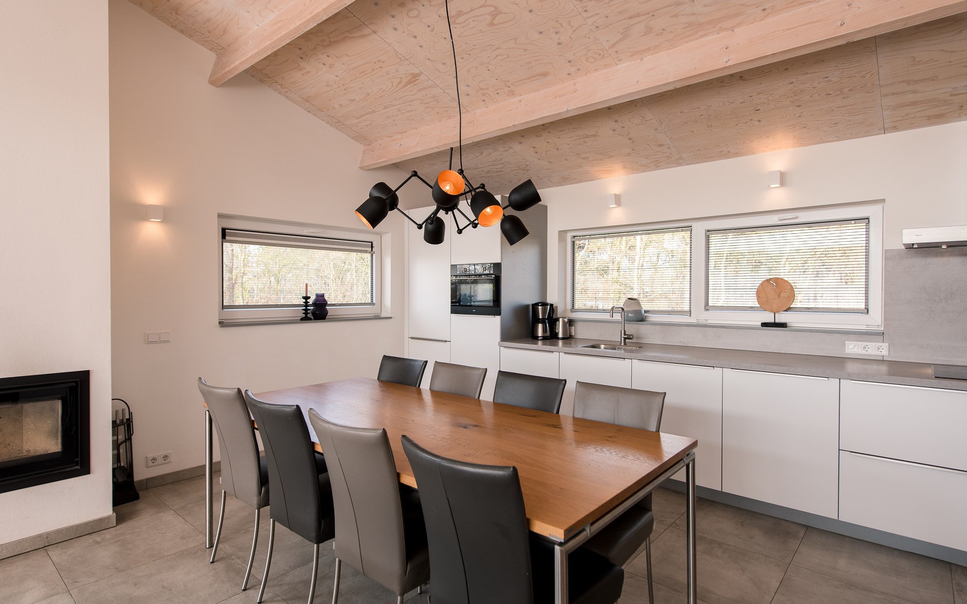 Dieses Ferienhaus verfügt über einen Eingang mit Garderobe und Gäste-WC. Das wunderbar helle Wohnzimmer im Erdgeschoss verfügt über ein Ecksofa, einen Flachbildschirm und einen Holzkamin. Die Moderne offene Küche hat ein großen Esstisch für 8 Personen. Die Küche ist mit allem Komfort ausgestattet wie Induktionsherd, Kombi-Ofen und großem Kühlschrank mit separatem Gefrierfach.