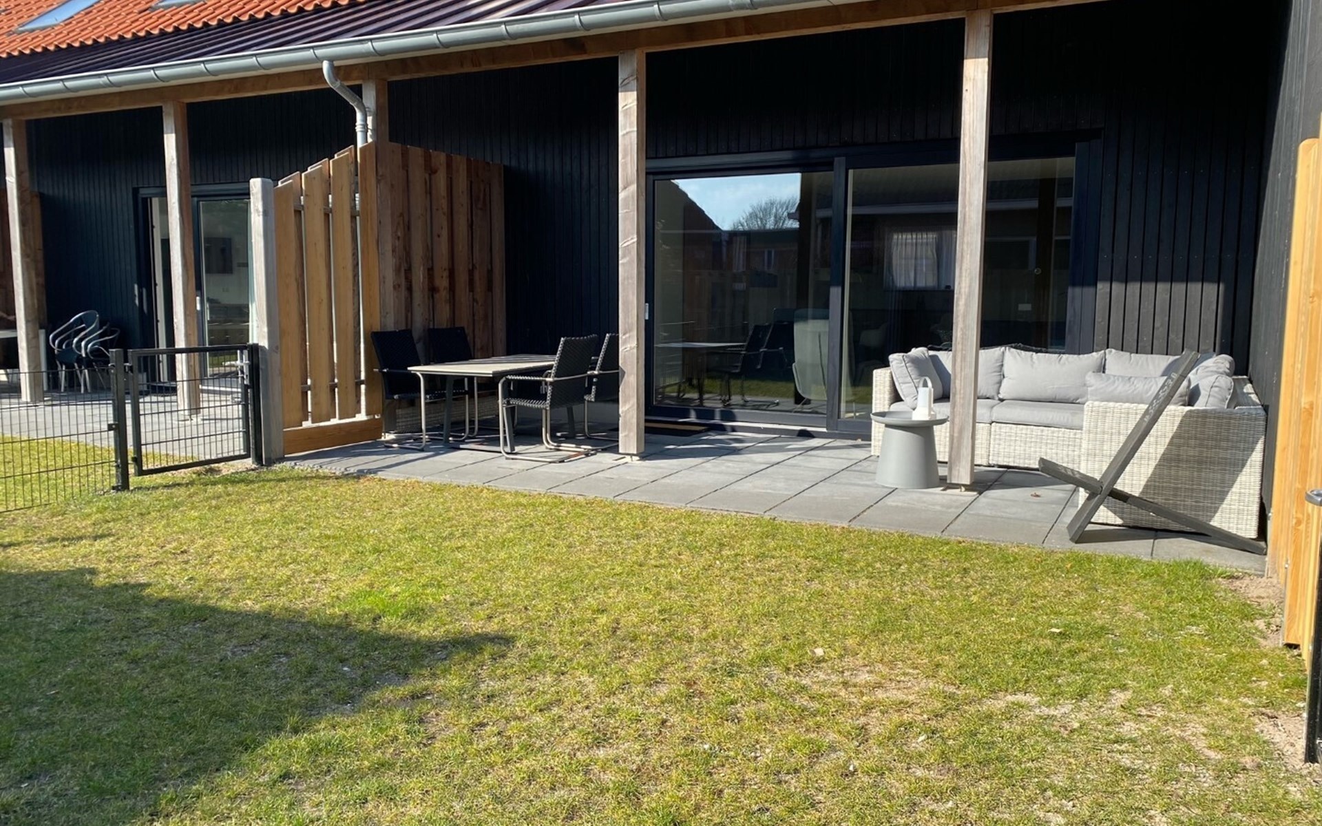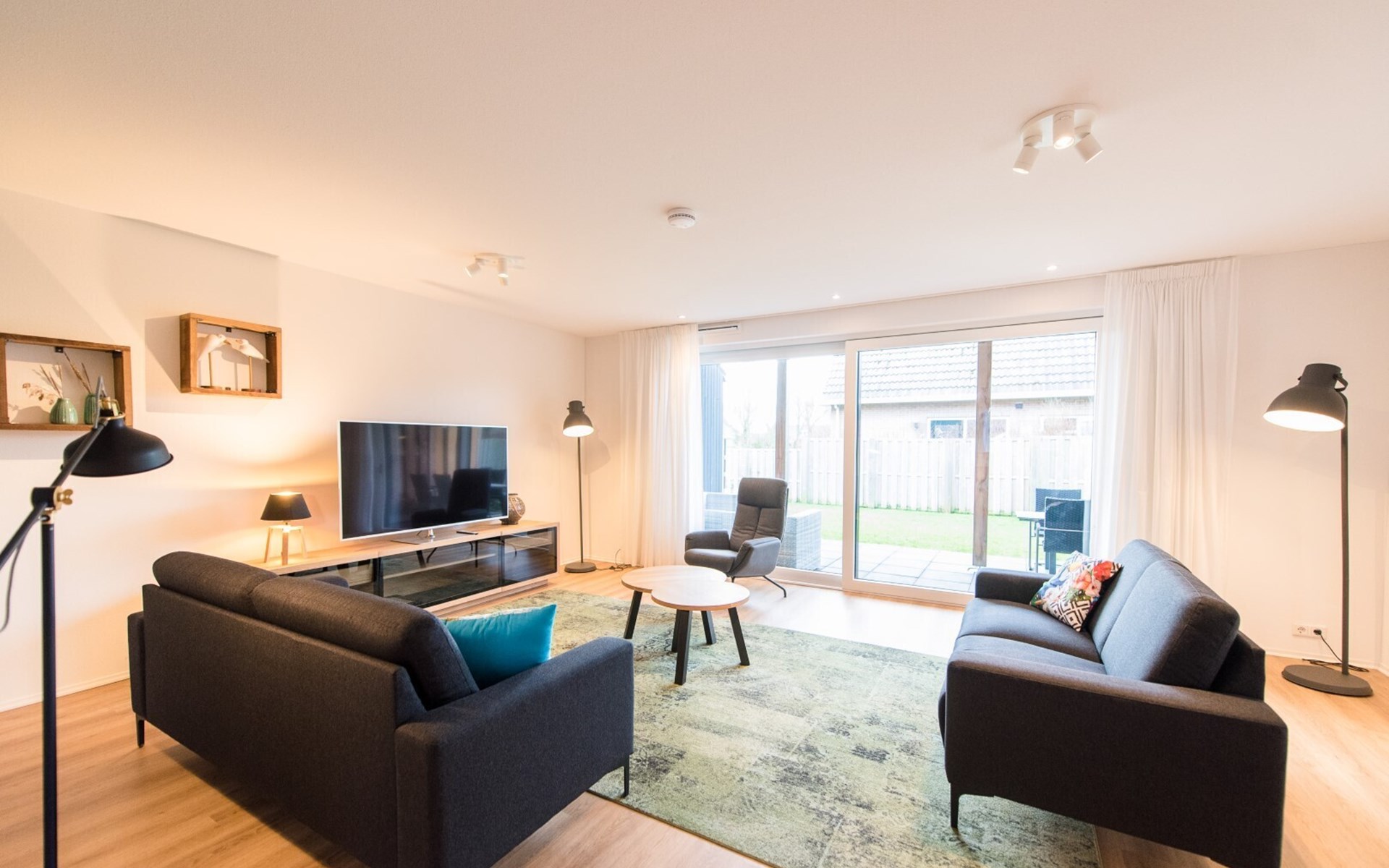 Durch das Wohnzimmer führen Türen zur Terrasse mit einem Esstisch für 6 Personen und einem schönen Lounge-Set.