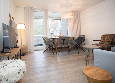 Die Wohnung ist stilvoll, hochwertig und modern eingerichtet. Alle Zimmer sind lichtdurchflutet. Ein besonderes Highlight ist das Bad, Ihr persönlicher kleiner Wellnessbereich mit Sauna, Whirlpool und Dampfbad mit integrierter Doppelregendusche. Das Wohlfühlprogramm setzt sich im Wohnbereich fort, denn die flackernden Flammen des Bioethanolkamins tauchen den Raum in ein besonders gemütliches Licht. Das Sofa lässt sich mit wenigen Handgriffen in zwei bequeme Schlafmöglichkeiten umwandeln.