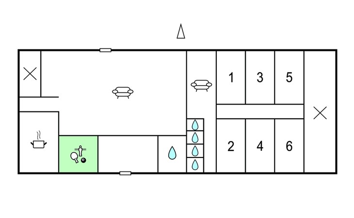 Verbringen Sie auch entspannte Stunden im geschützten Innenhof mit Lounge-Möbeln oder nehmen Sie Platz an den langen Tischen auf der überdachten Terrasse. Genießen Sie die Sonne auf den Liegen oder beobachten Sie die Kinder beim Spielen auf dem großzügigen Gelände mit Rutsche, Trampolin und Platz für Ballspiele. Das große Grundstück wird gemeinsam mit dem Haupthaus genutzt und bietet weite Ausblicke über Felder, Wald und bis zum Langelandsbælt.