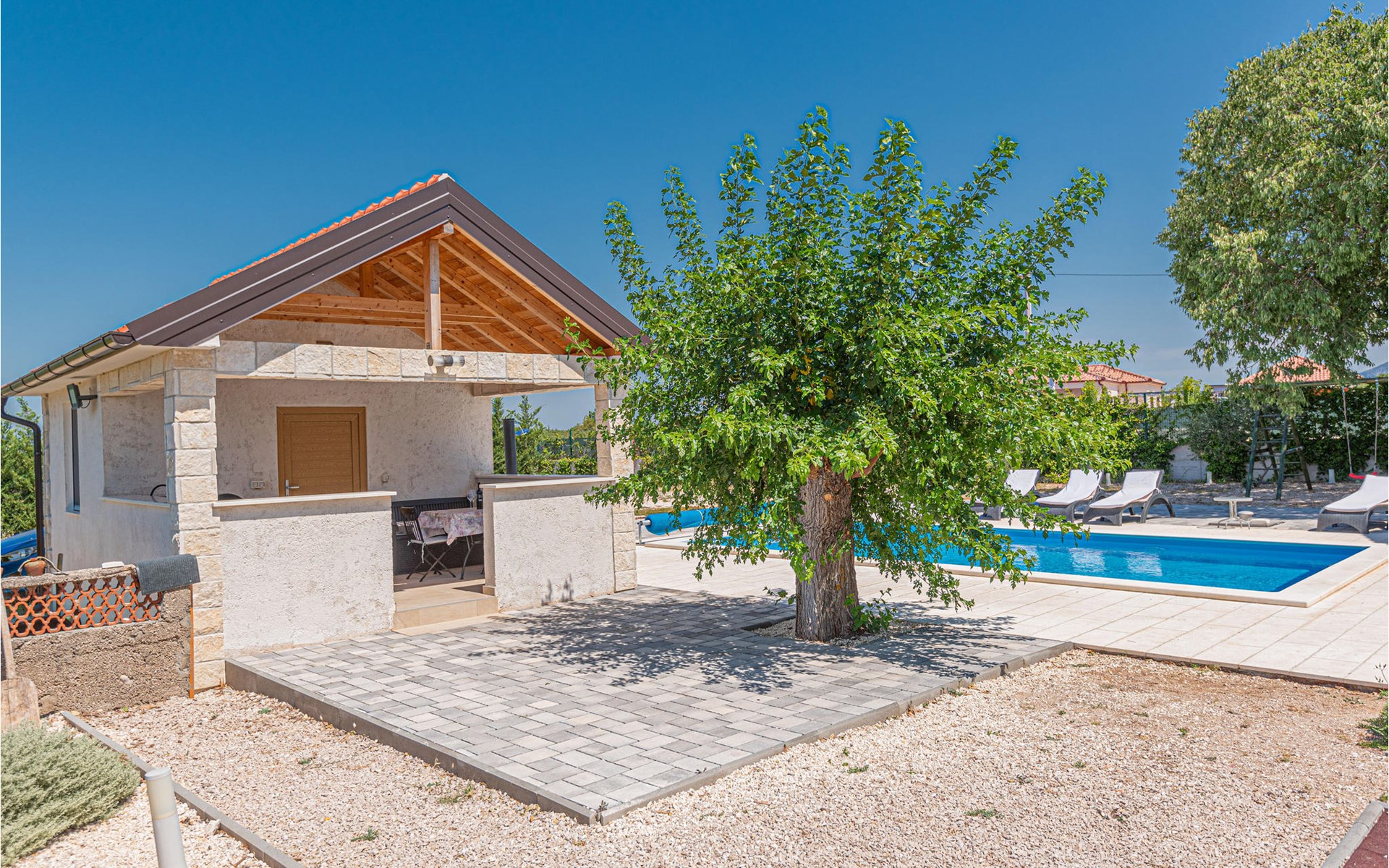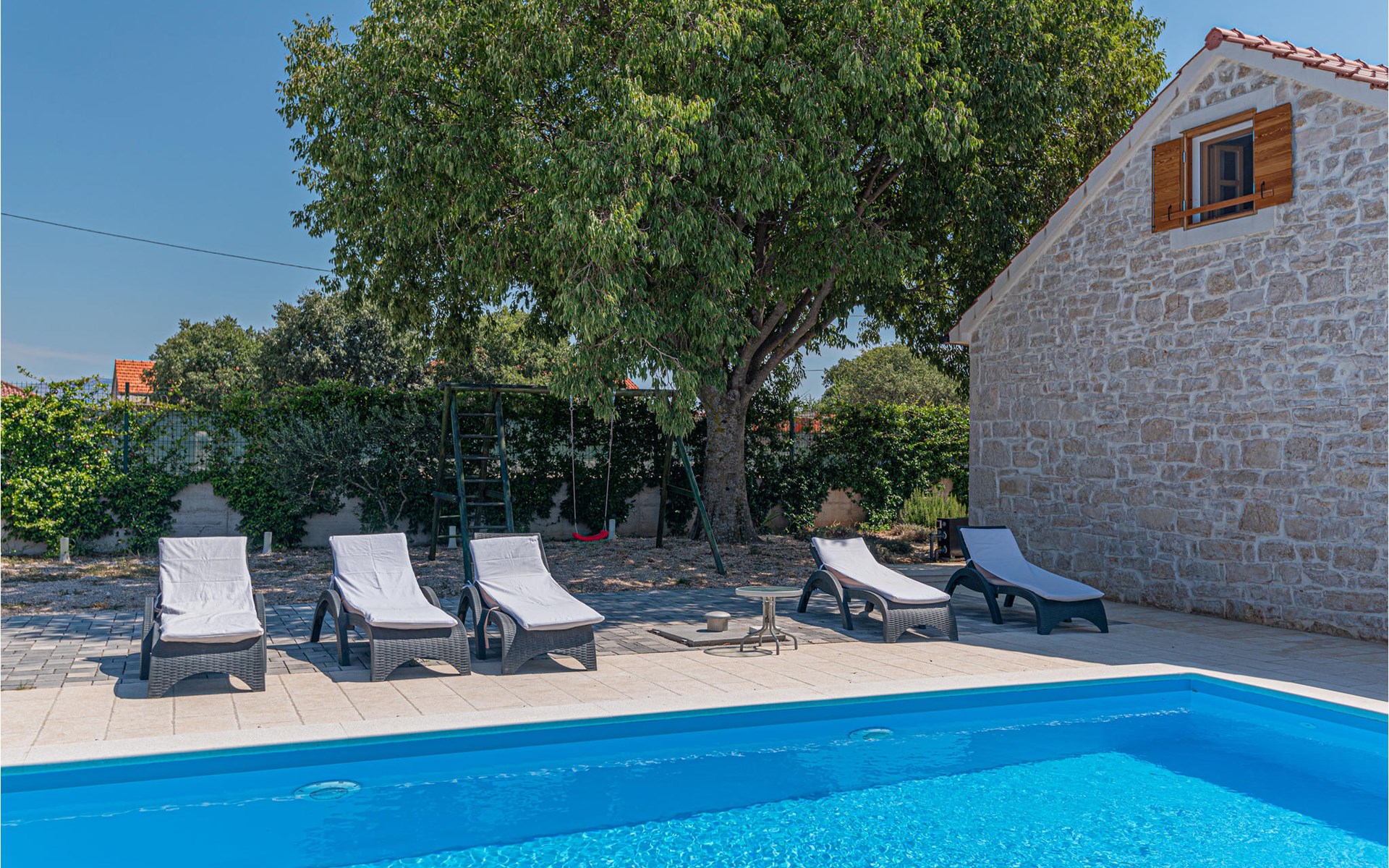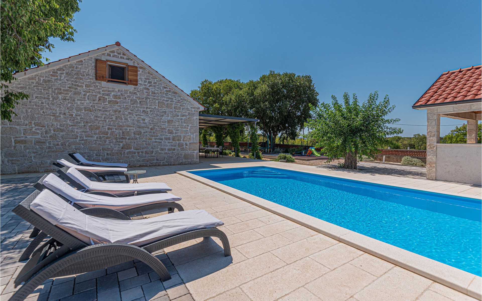 Dieses schöne Ferienhaus mit Pool befindet sich in der kleinen Ortschaft Pakovo Selo, nicht weit von der Stadt Šibenik entfernt. Hier finden Sie Ruhe, fernab von der Alltagshektik. Während der heißen Sommertage erfrischen Sie sich im Pool und die jüngsten Gäste finden noch zusätzliche Unterhaltung auf dem Grundstück. Allen aktiven Urlauber empfehlen wir einen Besuch im Nationalpark Krka, entdecken Sie Archäologische Fundorte sowie verschiedene andere Sehenswürdigkeiten. Besuchen Sie auch das mediterrane Städtchen Skradin sowie die malerischen Orte in der Umgebung. Lernen Sie die Kultur und Geschichte dieser Gegend kennen.
