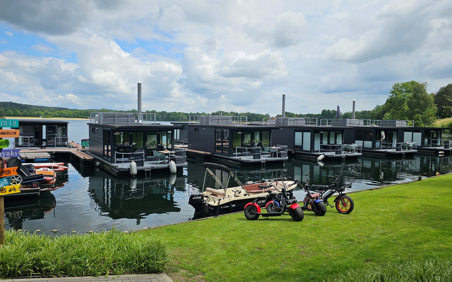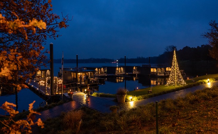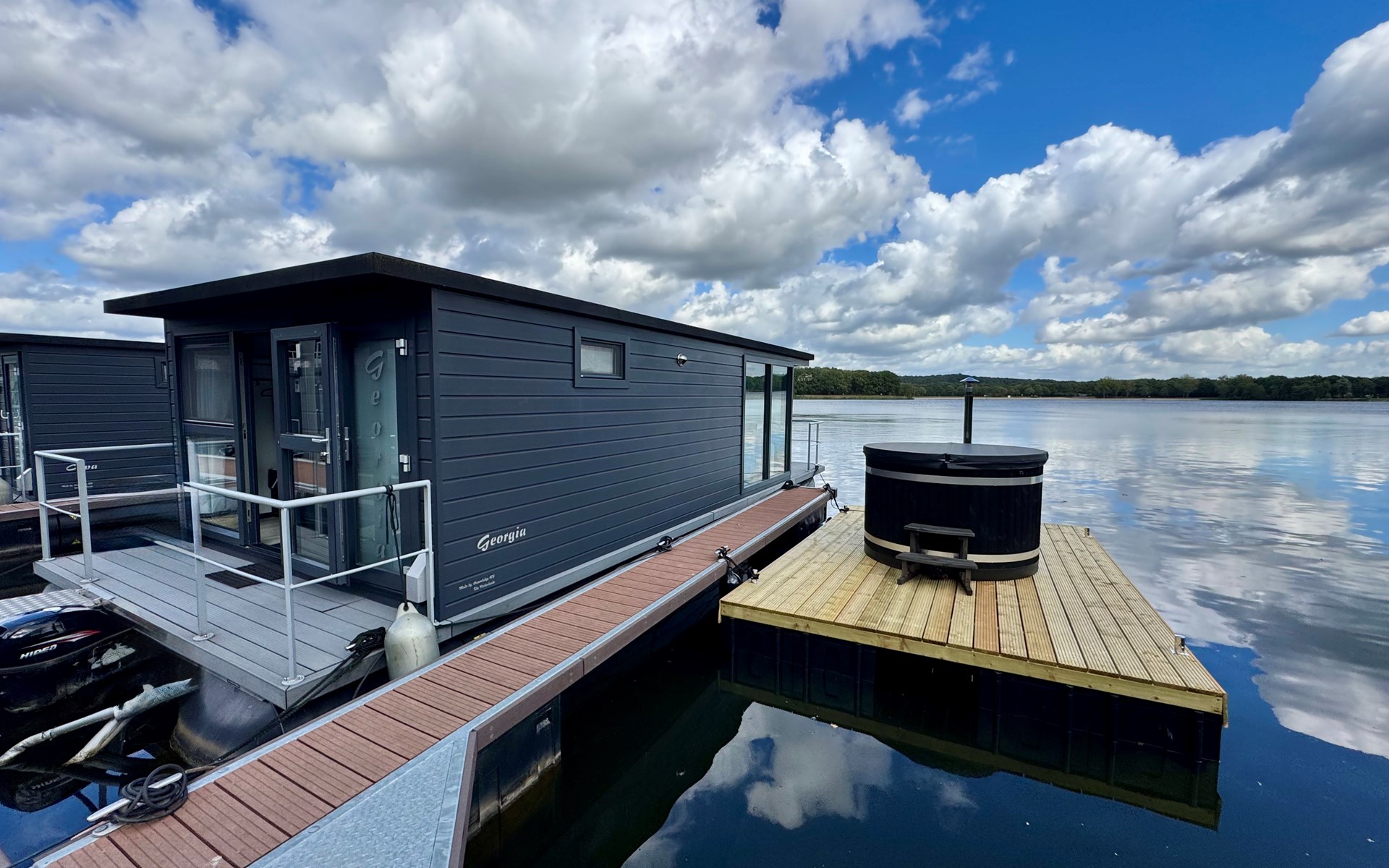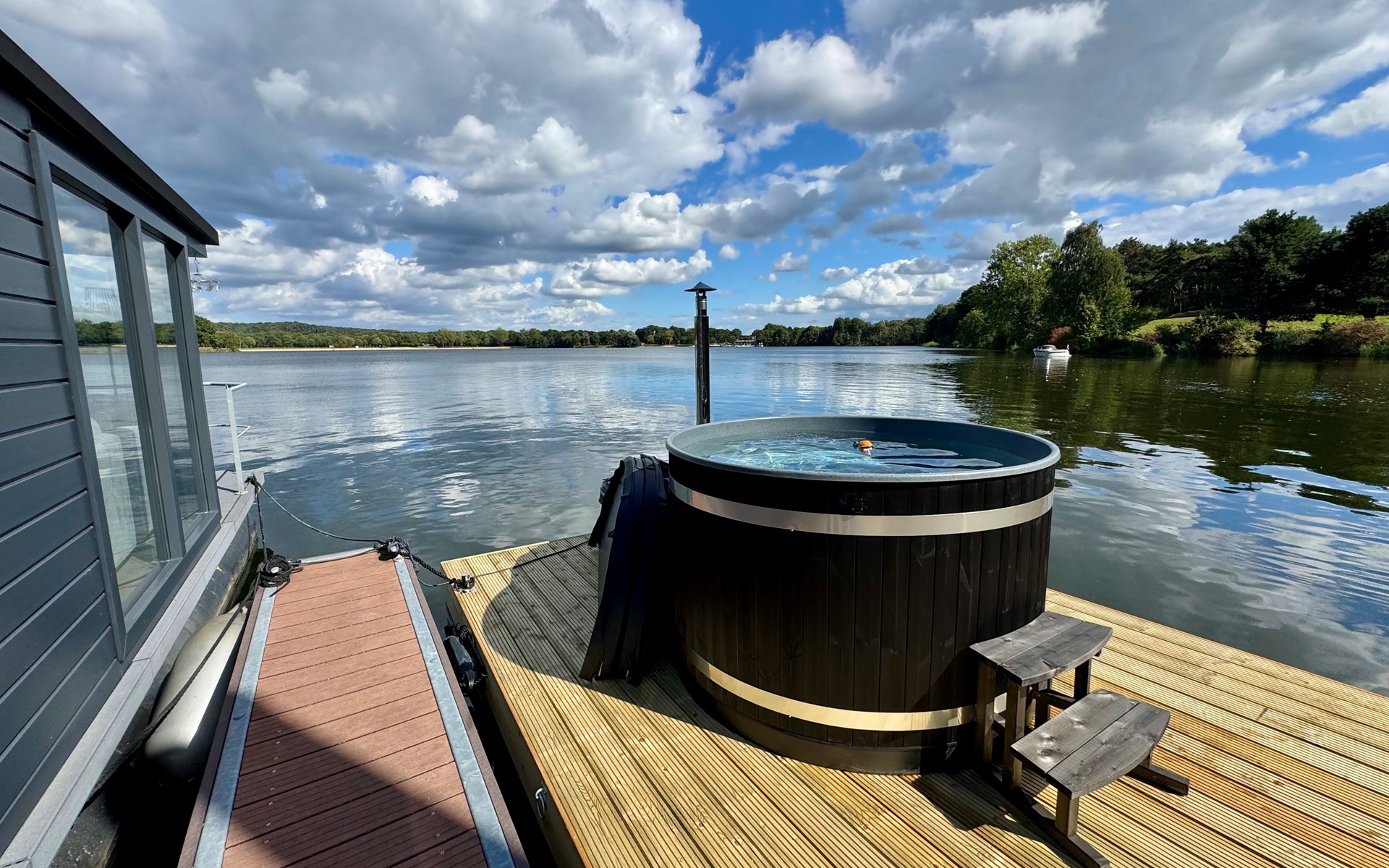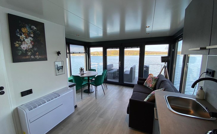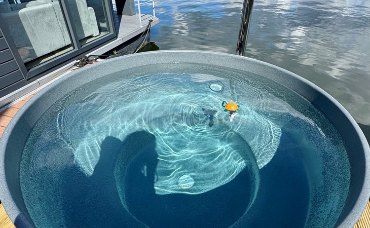 Erleben Sie den Charme eines komfortablen Hausbootes, idyllisch gelegen am malerischen Mookerplas und umgeben von einer waldreichen Landschaft. Das Highlight: der schwimmende Hot Tub auf einem Floß direkt neben dem Hausboot – warm, stimmungsvoll, gefüllt mit natürlichem Wasser und exklusiv für Sie. Ob laue Sommerabende mit Sonnenuntergang oder frische Winterluft – im Hot Tub genießen Sie pure Entspannung mitten in der Natur.