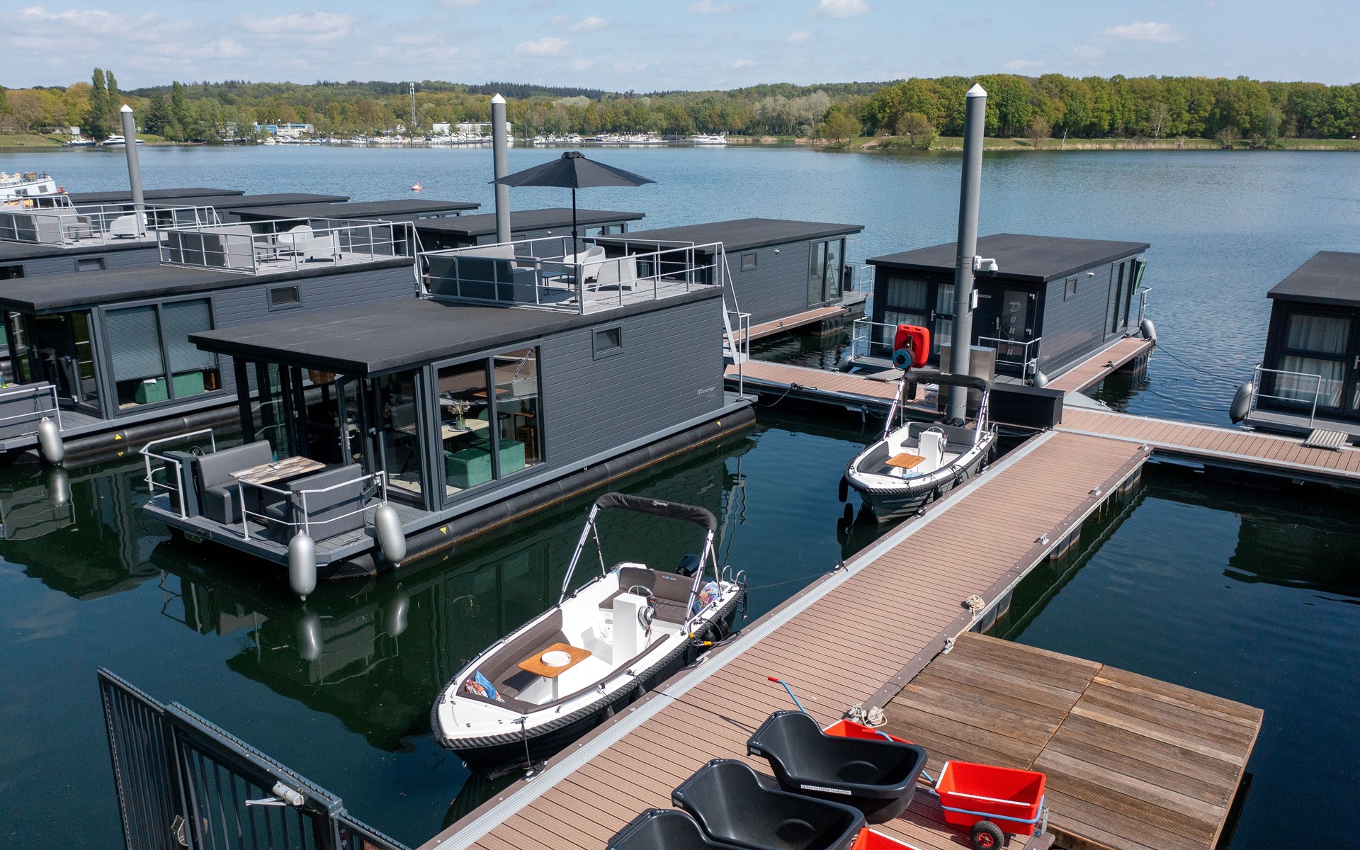 Weitere Ausstattung: Klimaanlage, kostenloses WLAN sowie (gegen geringe Gebühr, April–November) Waschmaschine und Trockner im angrenzenden Jachthafen Driesen. Neben dem Hausboot gibt es Platz für ein eigenes Boot (max. 2,5 x 5 m). Parkplätze befinden sich auf einem nahegelegenen Gelände (ca. 5 Gehminuten), Gepäckwagen stehen im Hafen bereit.