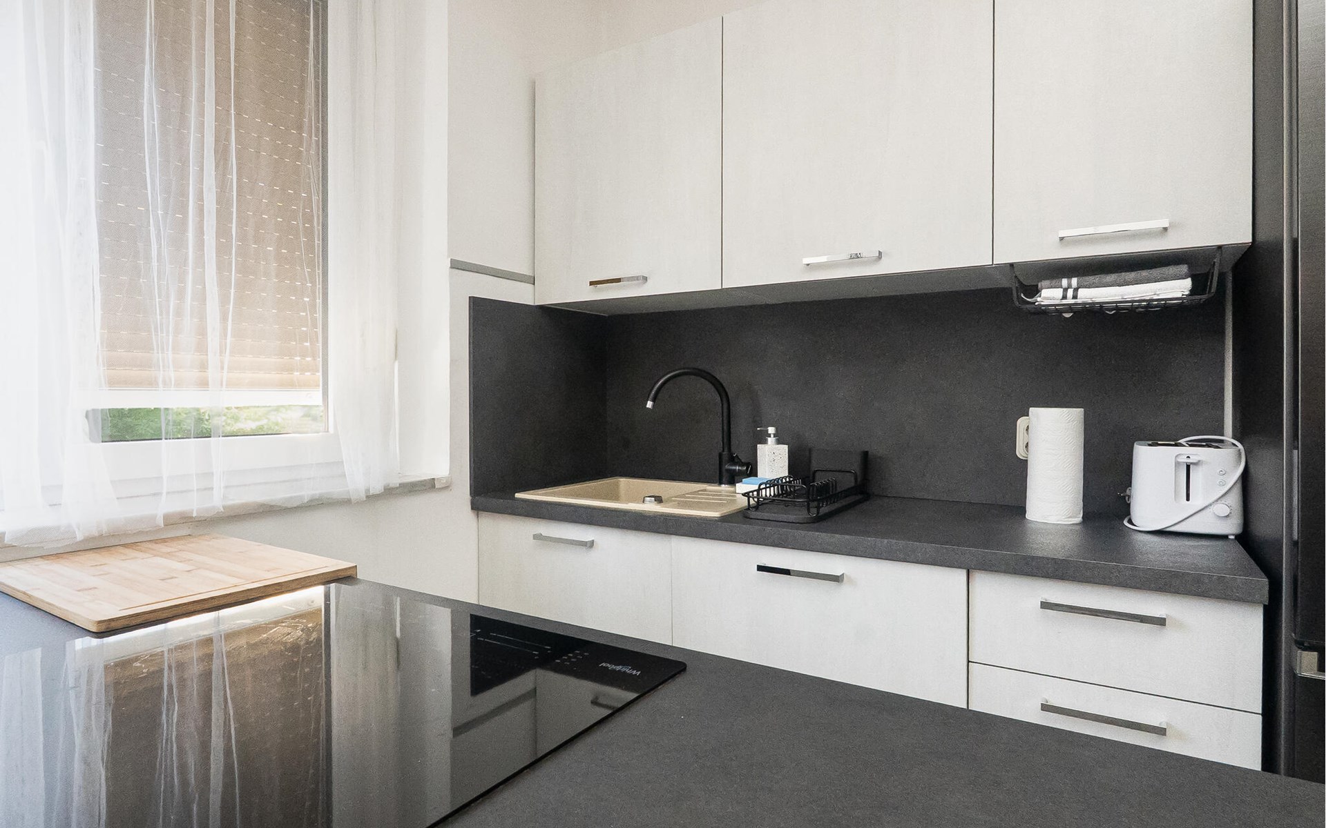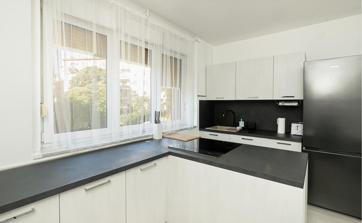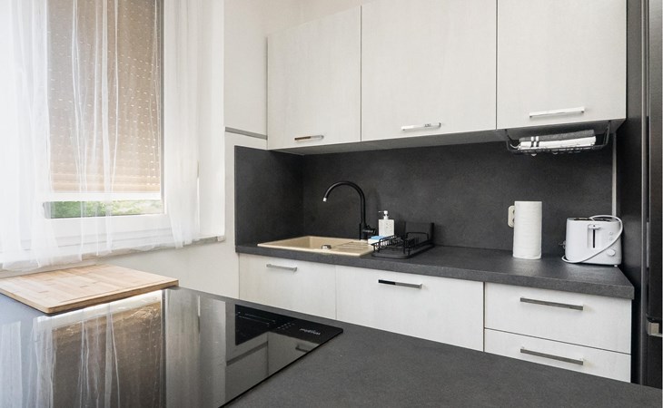 Diese in dezenten Farben gehaltene Wohnung bietet Ihnen alles, was Sie für eine entspannte Auszeit vom Alltag brauchen. Ein gemütliches Sofa, ein Fernseher und eine moderne Küche laden Sie zu erholsamen Stunden beim Plaudern, Fernsehen oder Kochen ein. Kommen Sie hier zur Ruhe und genießen Sie Ihre Wohlfühlzeit ganz nach Ihren Wünschen.