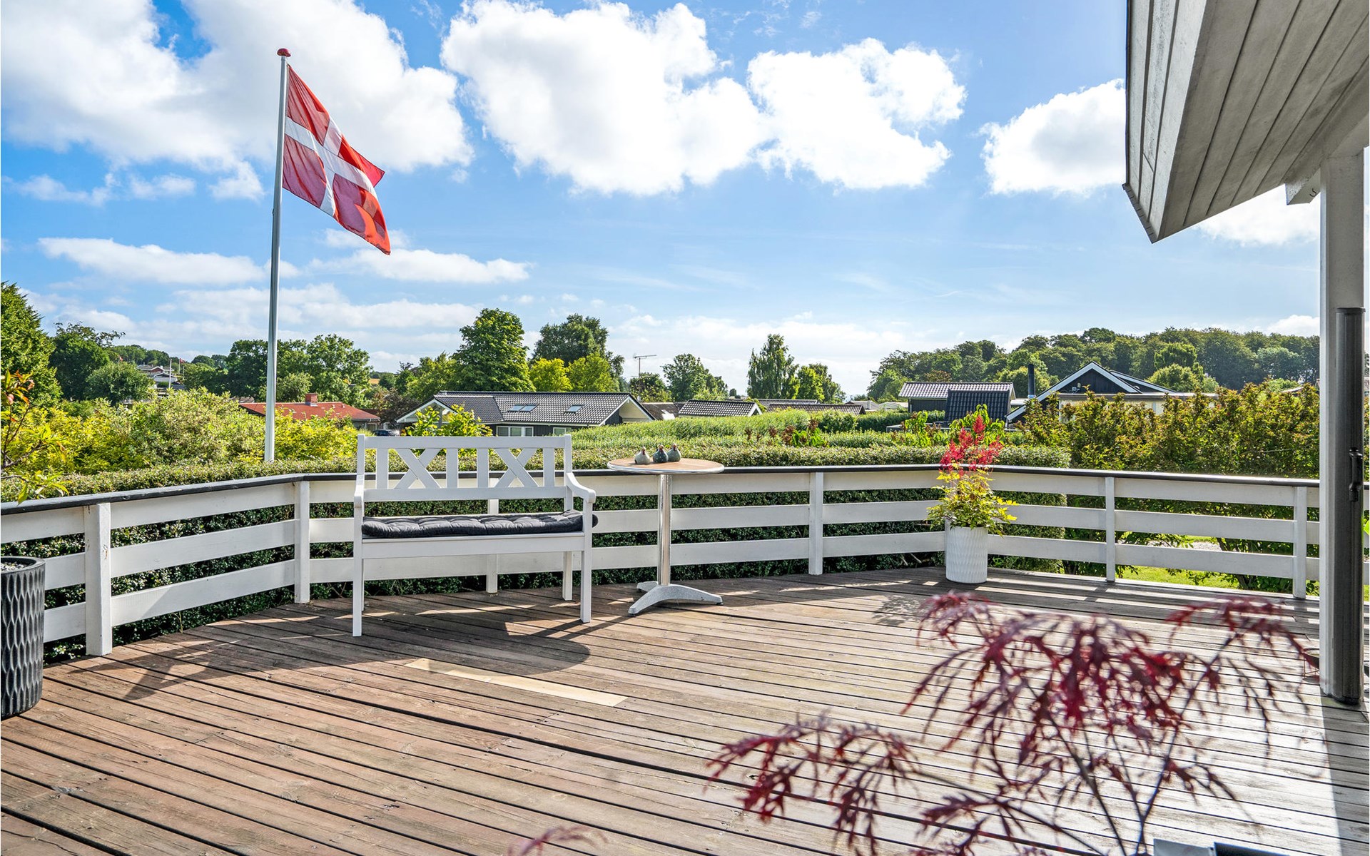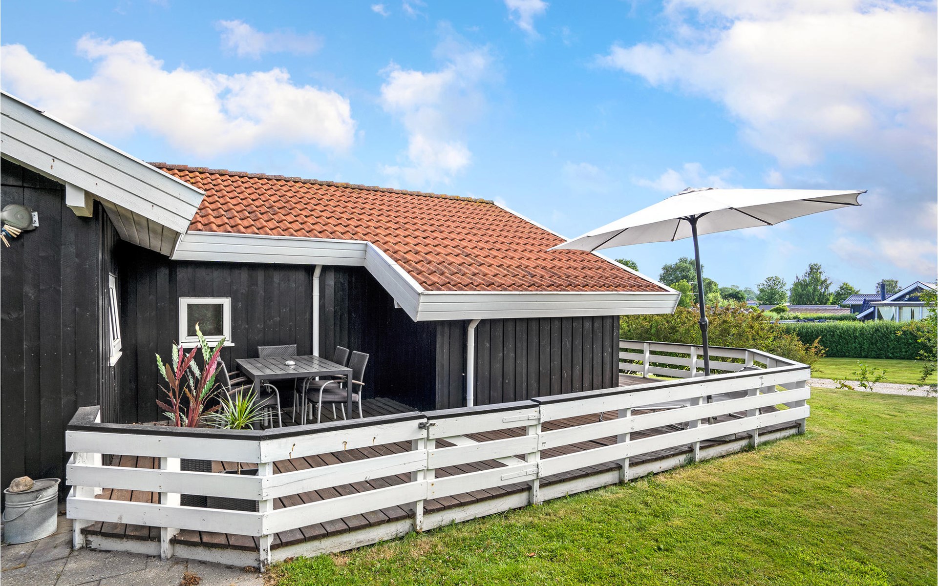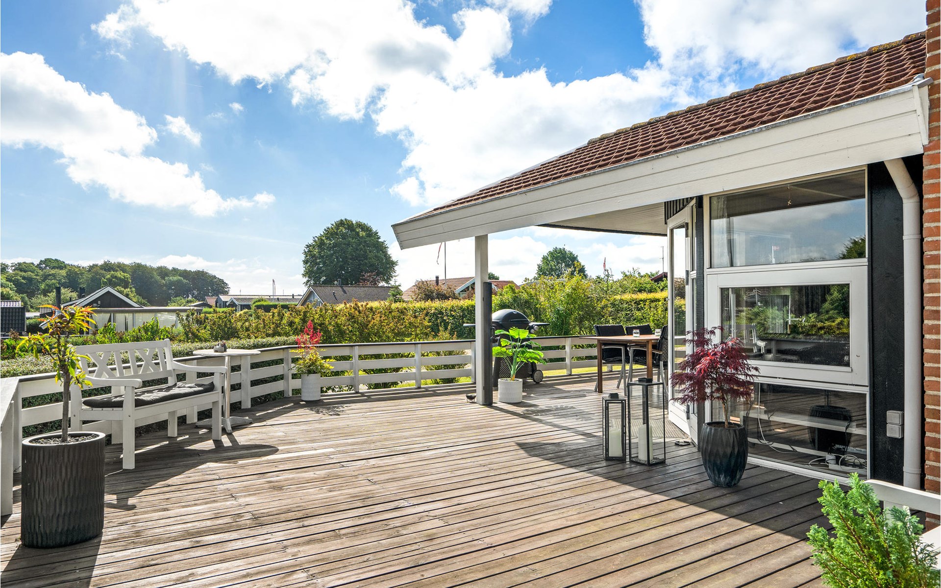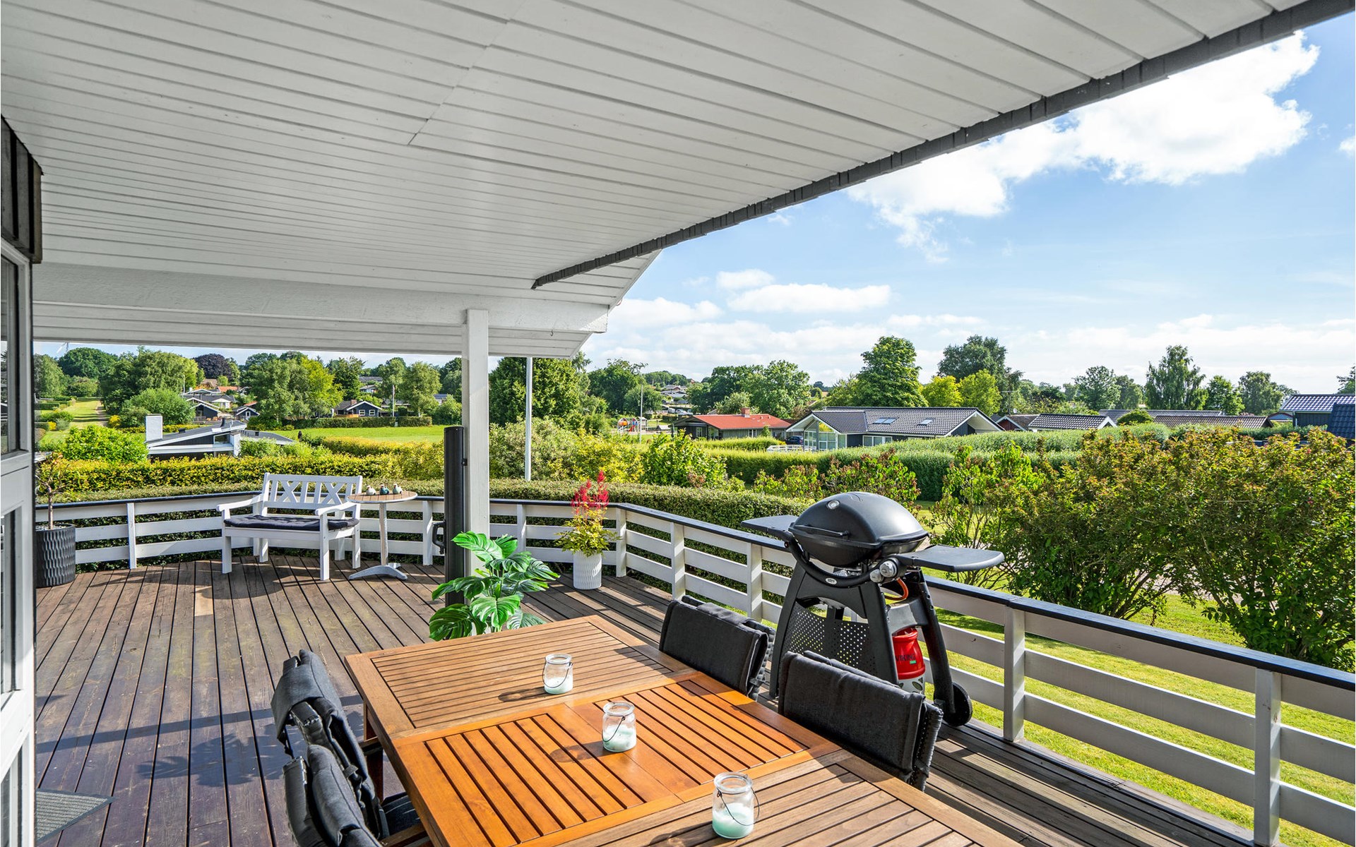 Die große, teilweise überdachte Terrasse führt um das Haus herum, so dass es je nach Laune ein sonniges oder schattiges Plätzchen in Reichweite gibt.