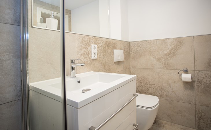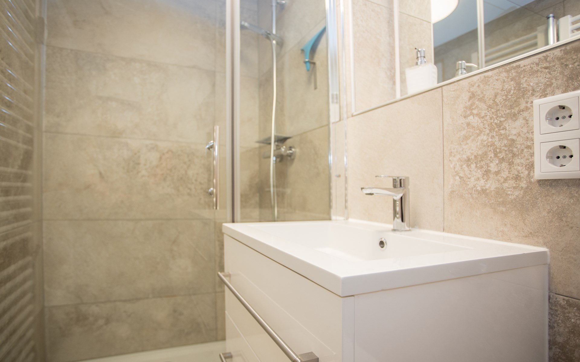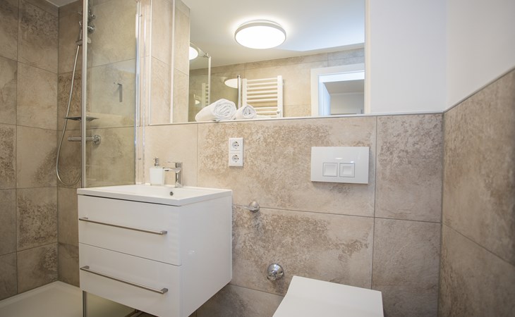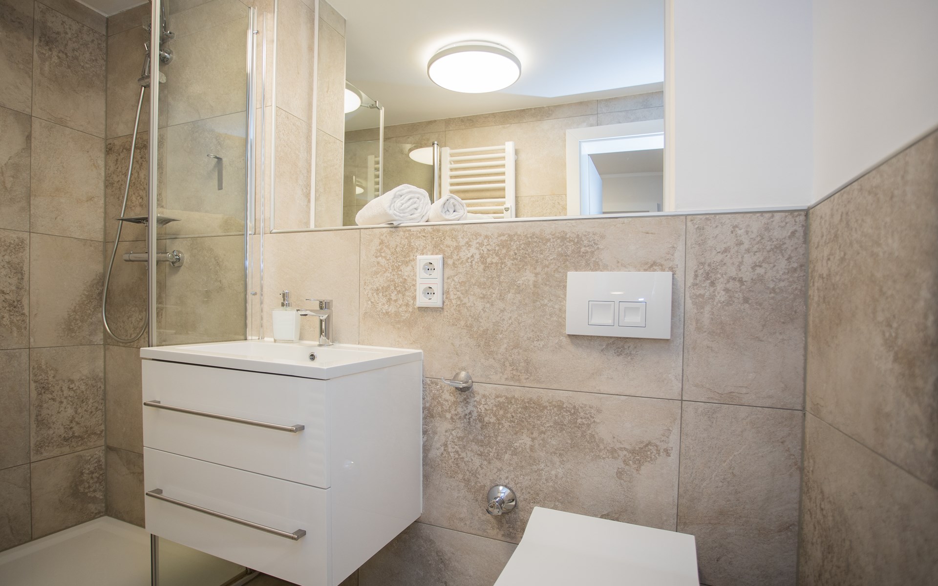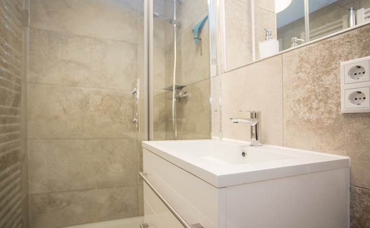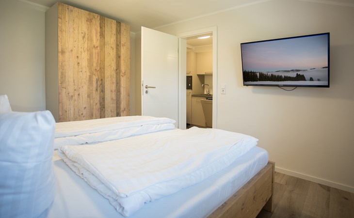 Das Schlafzimmer mit einem Doppelbett (2 x 90 x 200 cm) grenzt an die Küche. Hier kann man prima vom Bett aus noch etwas Fernsehen, denn im Schlafzimmer hängt ein zweites TV. Dann gibt es auch noch 2 Nachtschränkchen, Nachttischlampen und einen Kleiderschrank. Die zweite Schlafgelegenheit befindet sich im Wohnzimmer in Form des Schlafsofas und bietet 2 Kindern Platz. Das Badezimmer ist mit barrierefreier Regendusche, Toilette und Waschtisch, ausgestattet, und Ihre Handtücher können Sie auf dem Handtuchheizkörper trocknen.
