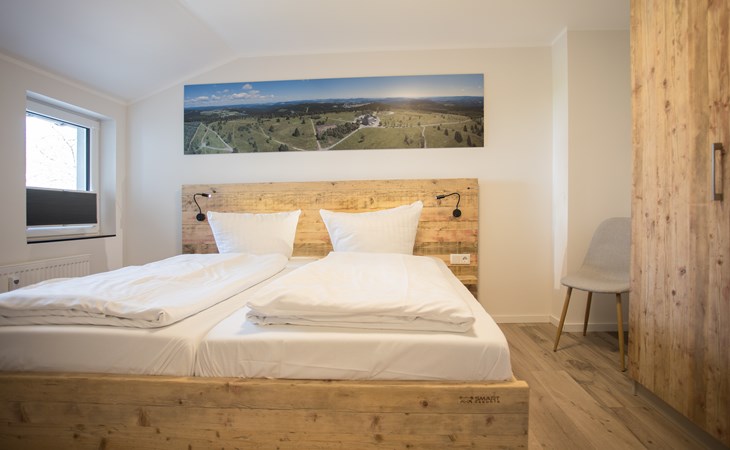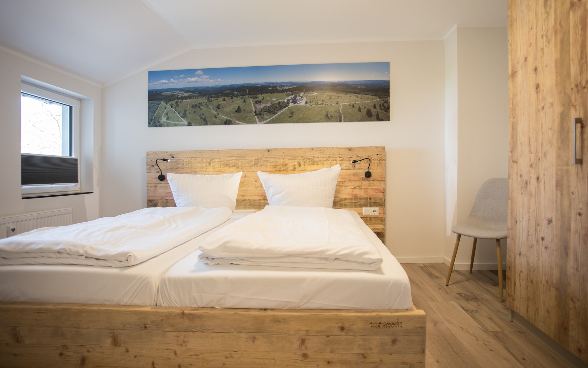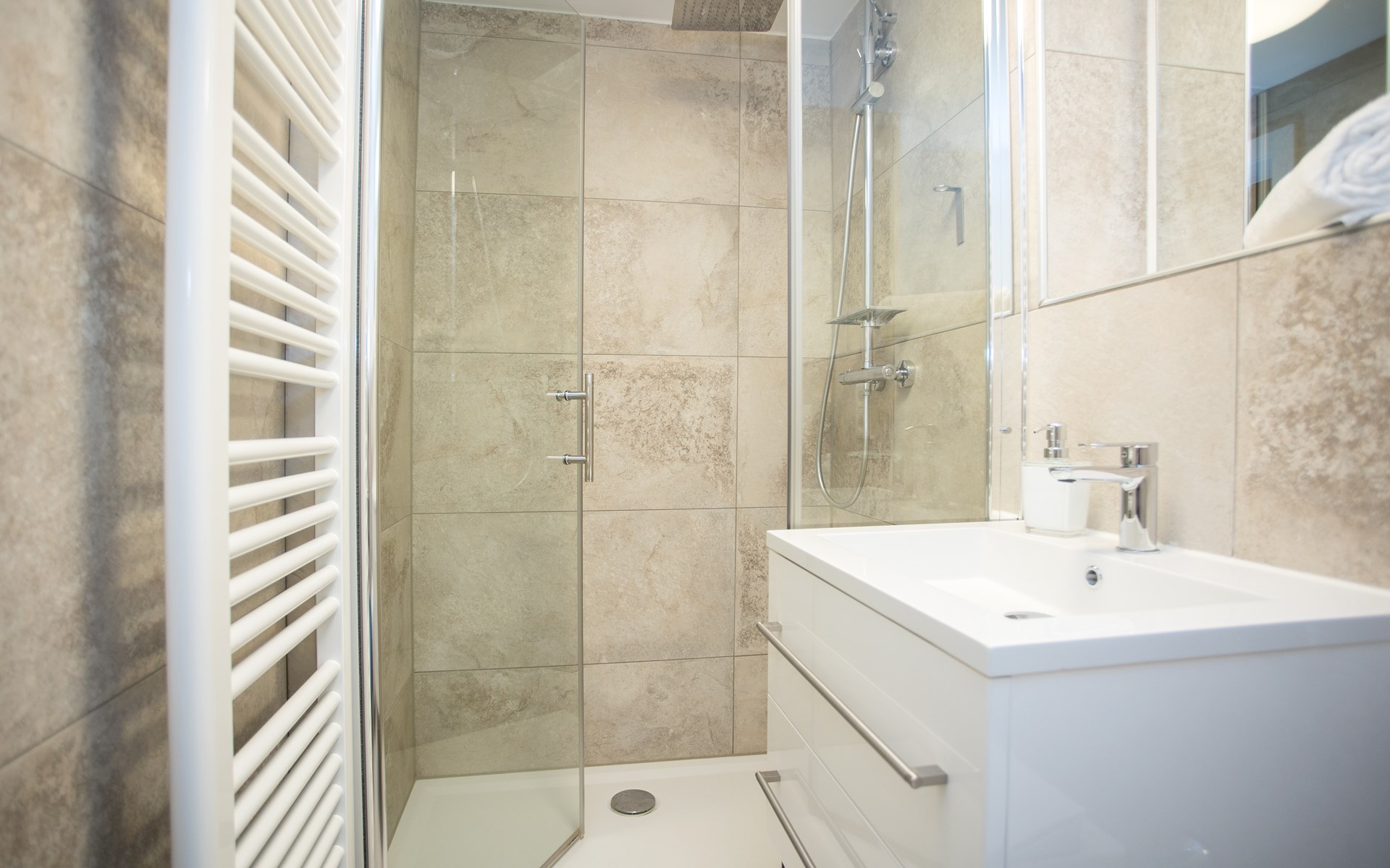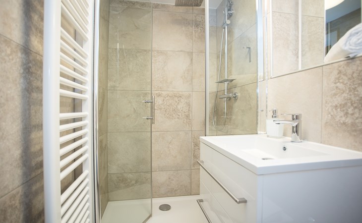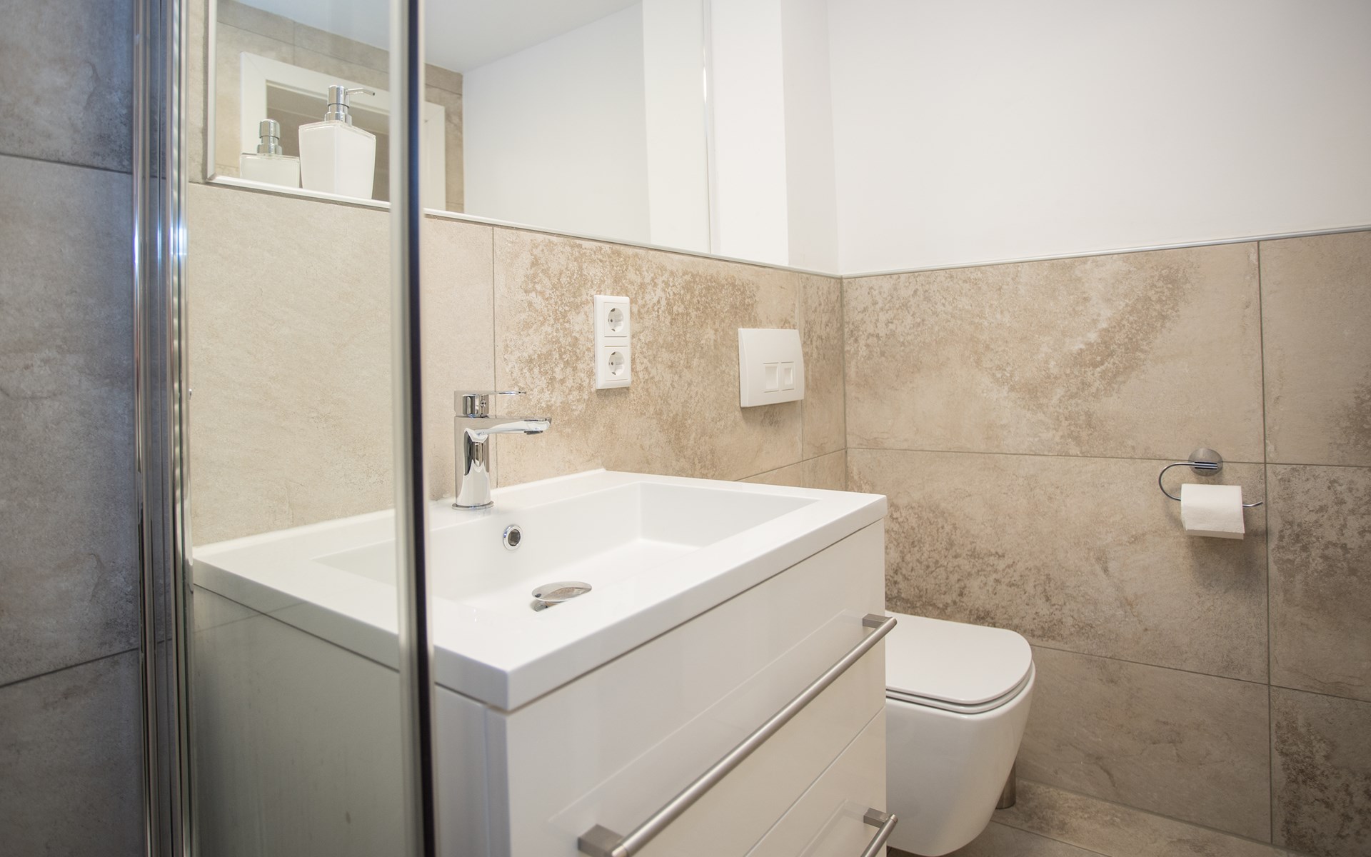 Das Schlafzimmer mit einem Doppelbett (2 x 90 x 200 cm) grenzt an die Küche. Hier kann man prima vom Bett aus noch etwas Fernsehen, denn im Schlafzimmer hängt ein zweites TV. Dann gibt es auch noch 2 Nachtschränkchen, Nachttischlampen und einen Kleiderschrank. Die zweite Schlafgelegenheit befindet sich im Wohnzimmer in Form des Schlafsofas und bietet 2 Kindern Platz. Das Badezimmer ist mit barrierefreier Regendusche, Toilette und Waschtisch, ausgestattet, und Ihre Handtücher können Sie auf dem Handtuchheizkörper trocknen.