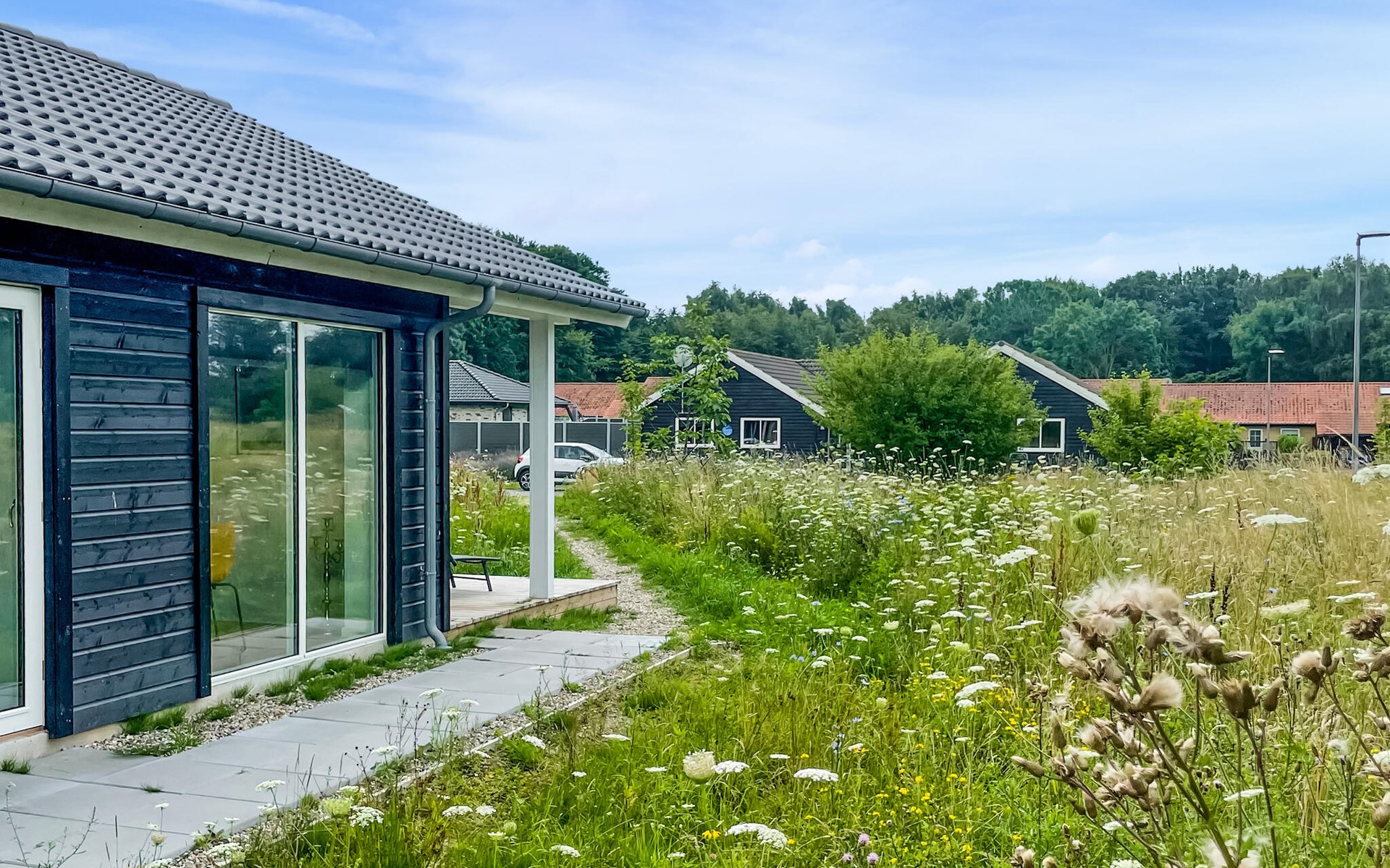 Das moderne Haus liegt auf einem schönen Grundstück mit einer Terrasse und Liegestühlen, auf denen Sie die sonnigen Tage in vollen Zügen genießen können. Zünden Sie abends den Grill an und lassen Sie den Tag mit saftigen Steaks und einem guten Glas Wein in der Abendsonne ausklingen. Genießen Sie dabei auch das idyllische Naturgrundstück mit wilder Vegetation, hohem Gras und schönen Blumen.