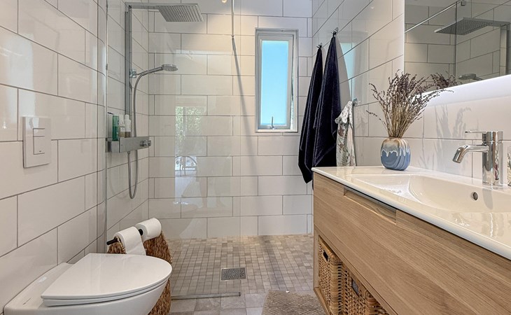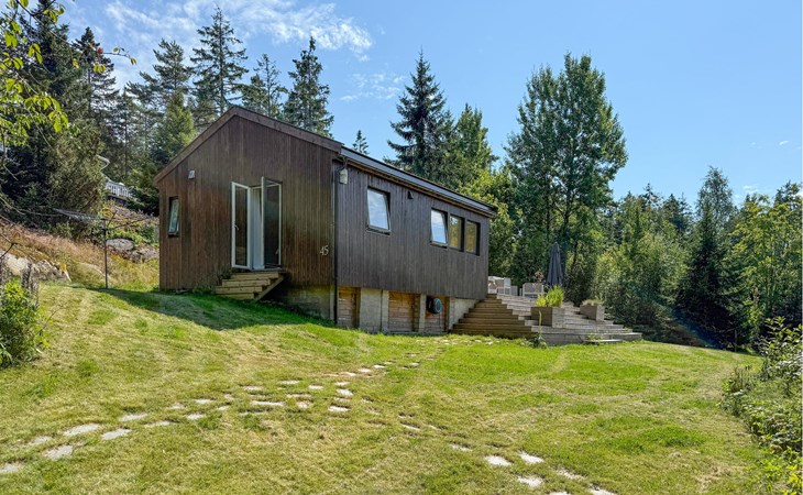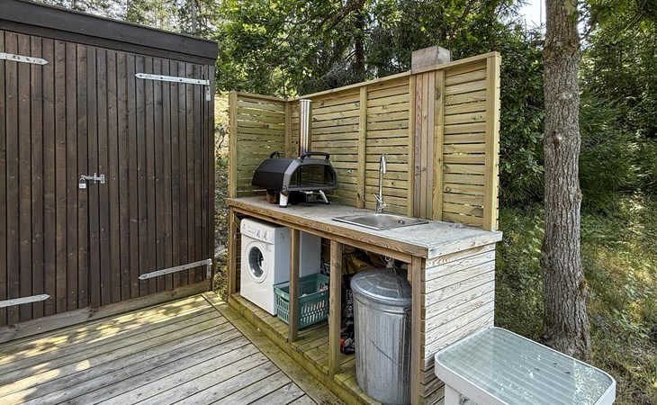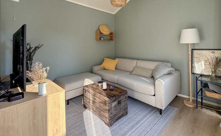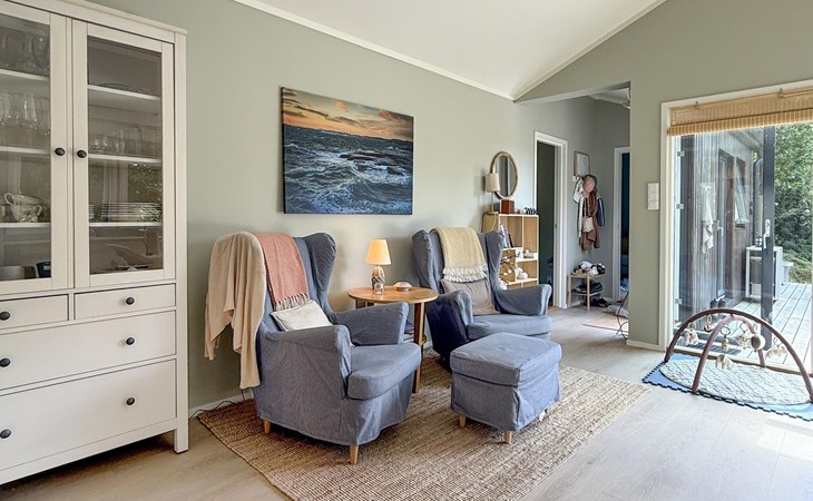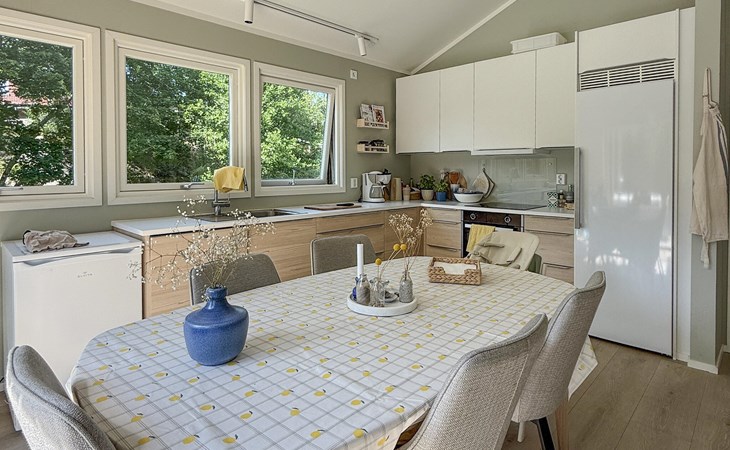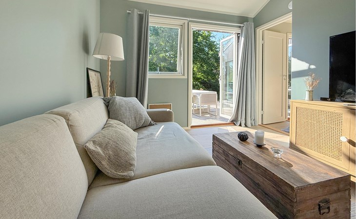 Dieses einladende Holzhaus liegt malerisch auf einer kleinen Anhöhe und ist umgeben von hohen Bäumen. Die Inneneinrichtung ist fein auf die Natur abgestimmt und so dominieren ruhige Farben und eine dezente Holzoptik. Lehnen Sie sich bequem bei einer Tasse Tee auf dem Sofa zurück, genießen Sie das helle Licht, das durch die Fenster fällt, oder nehmen Sie für eine gemütliche Mahlzeit mit Ihren Lieben am Esstisch in der Küche Platz.
