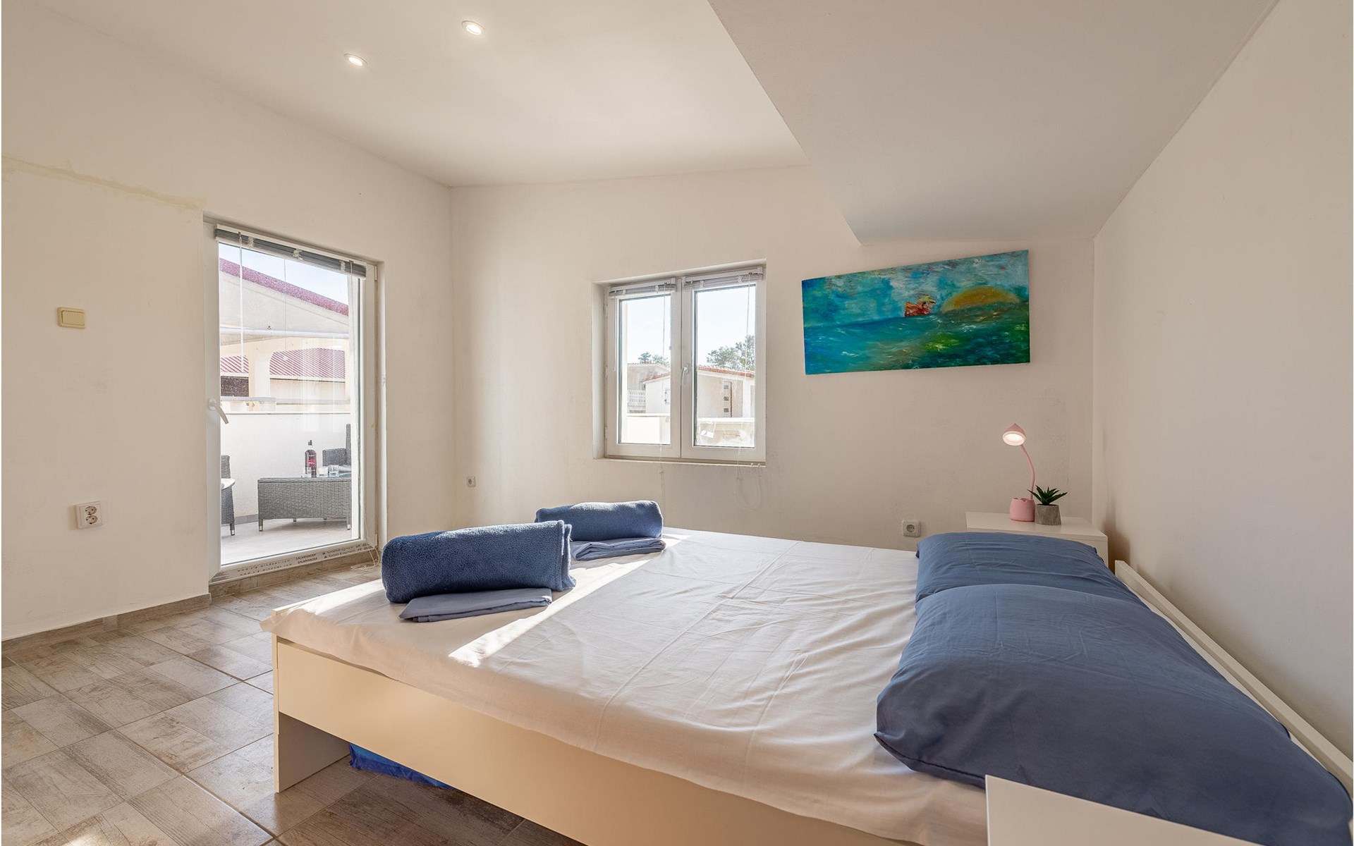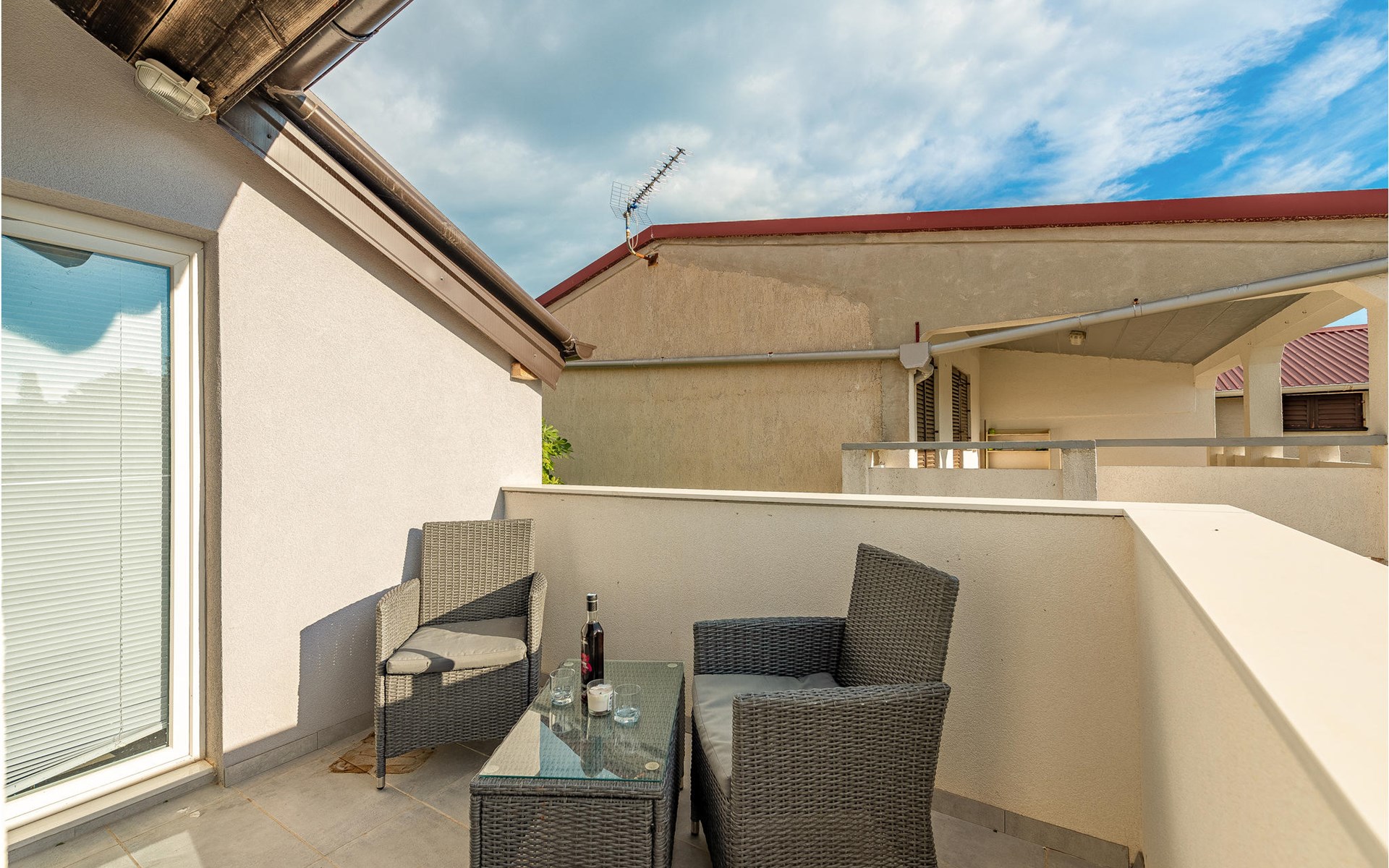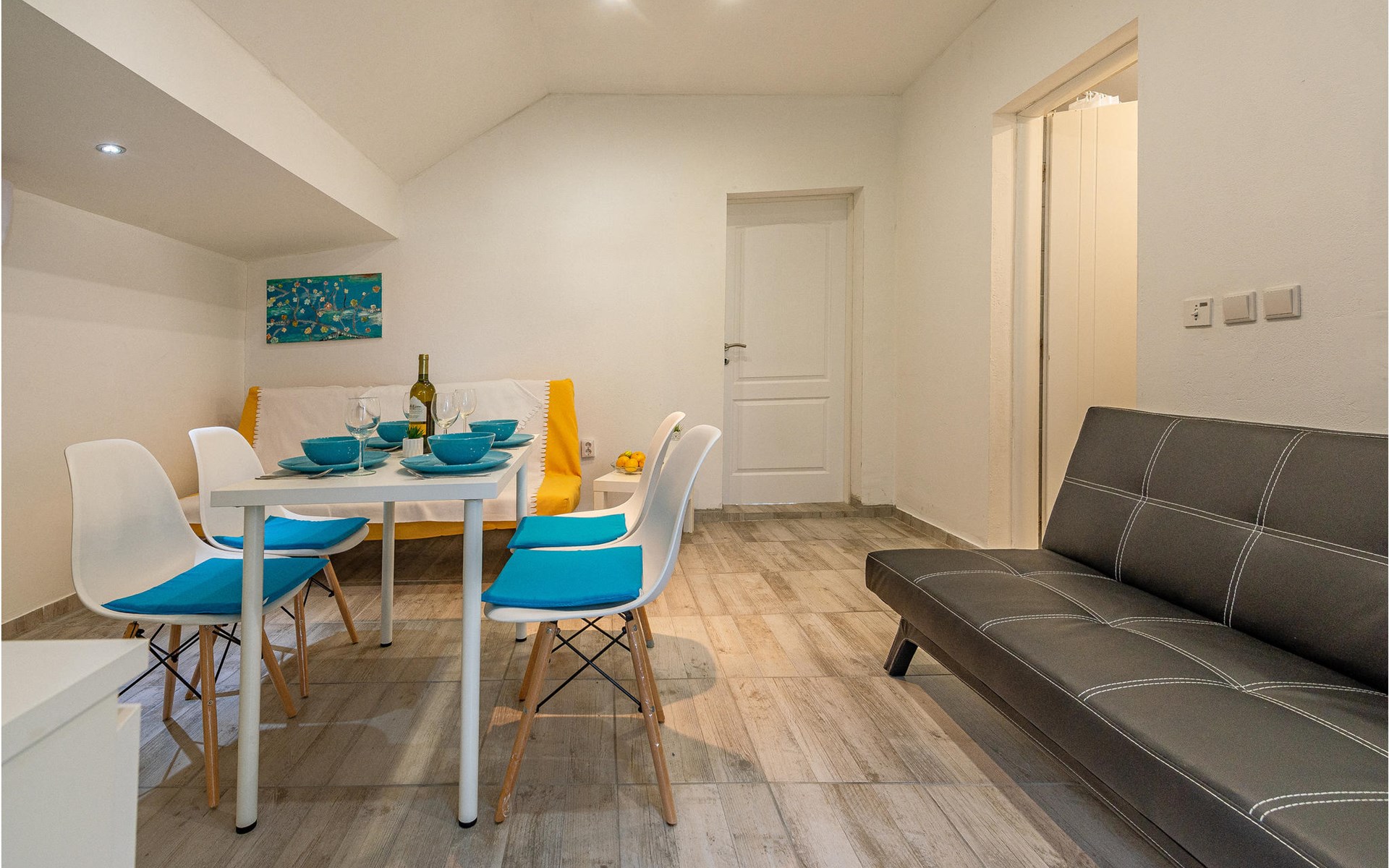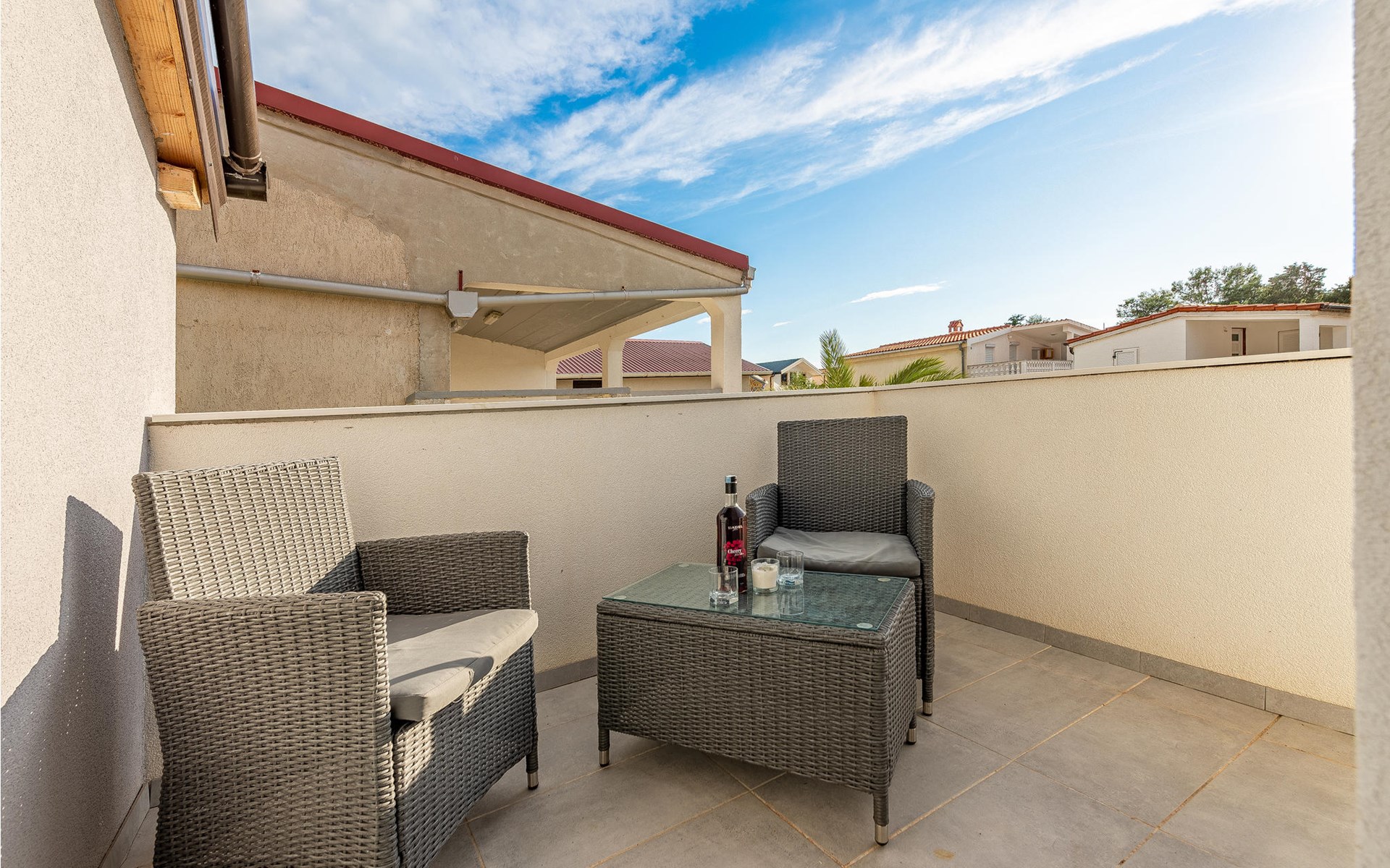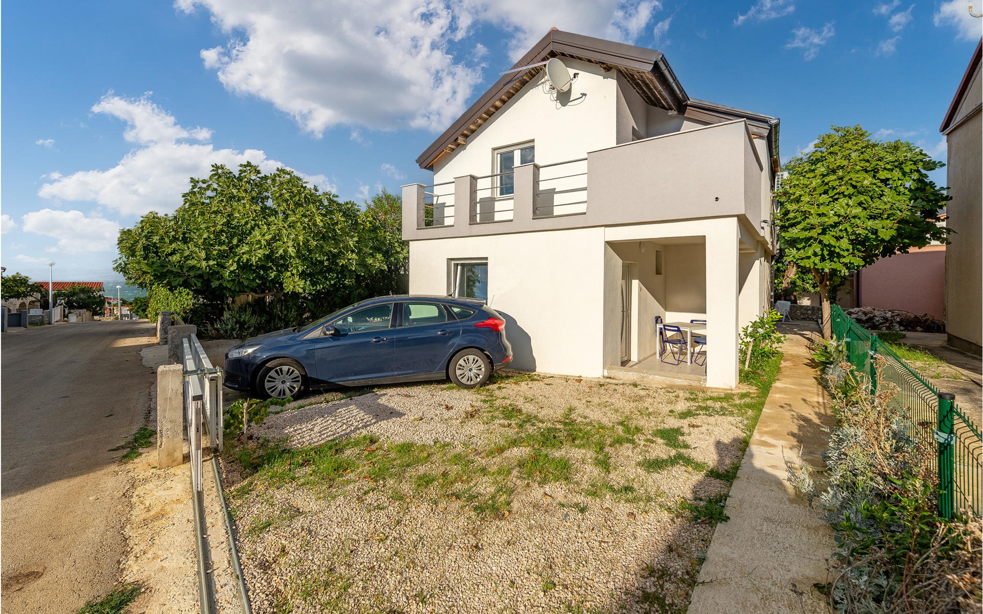 Die Wohnung begrüßt ihre Gäste im 1. Stock eines Hauses. Mit ihrer modernen und ansprechenden Einrichtung ist sie der ideale Ort für einen erholsamen Urlaub zu jeder Jahreszeit. Eine Klimaanlage sorgt auch in heißen Sommern für angenehme Raumtemperaturen.