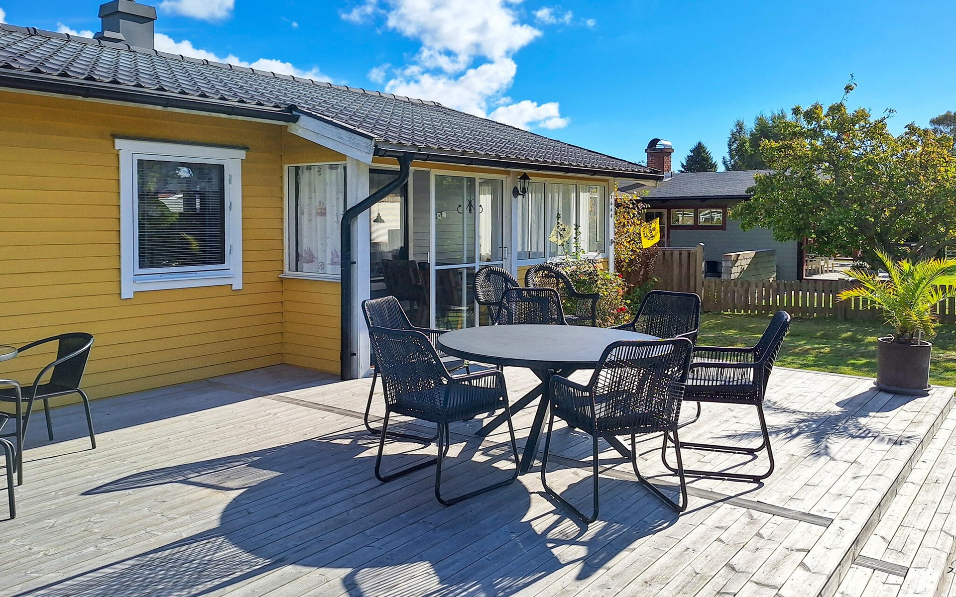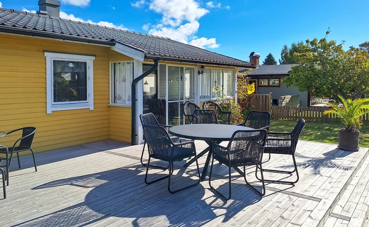Gehen Sie hinaus, lassen Sie den Blick über den gepflegten Garten schweifen und genießen Sie die ruhige Umgebung. Nehmen Sie Platz in der Sitzecke und entspannen Sie in der Sonne auf der offenen Holzterrasse.
