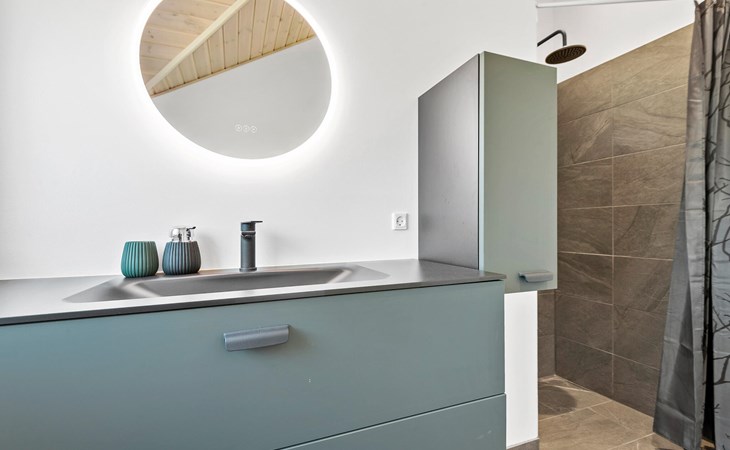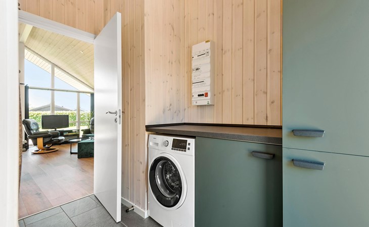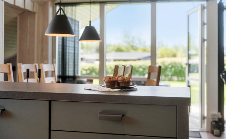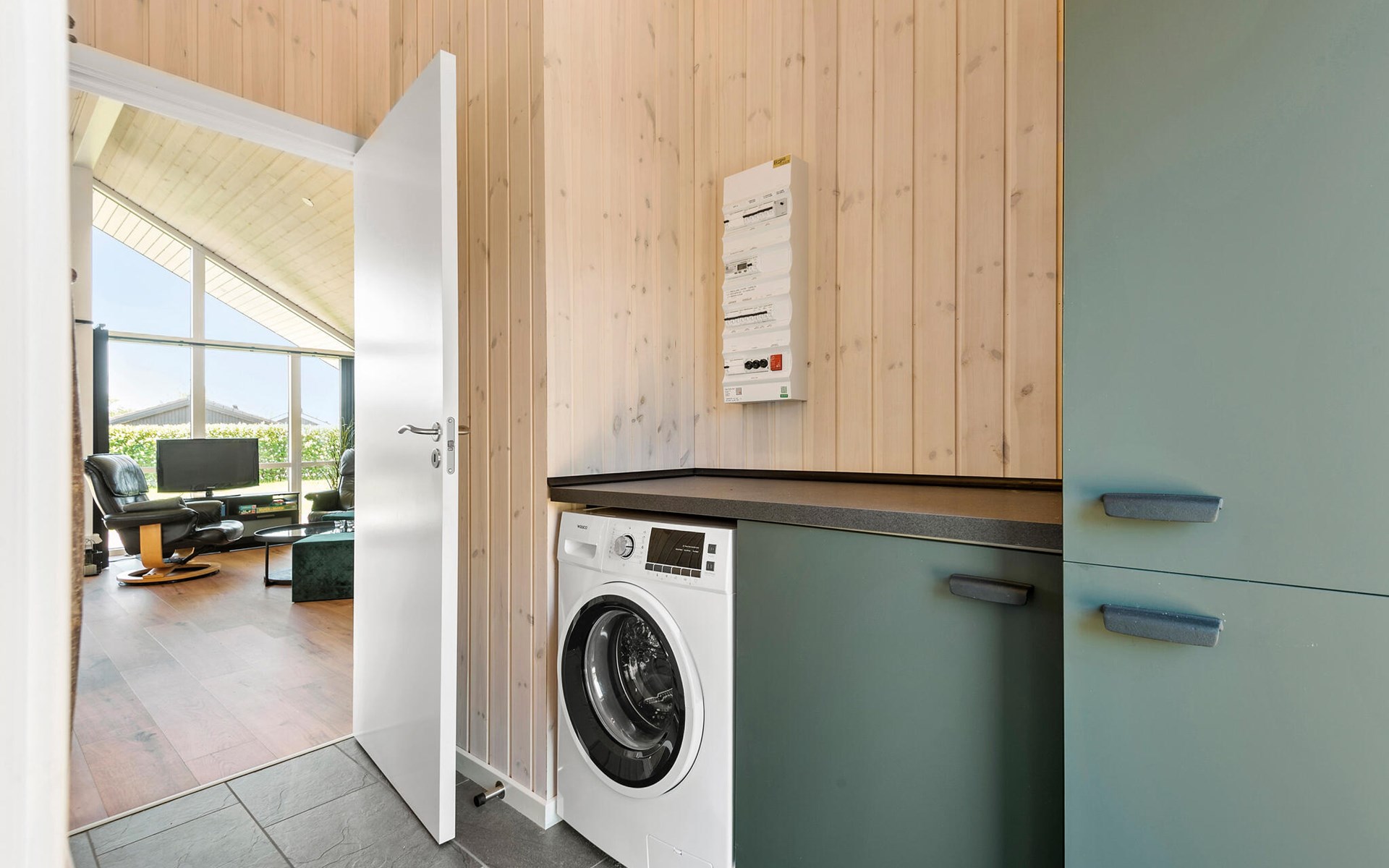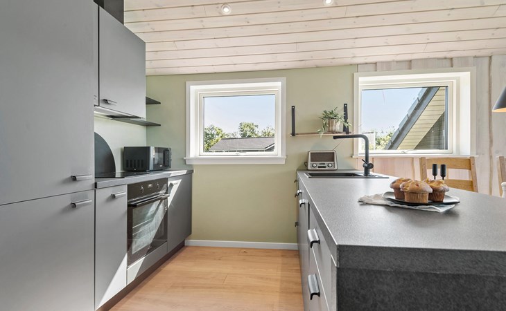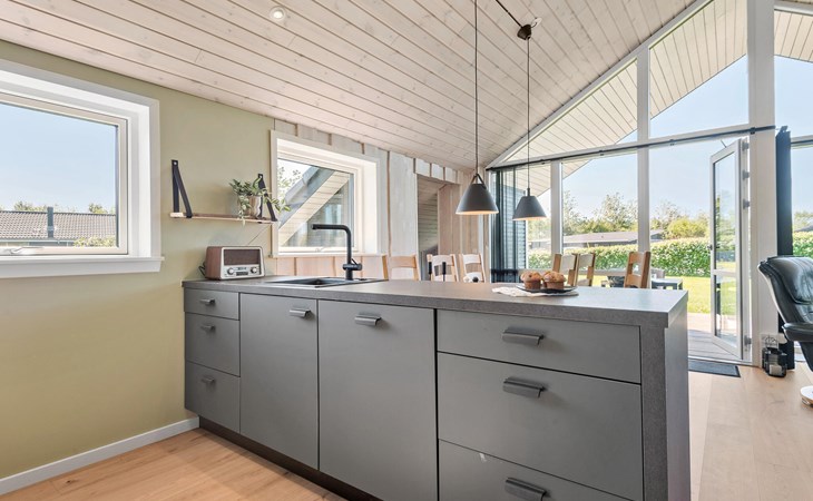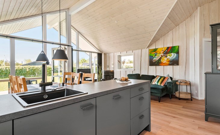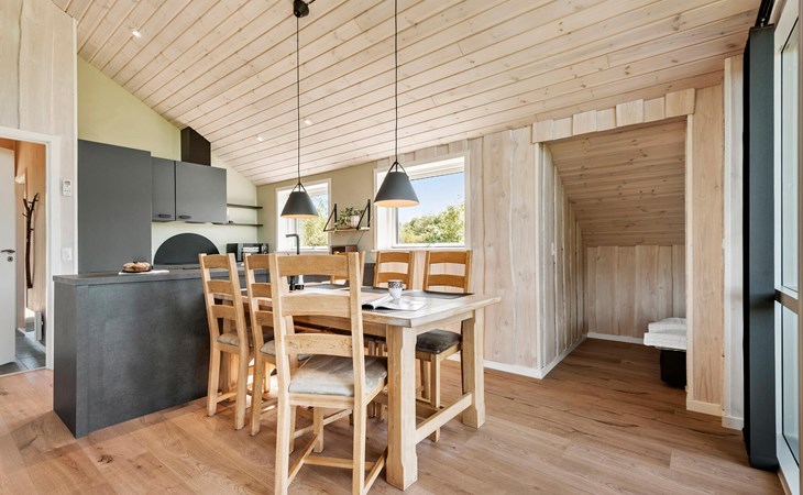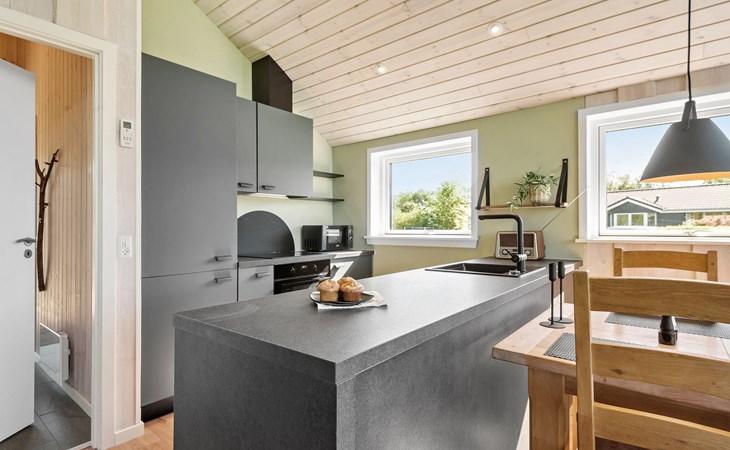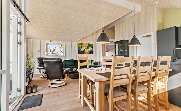 Ihr modernes Ferienhaus bietet Ihnen alles, was Sie für einen erholsamen Aufenthalt in Bork Havn am Ringkøbing Fjord benötigen. Betreten Sie Ihr Haus und genießen Sie die lichtdurchfluteten Räume mit den großen Fenstern, die einen herrlichen Blick ins Freie bieten. Die bequemen, stilvollen Sofas und der gemütliche Essbereich schaffen gemeinsam eine angenehme Atmosphäre.