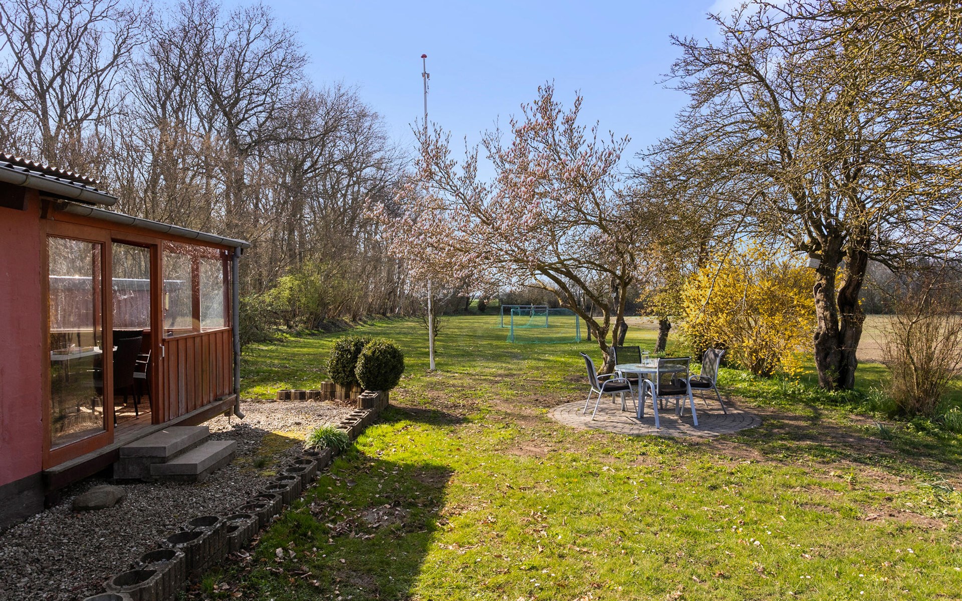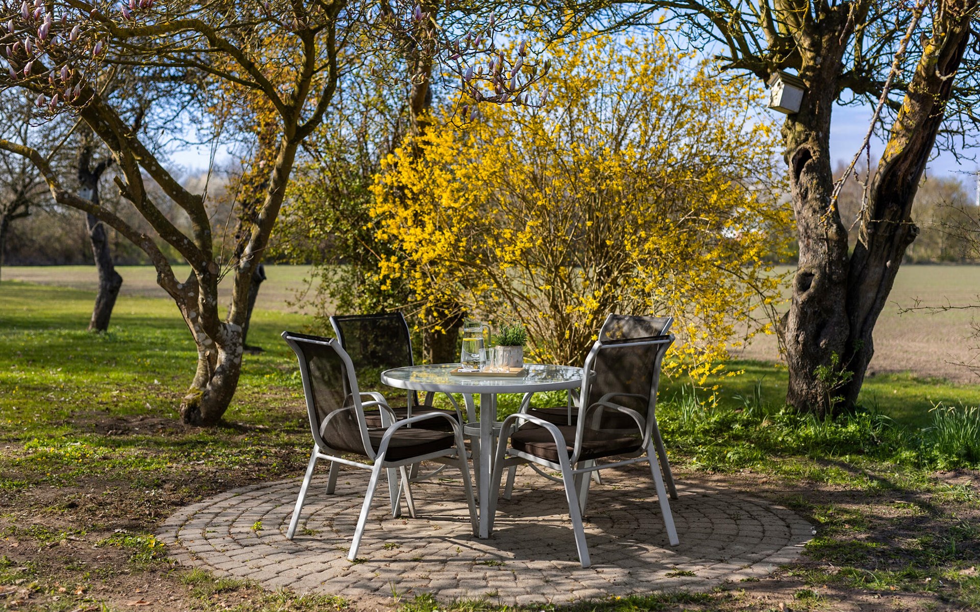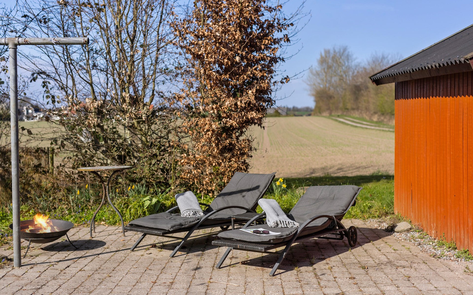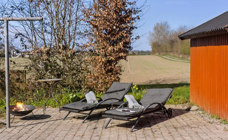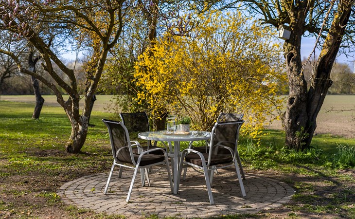 Nutzen Sie die verschiedenen Sitzplätze im Garten und auf der Terrasse, ob in der Sonne, im Schatten der Bäume oder geschützt unter dem Dach. Entspannen Sie auf den Liegestühlen, während sich die Landschaft ringsum in ihrer natürlichen Schönheit zeigt. Für stimmungsvolle Abende steht eine kleine Feuerschale bereit.