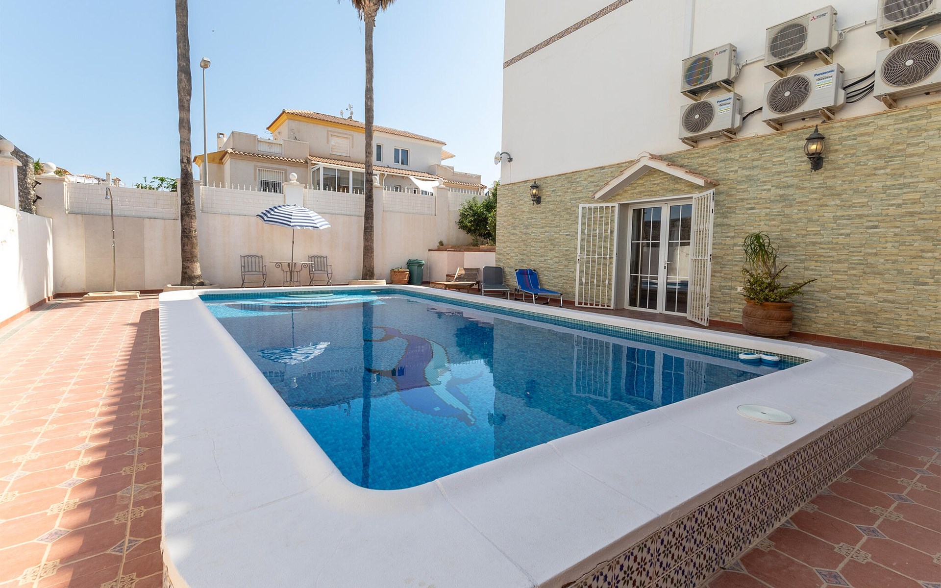 Im großen Patio erwartet Sie ein erfrischender Pool, in dem Sie sich zu jeder Tageszeit nach Lust und Laune vergnügen können. Servieren Sie frisch gepressten Orangensaft zum Frühstück, entspannen Sie auf der Sonnenliege und entfachen Sie an lauen Sommerabenden den Grill.