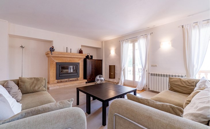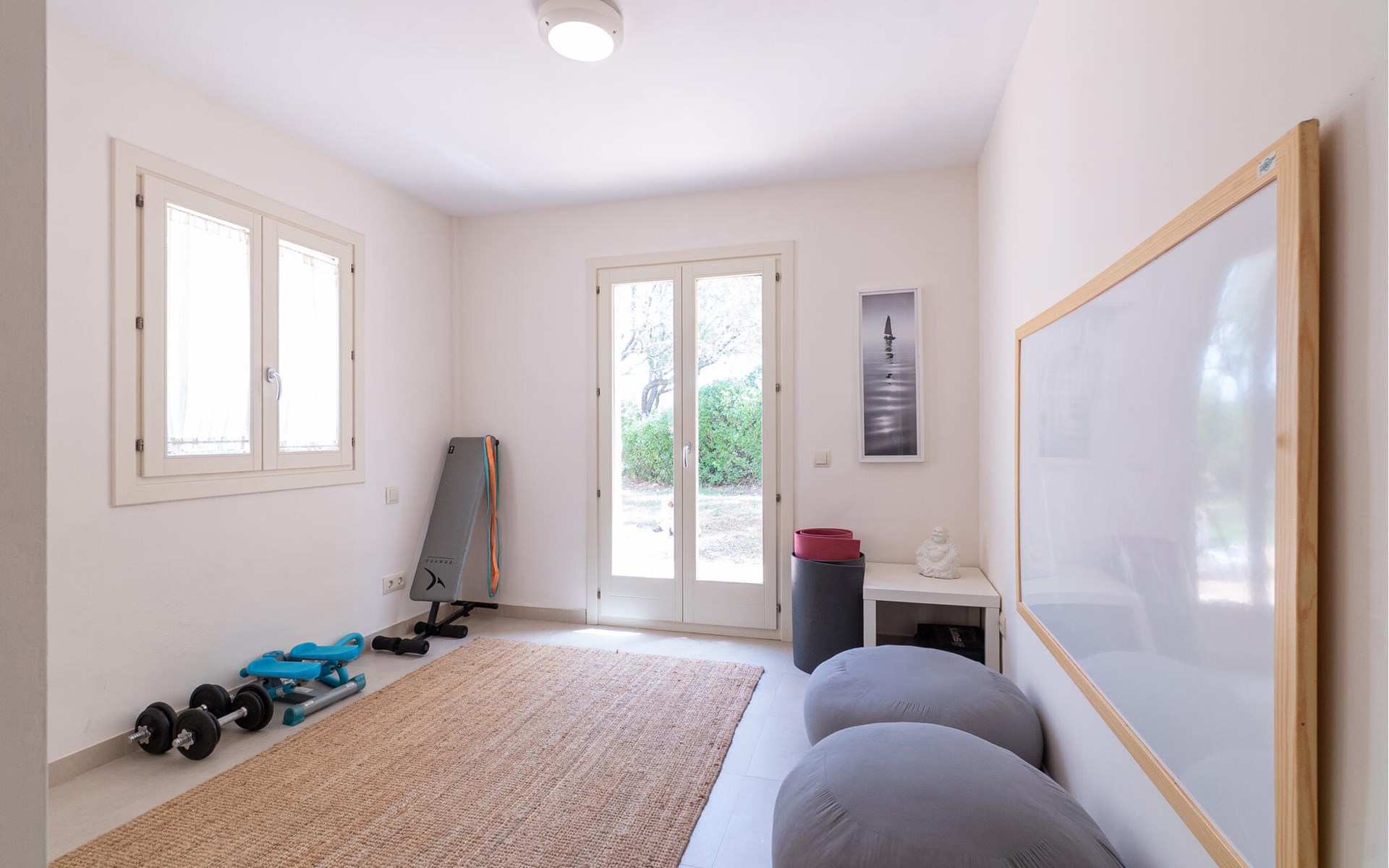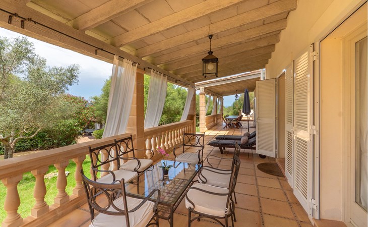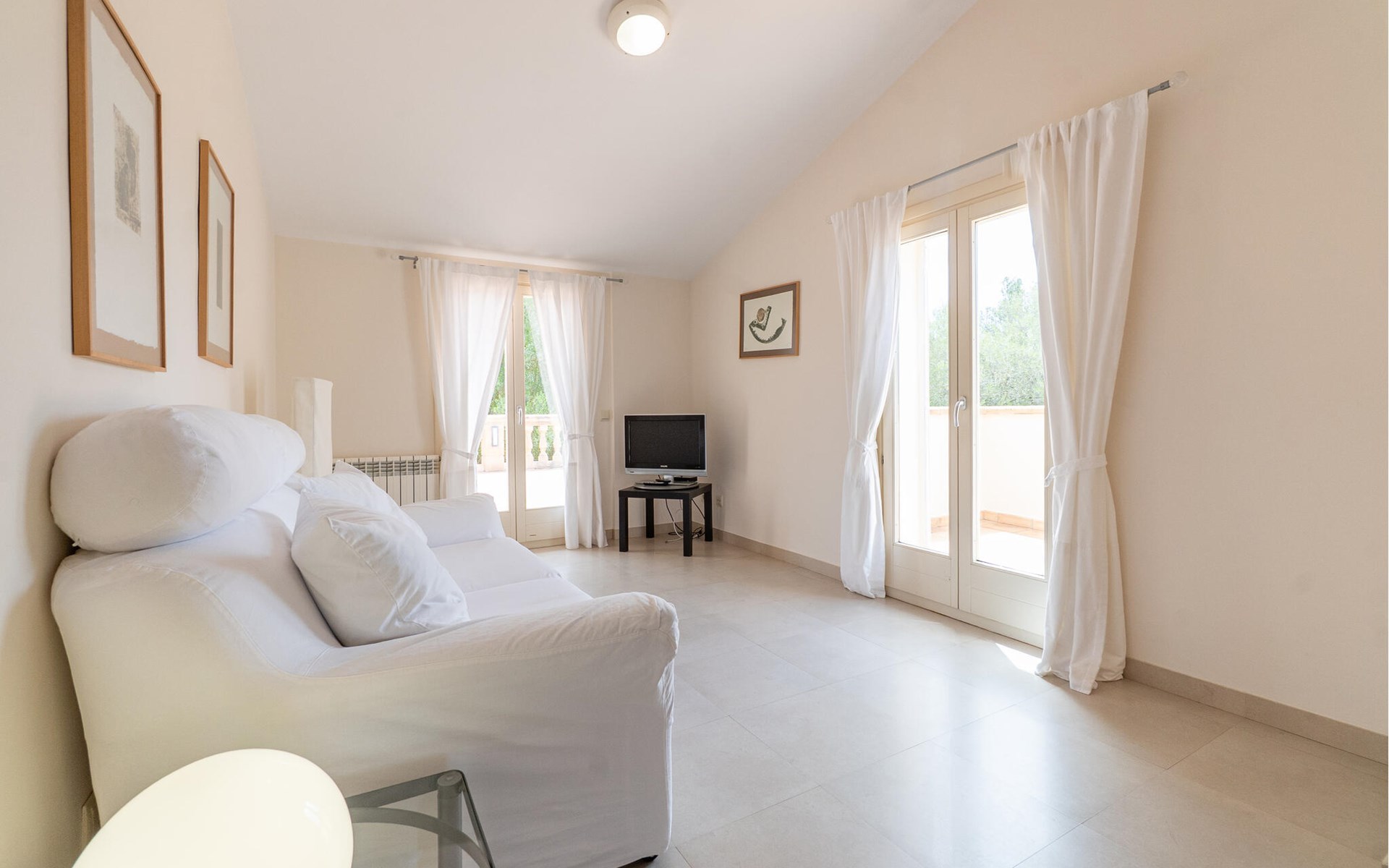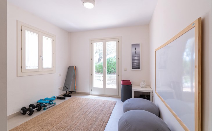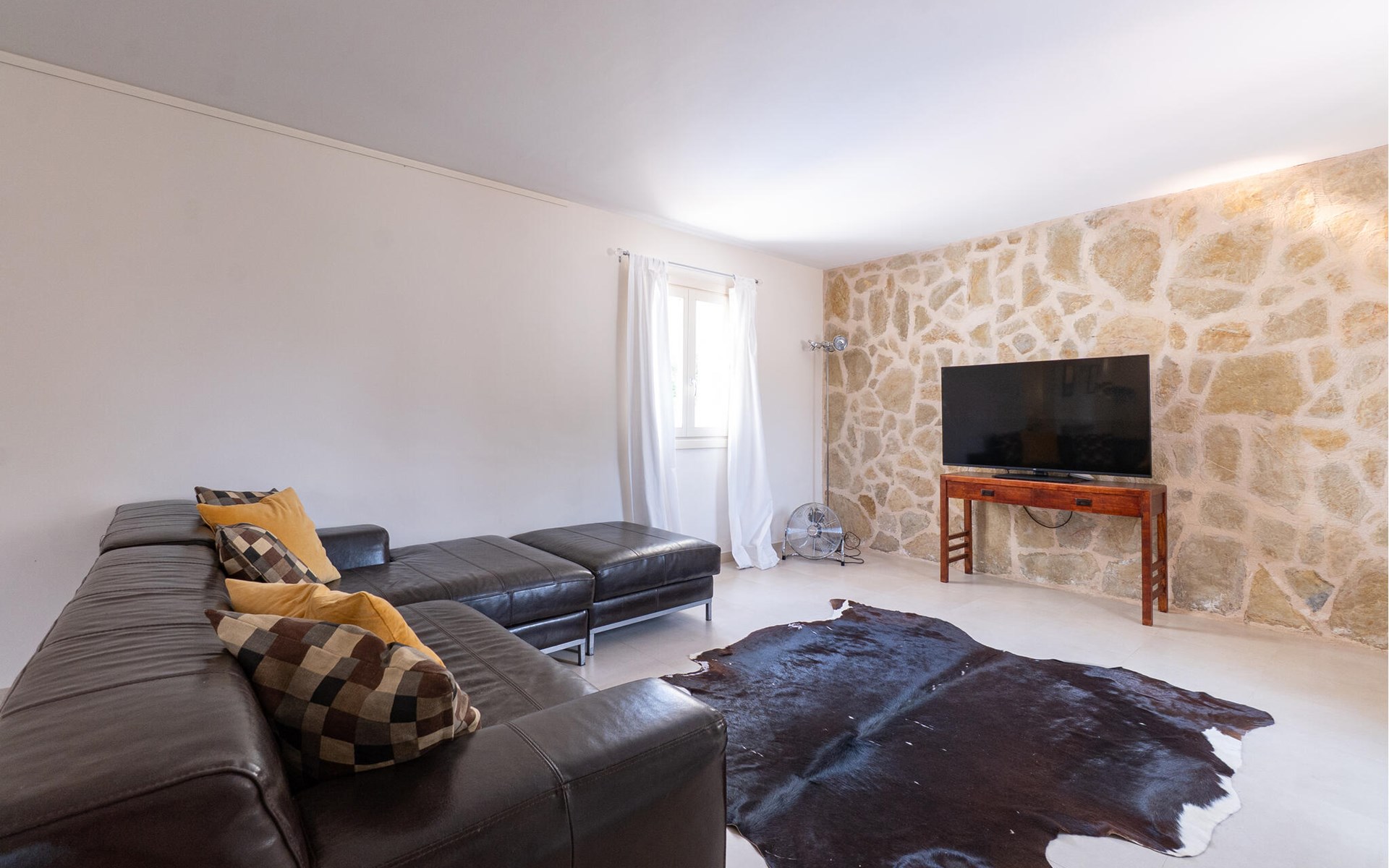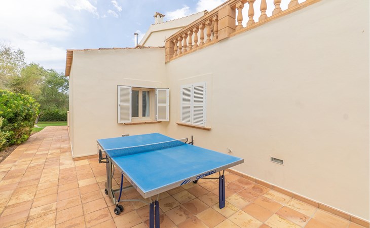 Eingebettet in ein großes, idyllisches Grundstück, das Ihnen maximale Privatsphäre verschafft, heißt Sie diese komfortable mallorquinische Finca willkommen. Dieses traumhafte Anwesen verwöhnt Sie mit allem, was einen Urlaub auf der bezaubernden Mittelmeerinsel zu einem unvergesslichen Erlebnis macht, und bietet reichlich Platz für geselliges Beisammensein – auch mit einer größeren Gruppe von Ruhesuchenden. Treten Sie ein und lassen Sie sich vom hellen und geschmackvoll eingerichteten Interieur begeistern. In der geräumigen Küche können Sie gemeinsam kulinarische Highlights aus frischen Zutaten vom Markt zubereiten und an einem der vielen Essplätze servieren. Gönnen Sie sich nach ausgedehnten Mahlzeiten eine erholsame Siesta in Ihrem behaglichen Schlafzimmer oder nutzen Sie die Trimmgeräte für Ihr Workout. Plaudern Sie vor dem Kamin über vergangene Zeiten oder ziehen Sie sich für einen Film oder ruhige Lesestunden ins einladende TV-Zimmer zurück.