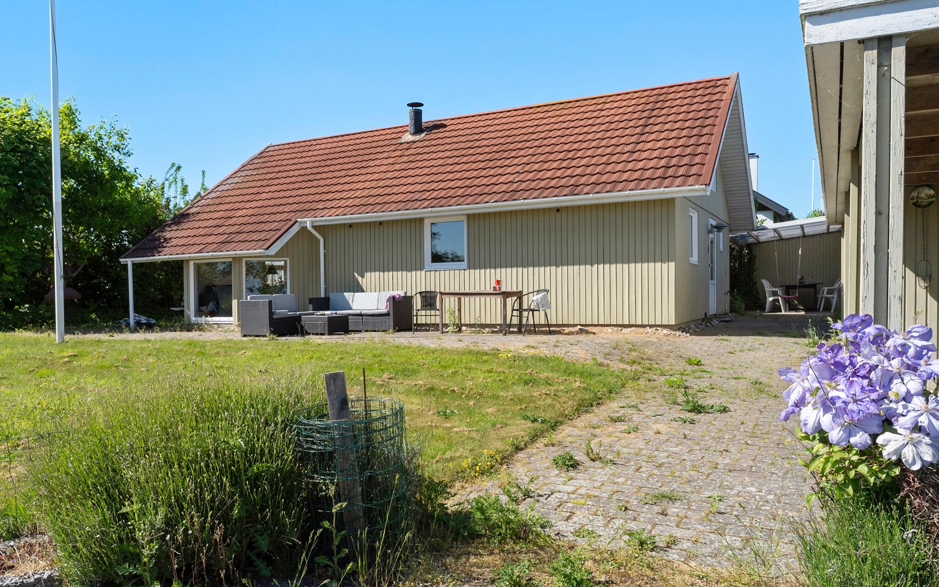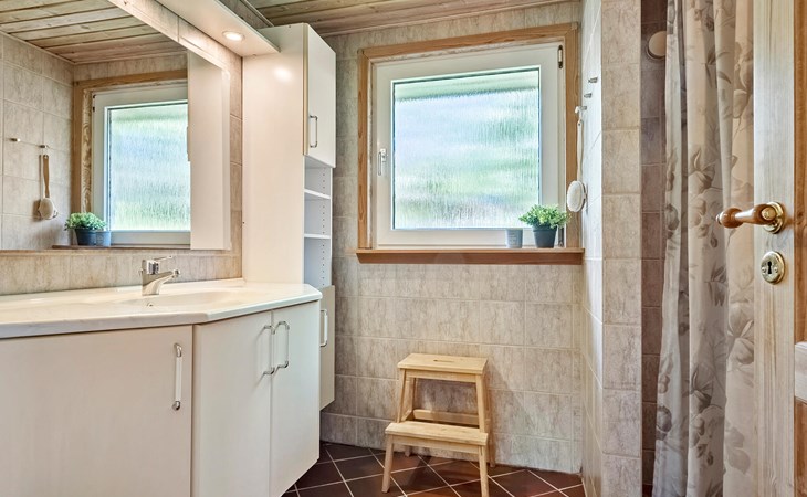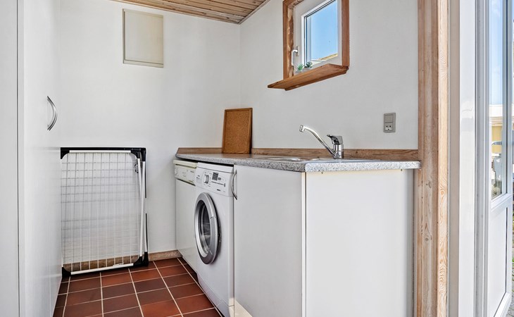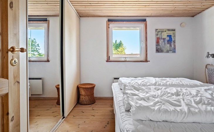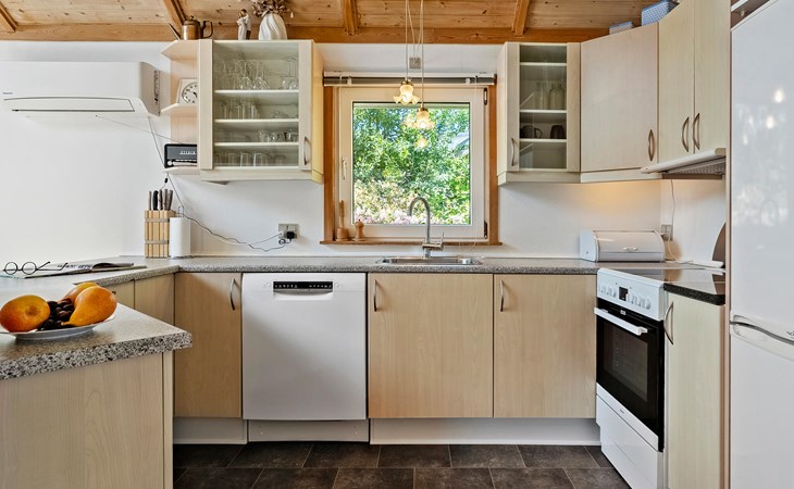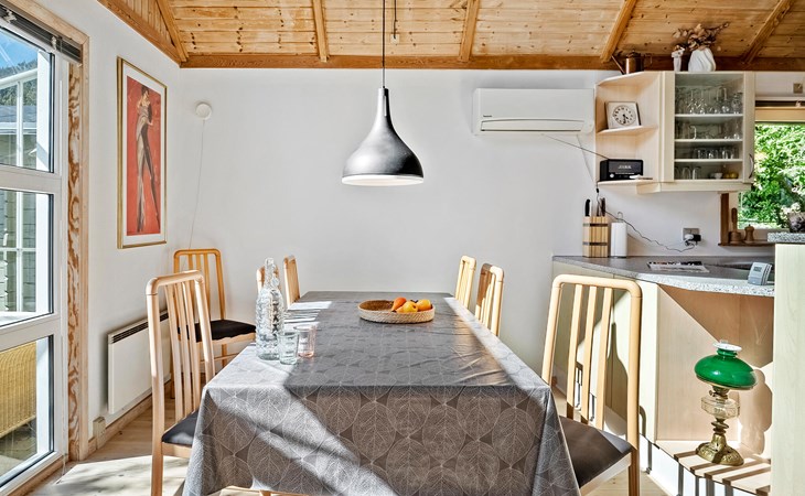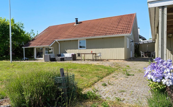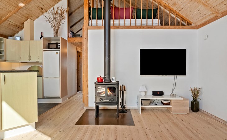 Freuen Sie sich auf einen erholsamen Aufenthalt in diesem Ferienhaus, das Ihnen gute Voraussetzungen für eine Auszeit mit der Familie oder Freunden bietet. Das Haus liegt in ruhiger Umgebung nahe der Küste und überzeugt mit einem angenehmen Mix aus Gemütlichkeit und Funktionalität. Treten Sie ein in den offenen Wohnbereich mit hohen Decken, großen Fenstern und schöner Holzausstattung. Machen Sie es sich auf dem komfortablen Ecksofa gemütlich und lesen Sie ein spannendes Buch. Der Kaminofen sorgt an kühleren Tagen für eine behagliche Stimmung. Bereiten Sie Ihre Mahlzeiten in der schönen Küche zu und genießen Sie sie am Esstisch mit Blick ins Grüne. Ein gemütlicher Schlafboden ergänzt das Raumangebot.