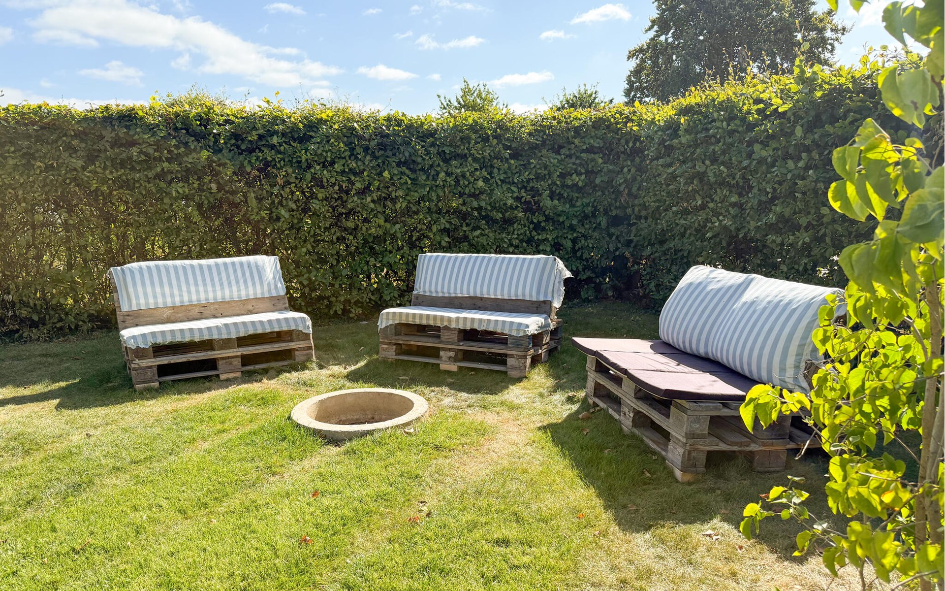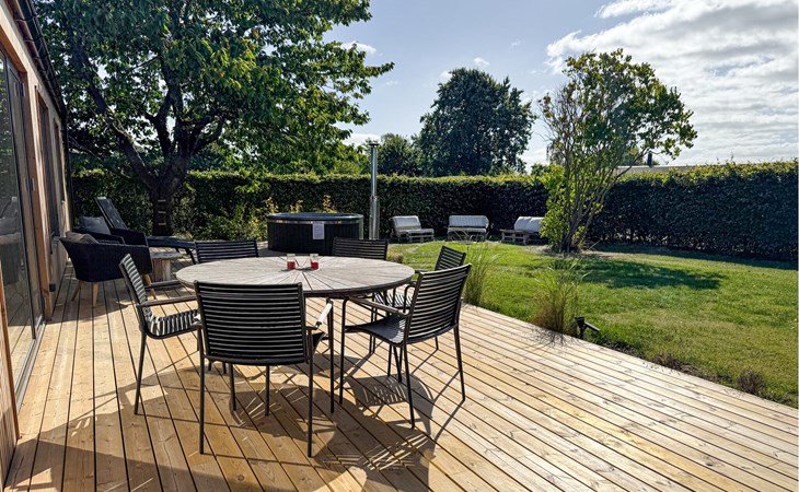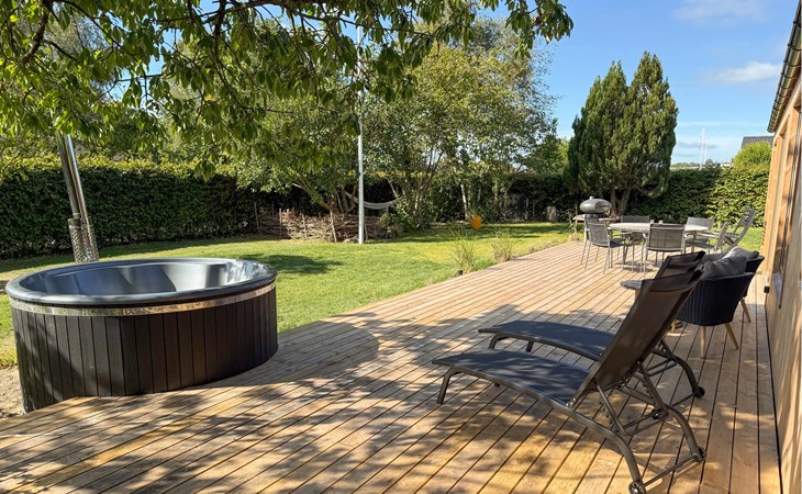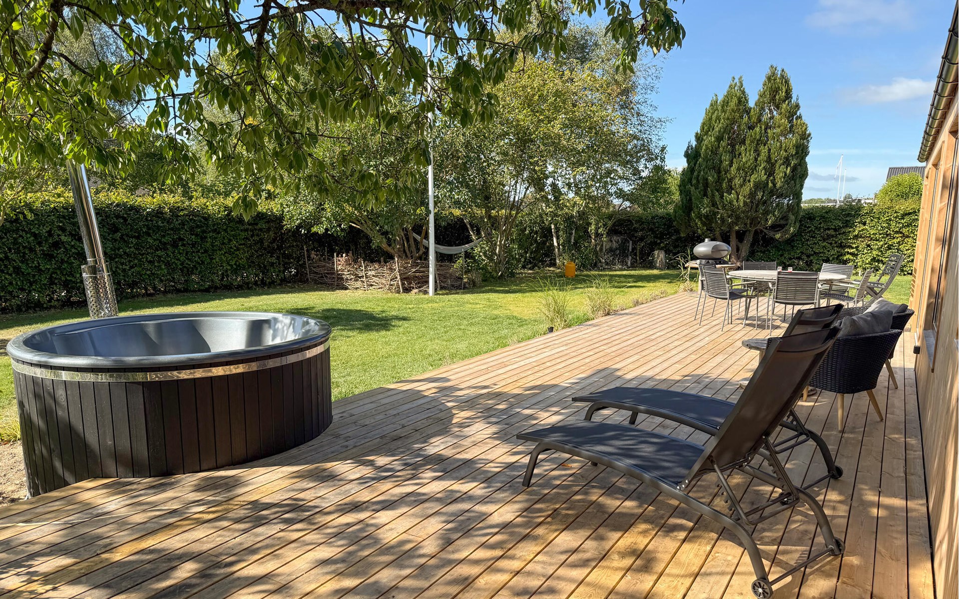 Im großen Garten finden Sie verschiedene Sitzgelegenheiten, passend für jede Gelegenheit. Die sonnige Terrasse eignet sich hervorragend für ein ausgiebiges Frühstück, während die Holzbänke dazu einladen, es sich am Abend an der Feuerstelle gemütlich zu machen. Für eine Erfrischung zwischendurch springen Sie in das Finnische Holzbad und entspannen anschließend auf einer Sonnenliege.