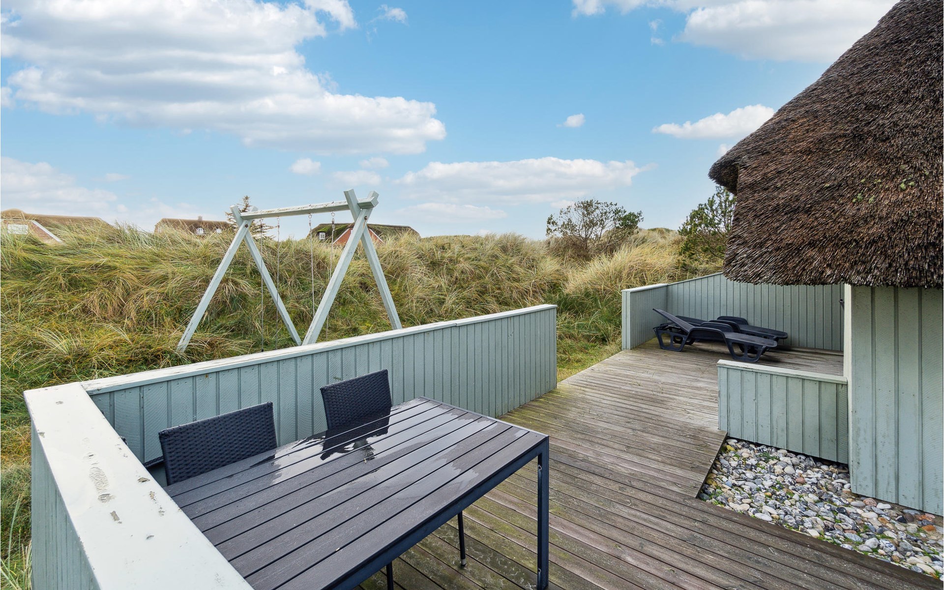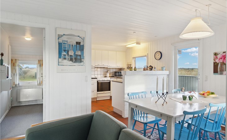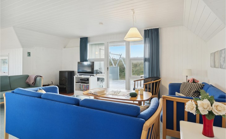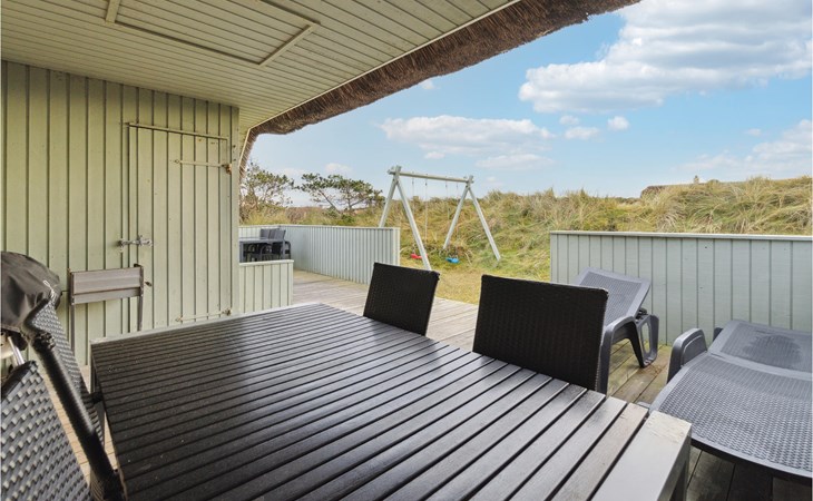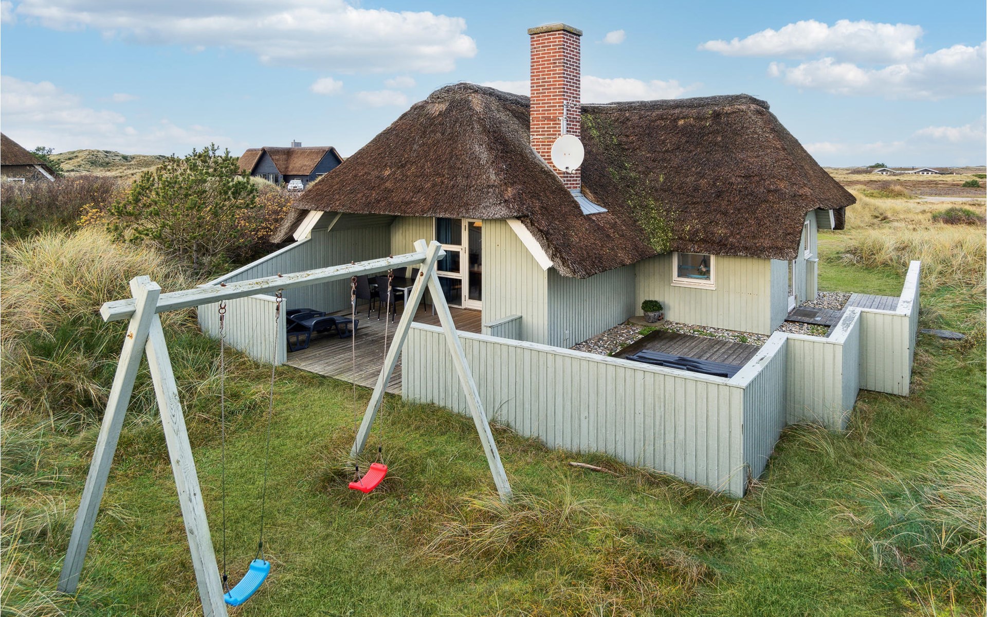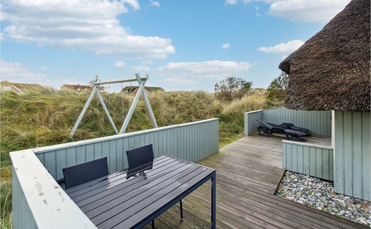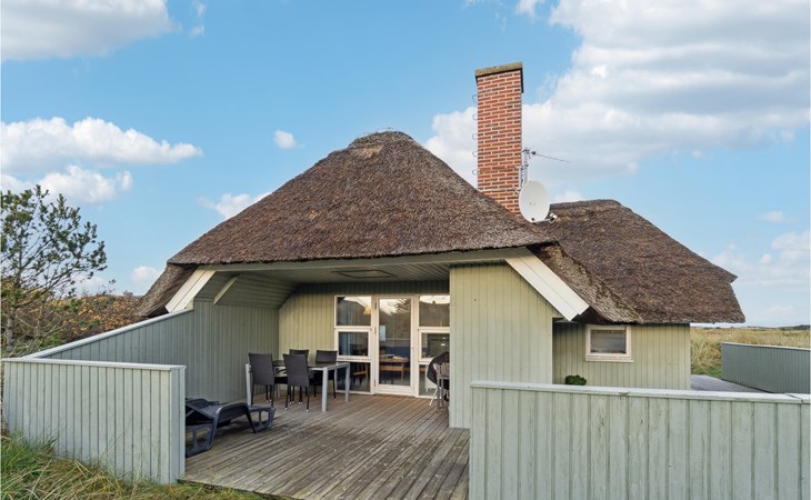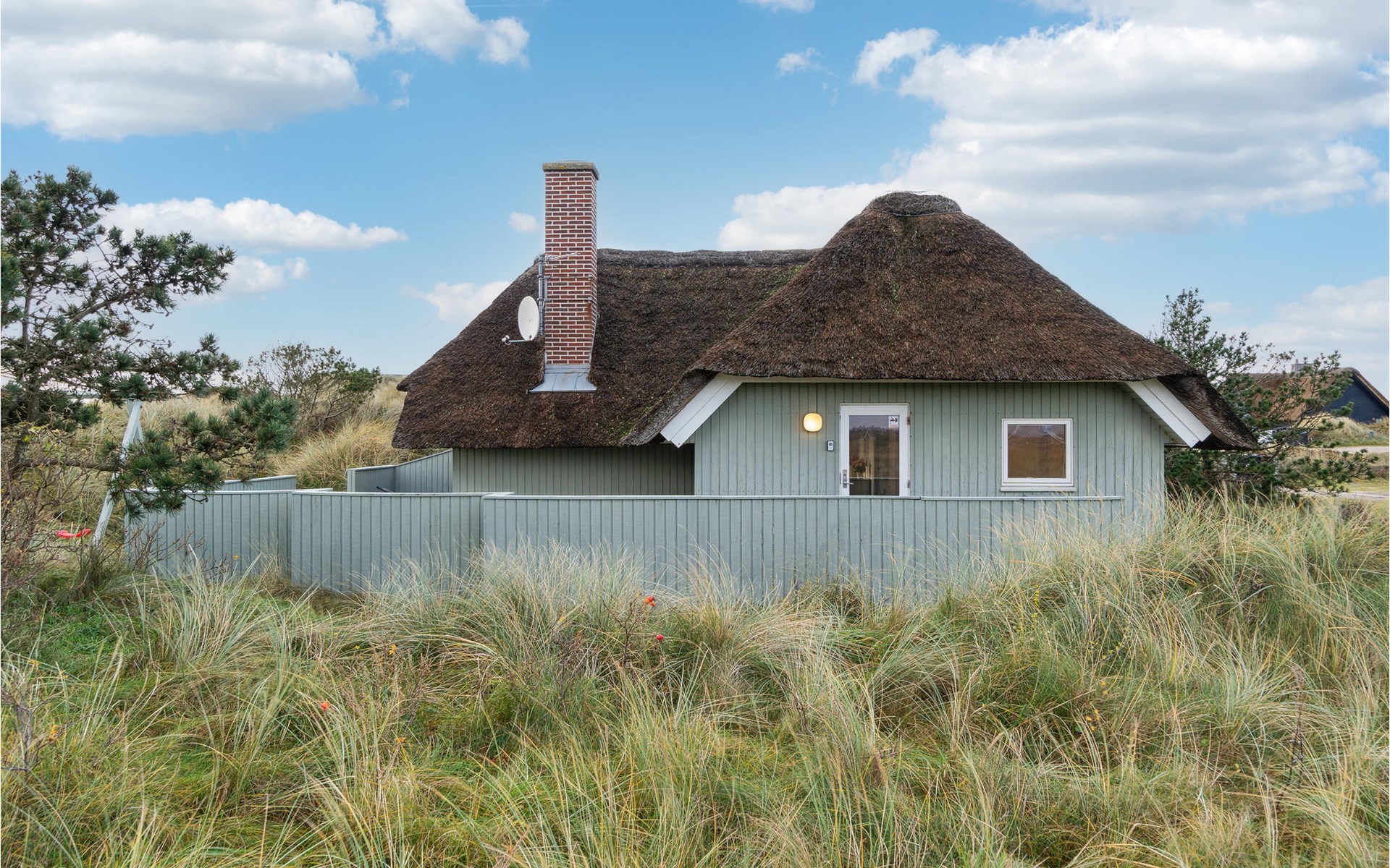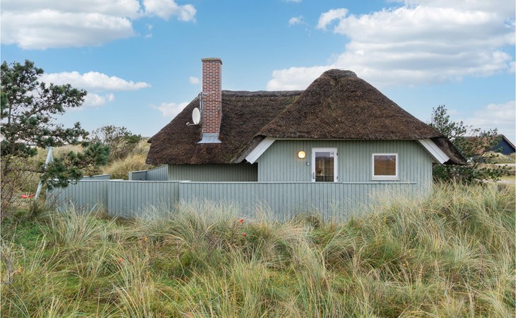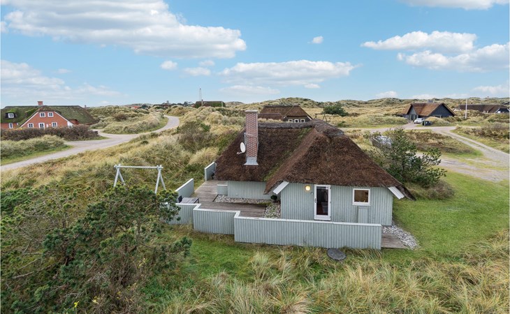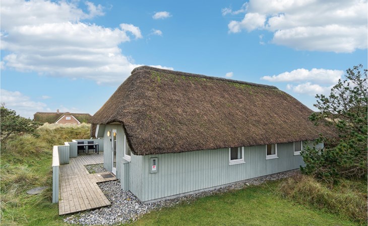Im westlichsten Teil von Blåvand, 300 m vom Meer entfernt, steht dieses schöne Ferienhaus von Dünen umgeben. Es fügt sich mit seinem für die Gegend so charakteristischen Strohdach in die Natur schön hinein. Es ist in einem guten Stand gebaut, und drinnen ist es mit funktionellen und komfortablen Möbeln hell und einladende eingerichtet. Dieses sehr gemütliche Ferienhaus wird Ihnen den schönen Rahmen Ihres Urlaubs bilden. Draußen gibt es eine große Terrasse, wo Sie mehrere windgeschützte Ecken finden. Sie wird an lauen Sommertagen ohne Zweifel der Treffpunkt sein. Die naturschöne Umgebung ist ideal für Spaziergänge in der frischen Nordseeluft.