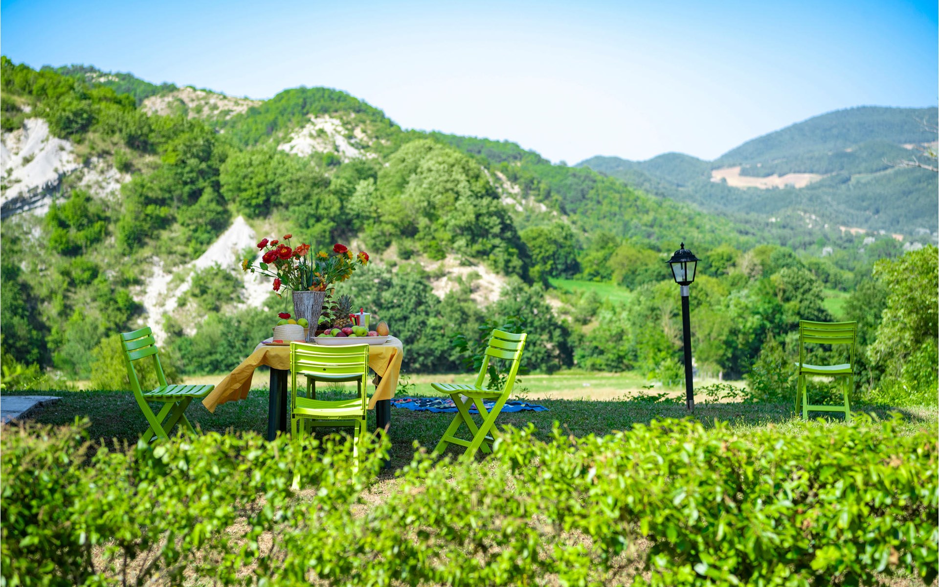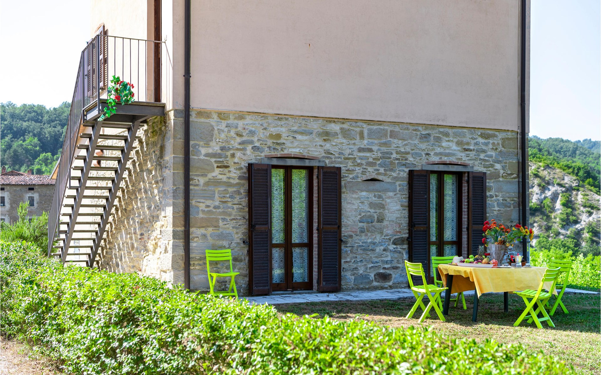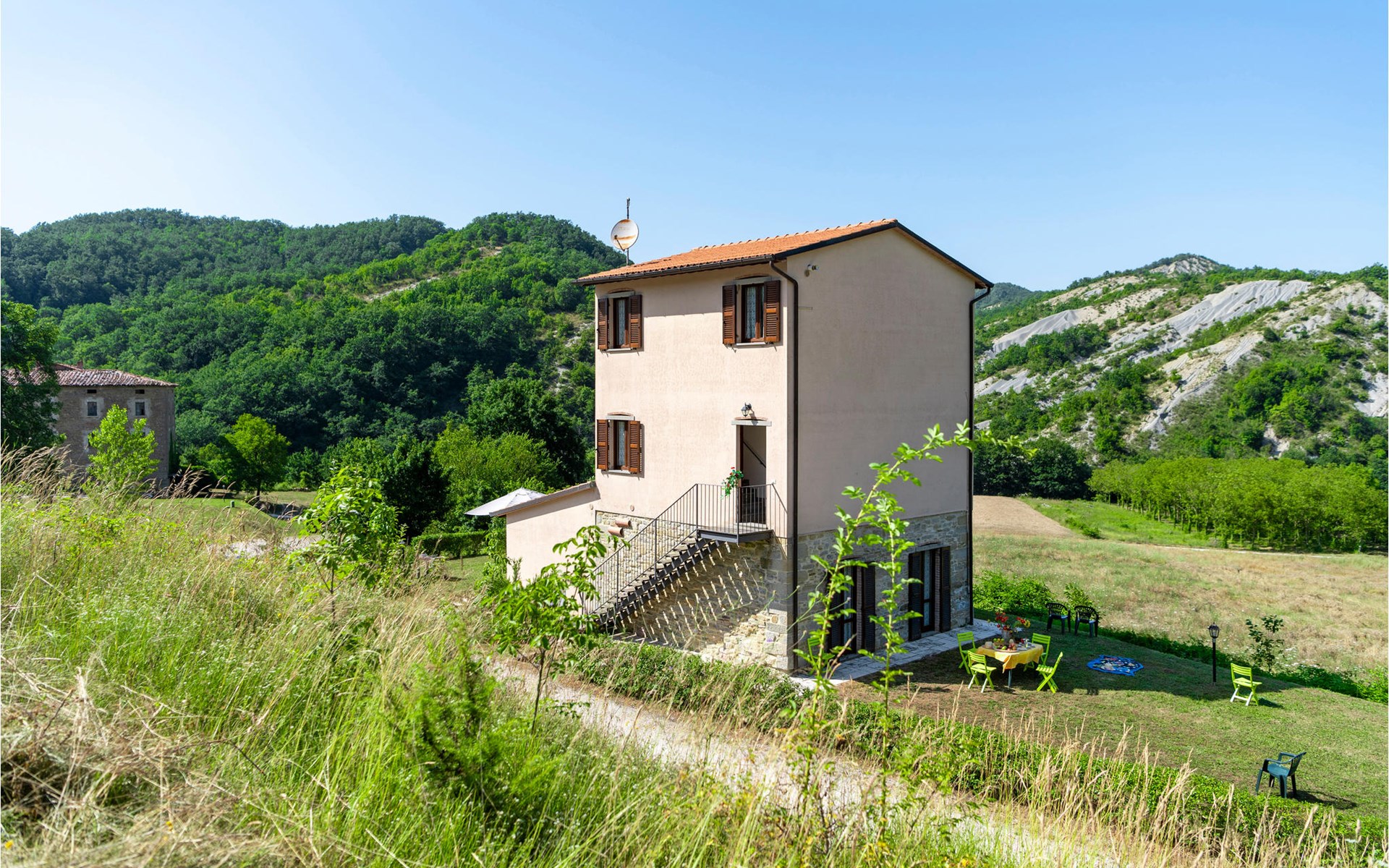 Diese Ferienwohnung befindet sich auf dem Anwesen namens Valguerriera ca. 4 km von Piobbico entfernt in einem Tal im Apennin, ein ideales Reiseziel für all diejenigen, die einen erholsamen Urlaub in unberührter Natur verbringen möchten. Das Anwesen besteht aus dem Herrenhaus und drei Landhäusern, den großzügigen, gemeinschaftlichen Außenbereichen und dem schönen, gemeinschaftlichen Schwimmbad (17x10m) mit Unterwassermassage. In den Landhäusern entstanden insgesamt 11 ansprechend eingerichtete Ferienwohnungen. Die Wohnung verfügt über einen eigenen Außenbereich mit Tisch, Stühlen und Sonnenschirm, wo Sie sich entspannen und Ihre Mahlzeiten im Freien einnehmen können. Grill und Waschmaschine zur gemeinschaftlichen Benutzung. Parkplatz auf dem Grundstück. 1 Babybett verfügbar. Das Anwesen befindet sich in den Marken an der Grenze zu den Regionen Toskana und Umbrien in der Nähe von Piobbico (Provinz Pesaro und Urbino), in einem ruhigen Tal namens Candigliano, eins der schönsten und ursprünglichsten Täler im Hinterland von Pesaro, das über ein mildes Klima verfügt und von wo aus Sie einen wundervollen Blick auf den Apennin genießen. In der Umgebung finden Sie Kunst- und Renaissancestädte wie beispielsweise Urbino, UNESCO-Welterbe, bezaubernde, mittelalterliche Dörfer wie Piobbico, Apecchio, Sant’Angelo in Vado und Acqualagna, bekannt für ihre Trüffel, oder Urbania, Cagli, San Marino, Gradara und San Leo. Die Lage des Anwesens ist günstig auch für etwas weitere Tagesausflüge nach Gubbio, Assisi, Perugia, Città di Castello, Arezzo, San Sepolcro, Loreto, Florenz und Siena, alles Orte von großem, kunsthistorischem Interesse, oder nach San Marino, zur Burg von Gradara, den Grotten von Frasassi bzw. zum Furlopass. ENTFERNUNGEN: 4 km Piobbico (Lebensmittelgeschäft und andere Einkaufsmöglichkeiten, Bank, Apotheke, Arzt), 30 km Urbino, 55 km Fano und die Strände der Adriaküste, die man in etwa einer Autostunde erreicht. 6 km ein Wellnesscenter und 10 km entfernt eine Reitbahn. Möglichkeit zu geführten Ausflügen. Die 11 Ferienwohnungen und das unabhängige Ferienhaus, das sich aus 3 der insgesamt 11 Ferienwohnungen zusammensetzt, haben die folgenden Referenznummern: IMM127/422/423/424; IMM128/129/130/131; IMM421/412/419/420. Als Willkommensgeschenk erhalten die Gäste eine Flasche Wein und eine Weinprobe (einmal pro Woche) in einem Weinkeller mit Weinen und typischen Produkten. Für Novasol Gäste gibt es auch Sonderpreise bei einem 10 km entfernten Ausritt und bei einem 6 km entfernten Wellnesscenter. WLAN in den Außengemeinschaftsbereichen.