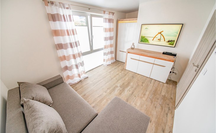 Ein Schlafzimmer ist mit einem Doppelbett, das andere mit einer Schlafcouch ausgestattet. Im Wohnzimmer sowie in den Schlafzimmern befinden sich jeweils ein Samsung Frame TV.