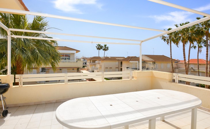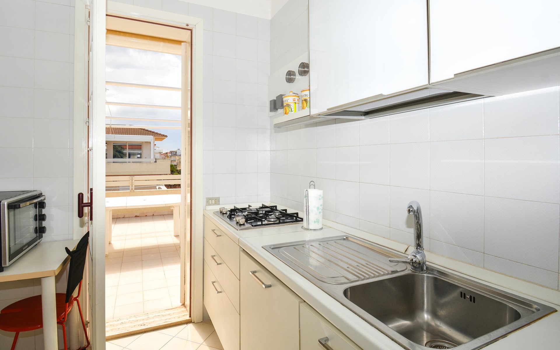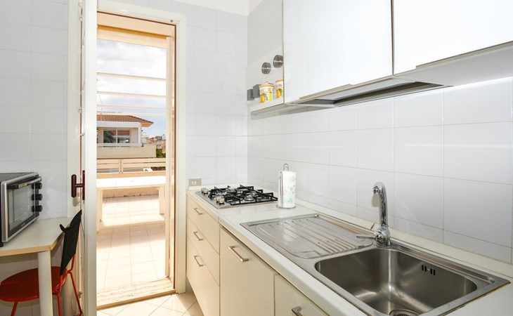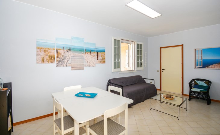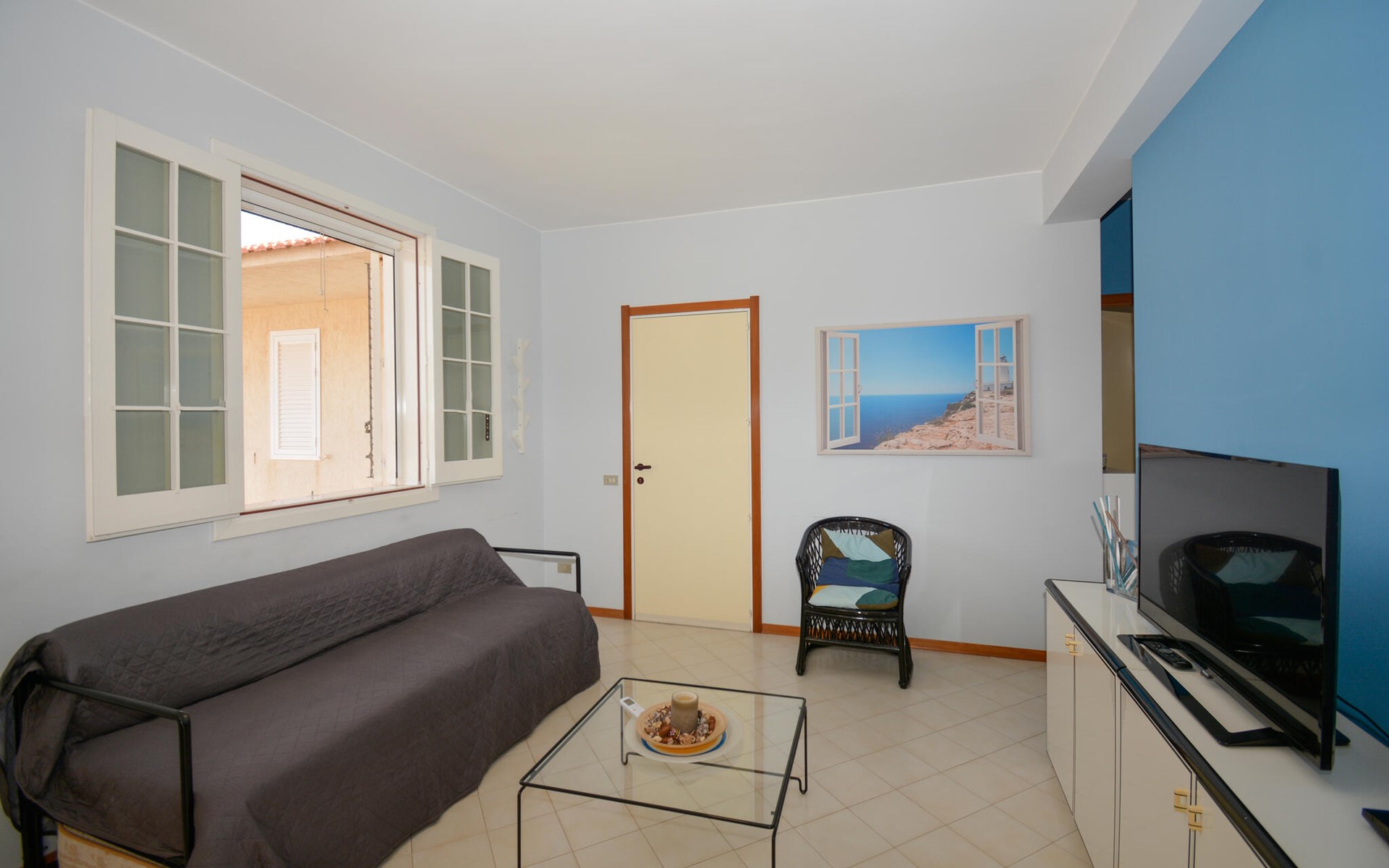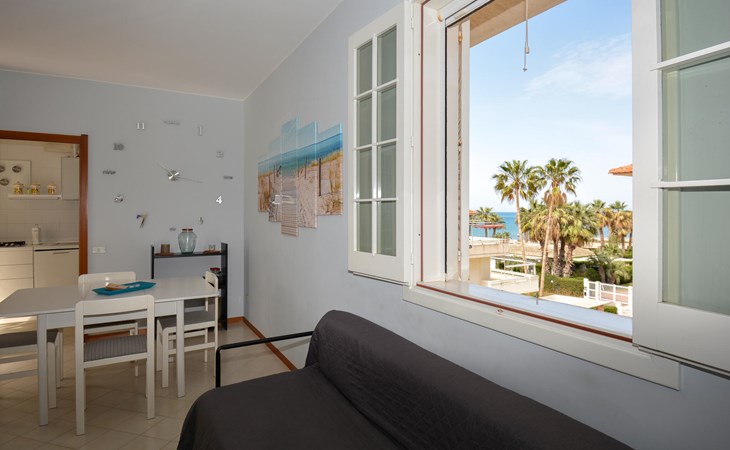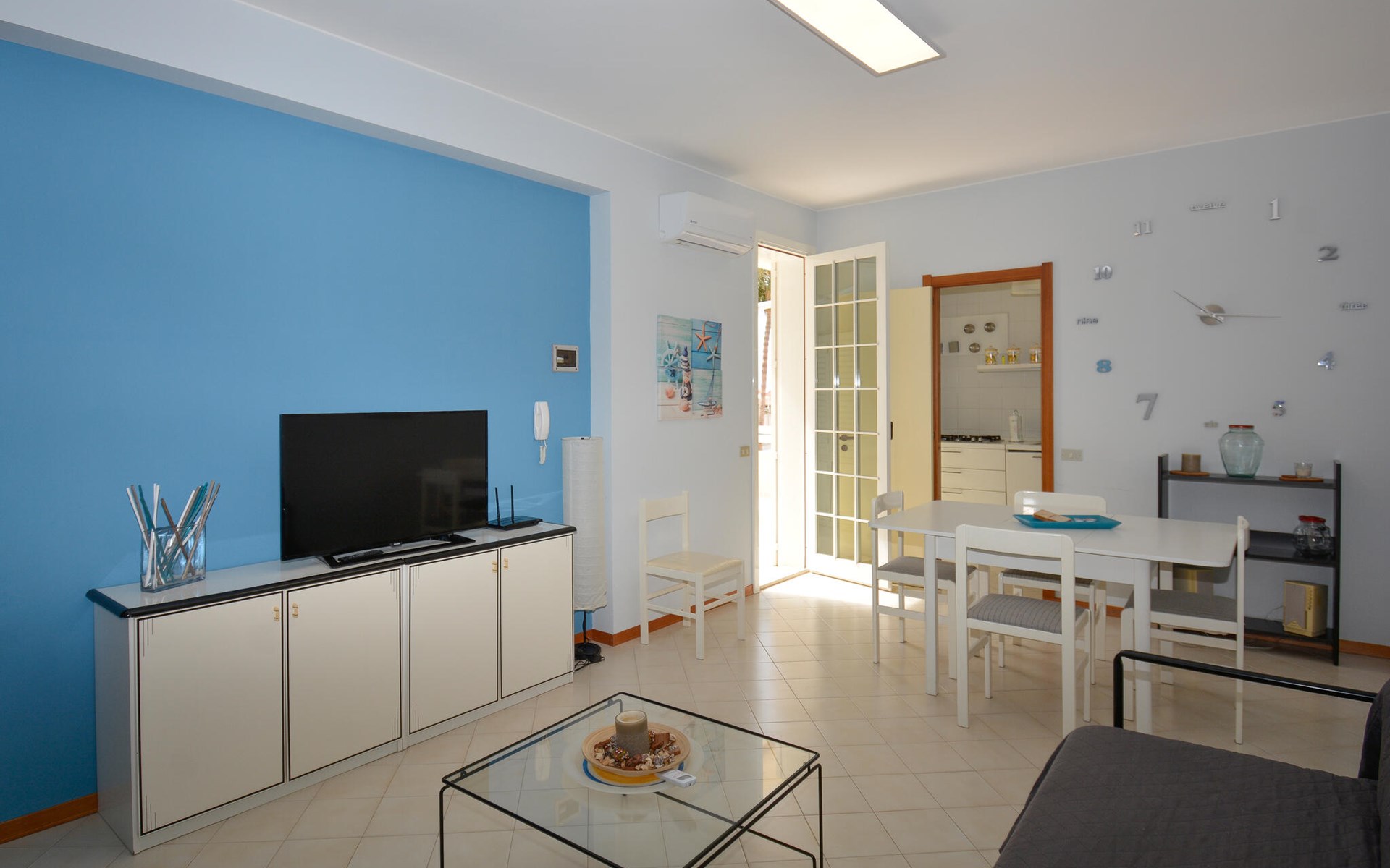 Der offene Wohnbereich Ihrer Wohnung lädt mit einem bequemen Sofa und einem Esstisch zu geselligen Momenten ein. Schauen Sie gemeinsam fern oder nutzen Sie die Zeit für Spiele und Mahlzeiten. Kochen Sie in der kleinen, praktischen Küche mit Zugang zum Balkon und erfreuen Sie sich an der geschmackvollen Einrichtung Ihrer Wohnung, die mit hellen Tönen und farbigen Details eine angenehme Stimmung schafft. Aus dem Fenster im Wohnbereich können Sie das glitzernde Blau des Mittelmeers erblicken.