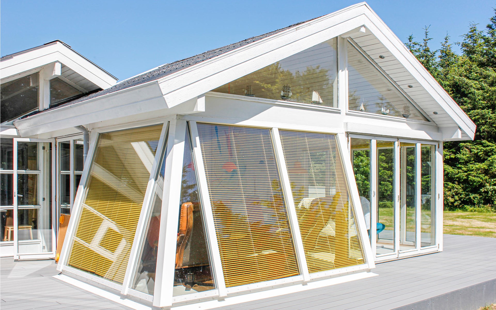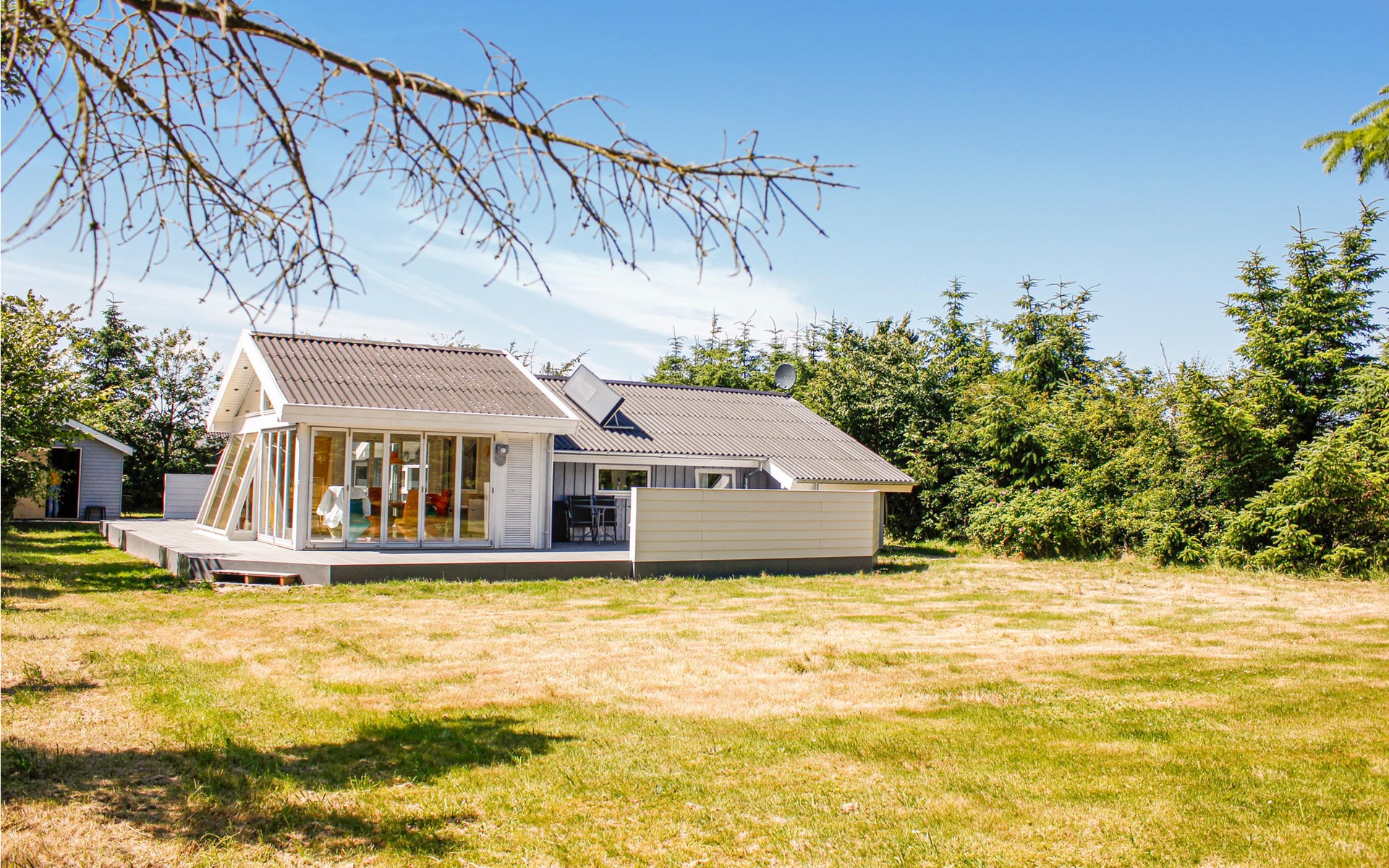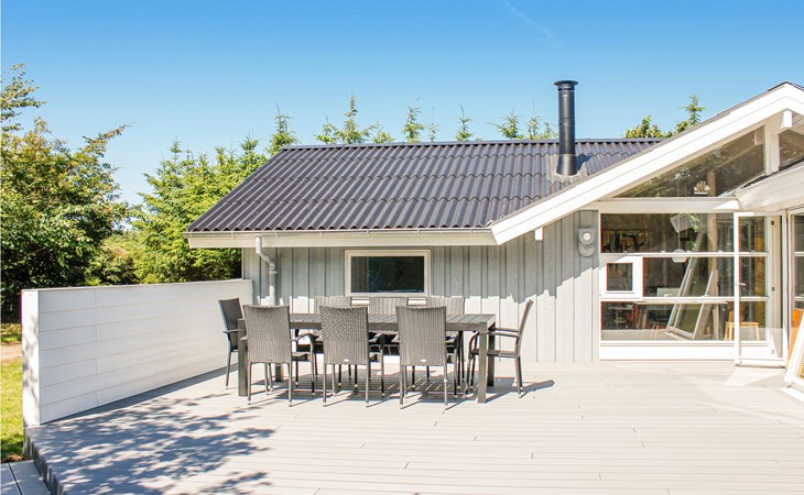 Dieses einladende Ferienhaus befindet sich auf einem schönen, geschlossenen Grundstück am Ende der Stichstraße. Das Haus bietet 3 Schlafzimmer und einen Alkoven. Außerdem gibt es ein Badezimmer, eine schöne Küche in Verbindung mit dem Wohnzimmer und einen Wintergarten mit Esstisch, in dem man fast draußen sitzen kann, da man von Glas umgeben ist. Das Haus ist fast komplett von Terrassenflächen umgebne, so dass Sie hier sehr gute Möglichkeiten haben, auch bei Westwind ein windtilles, sonniges Plätzchen zu finden. Auf den Terrassen können Sie gut grillen, während die Kinder im Garten spielen.
