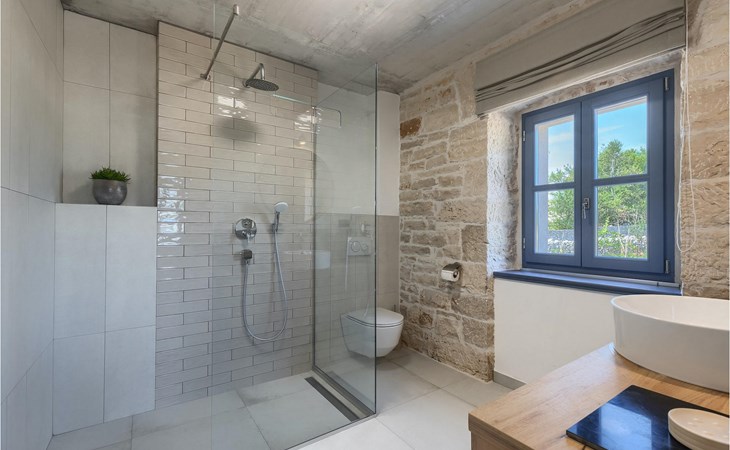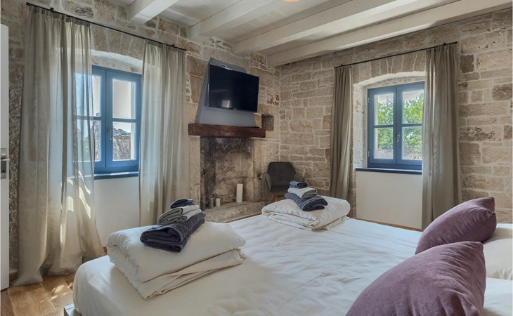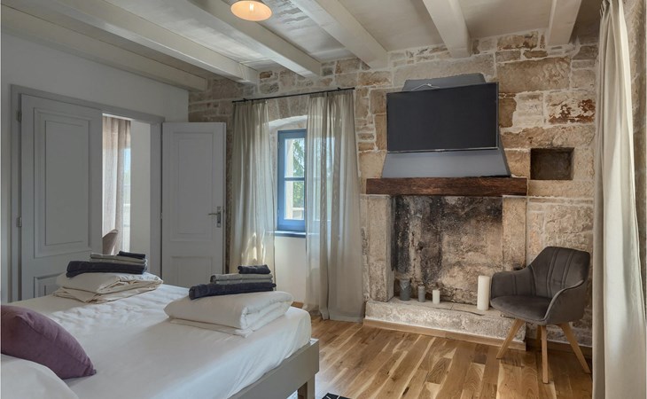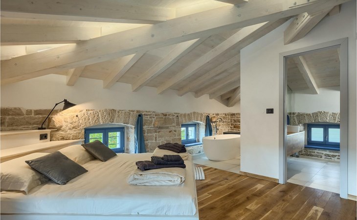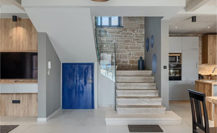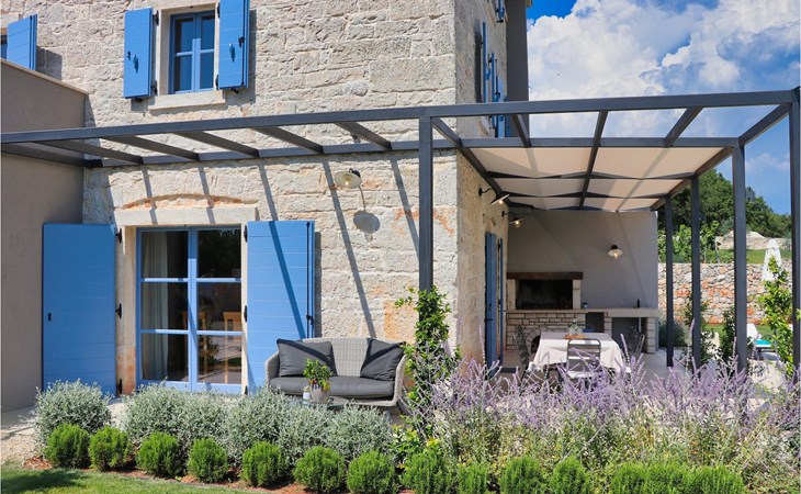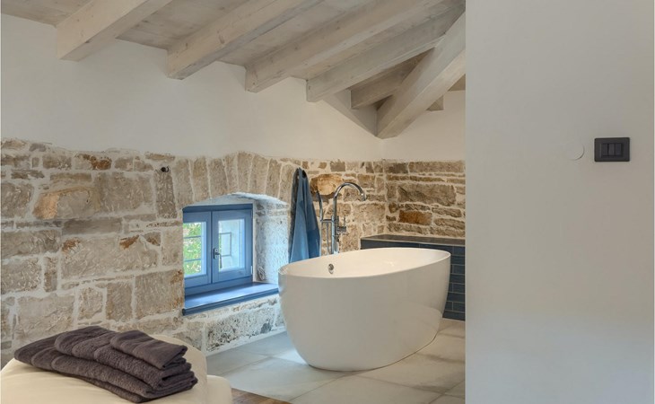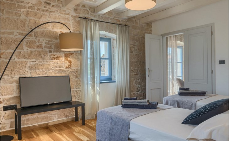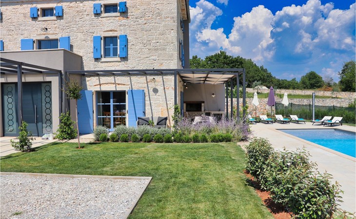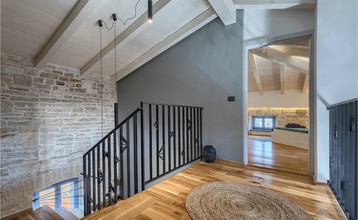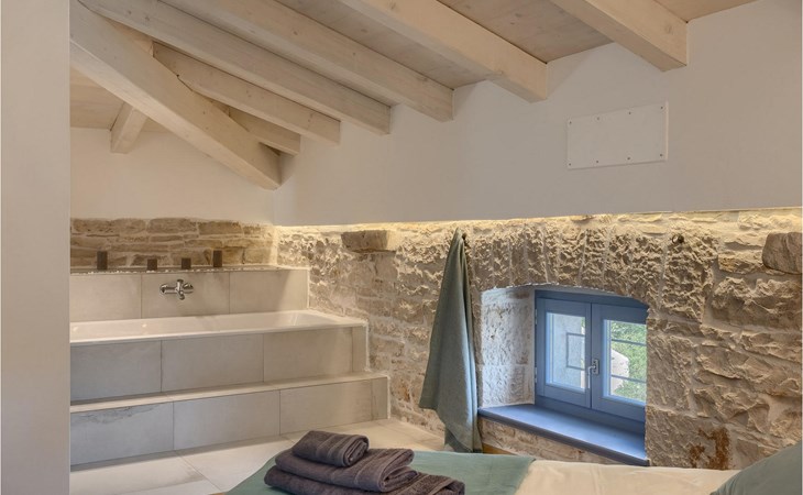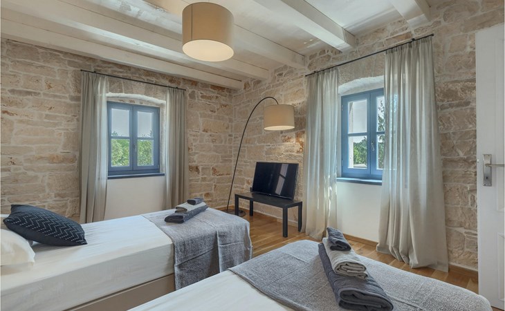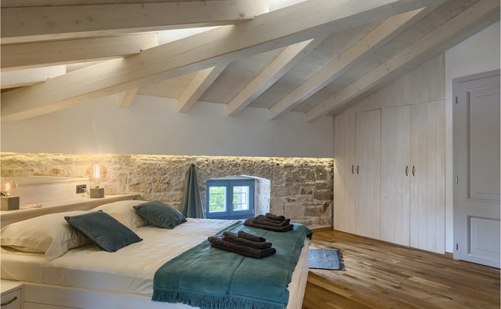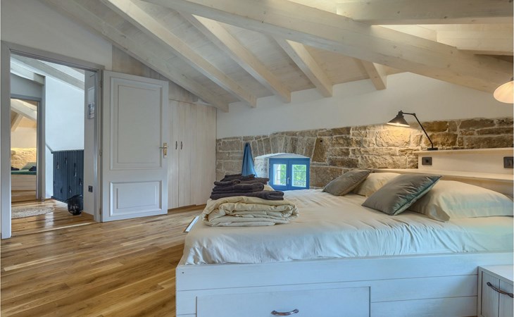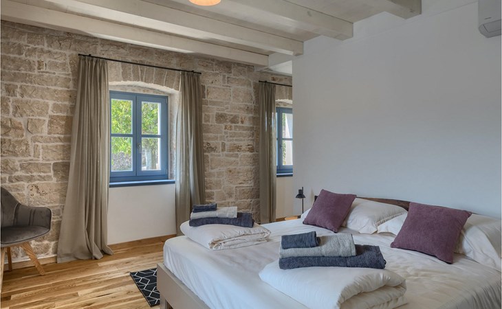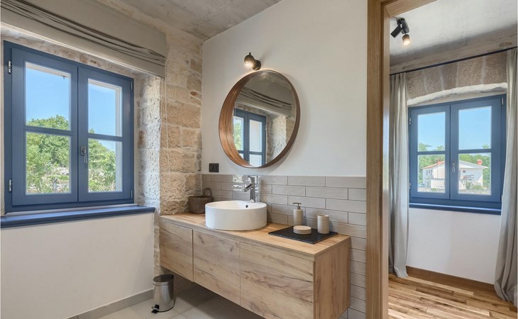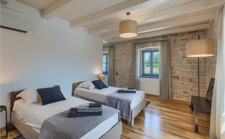 Die Villa verfügt über insgesamt 4 Schlafzimmer und bietet Platz für bis zu 10 Personen, was sie ideal für einen Familienurlaub macht. Das Innere ist modern und mit hochwertigen Geräten ausgestattet, jedoch hat die Villa auch ihren ursprünglichen Charme, der für alte Häuser Istriens typisch ist - ein gutes Beispiel sind bunte Holzfenster und Steinmauer.