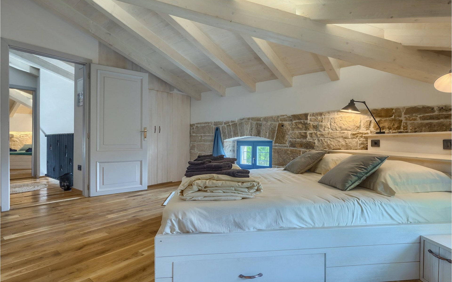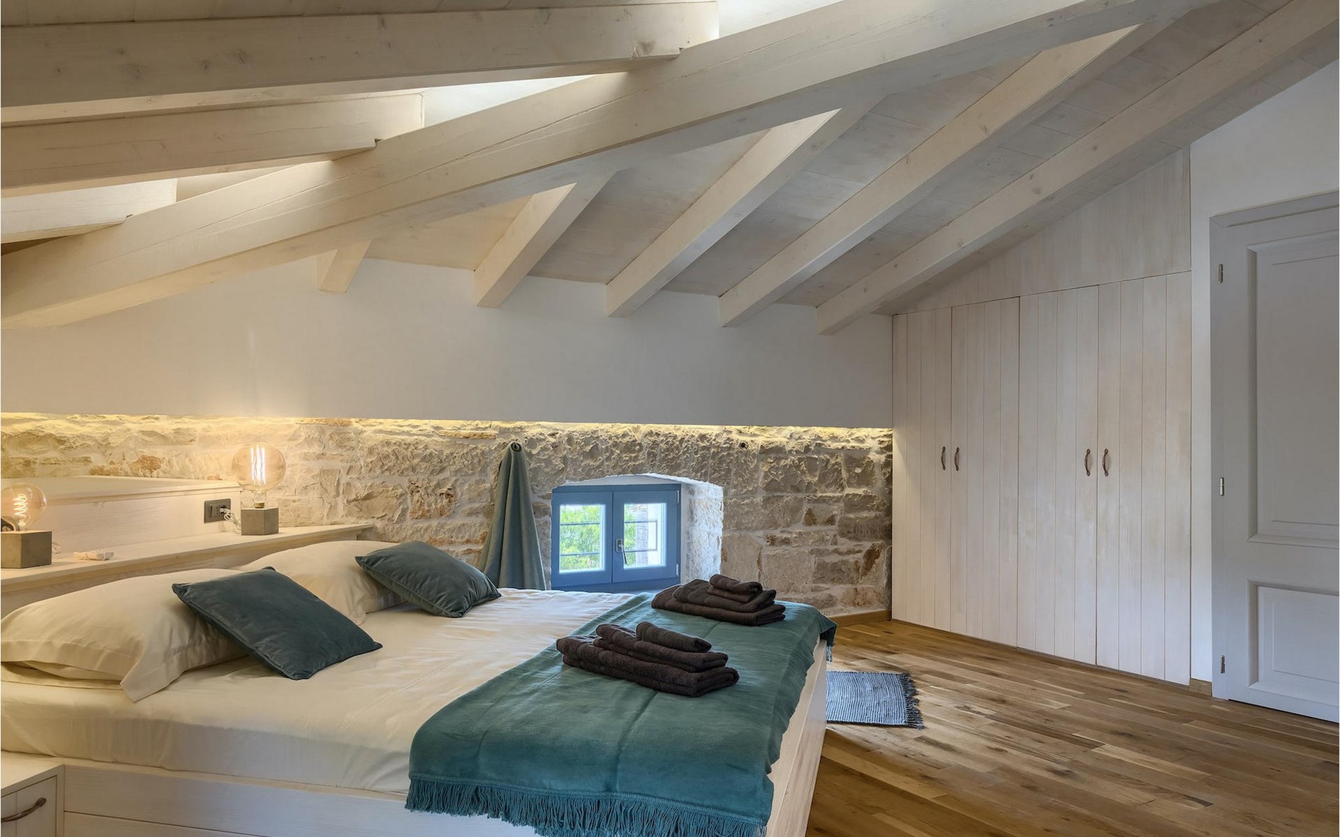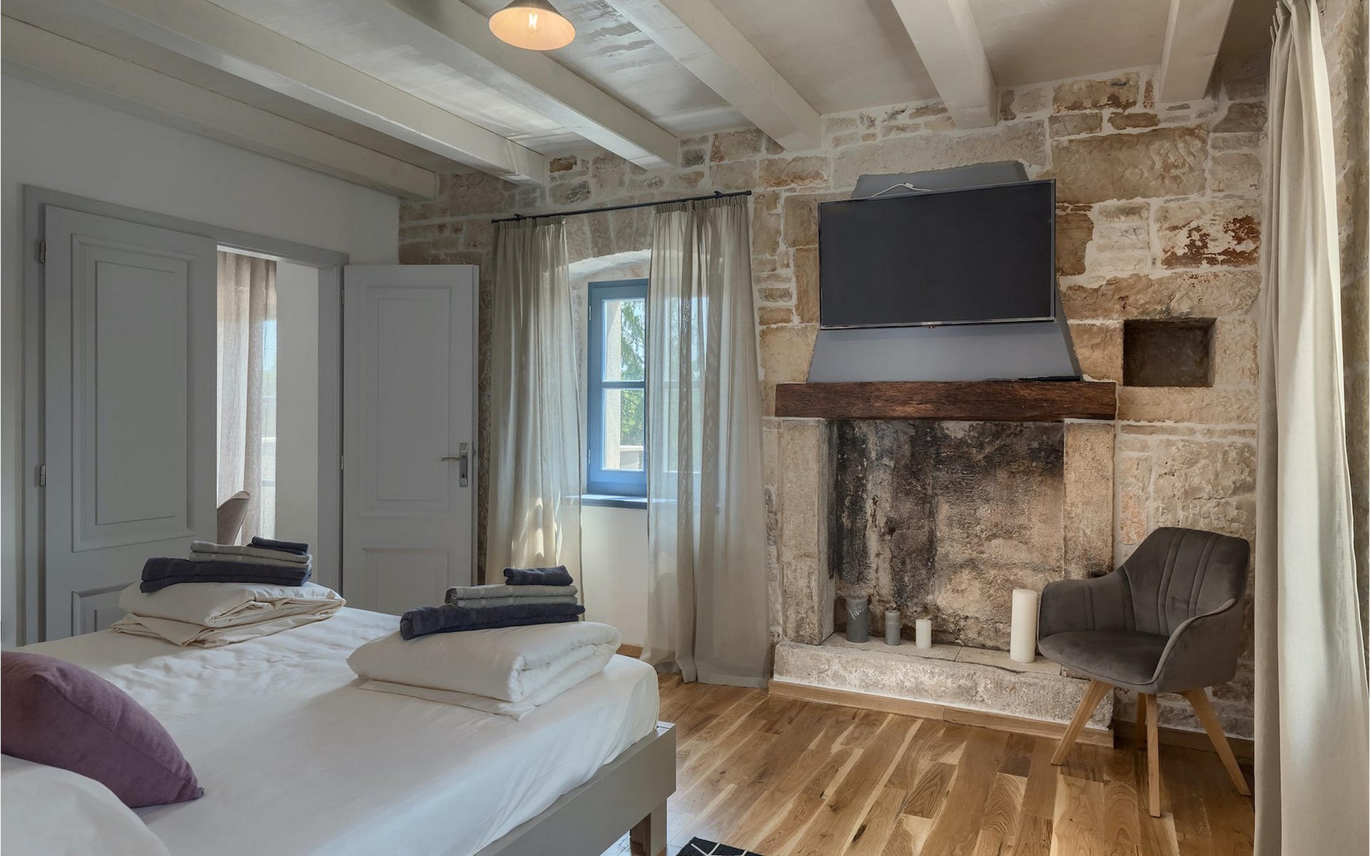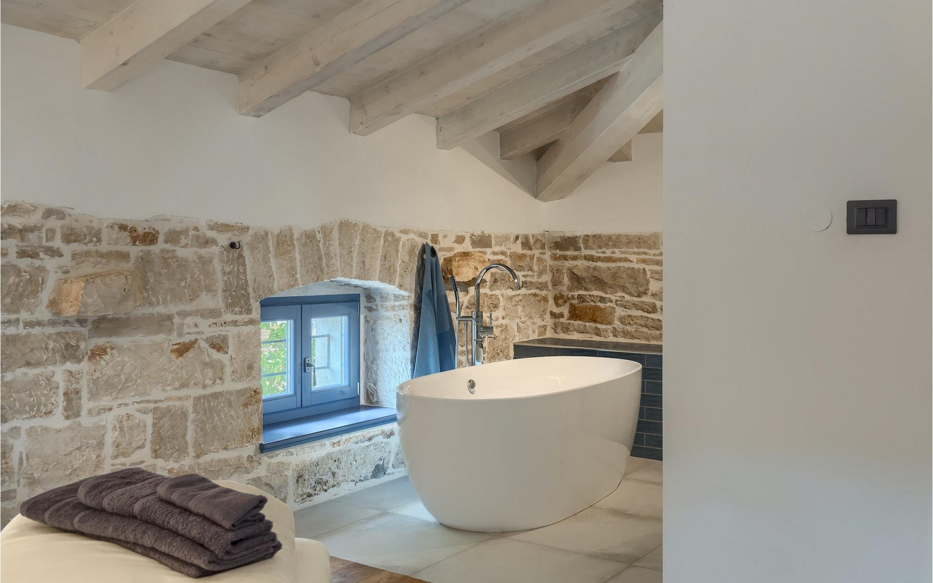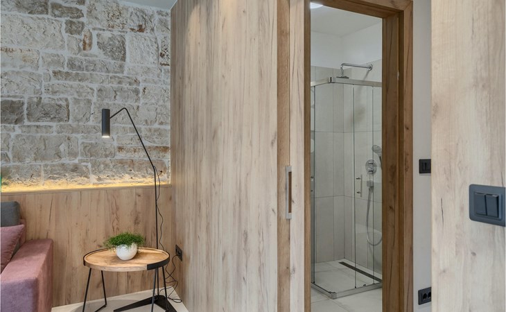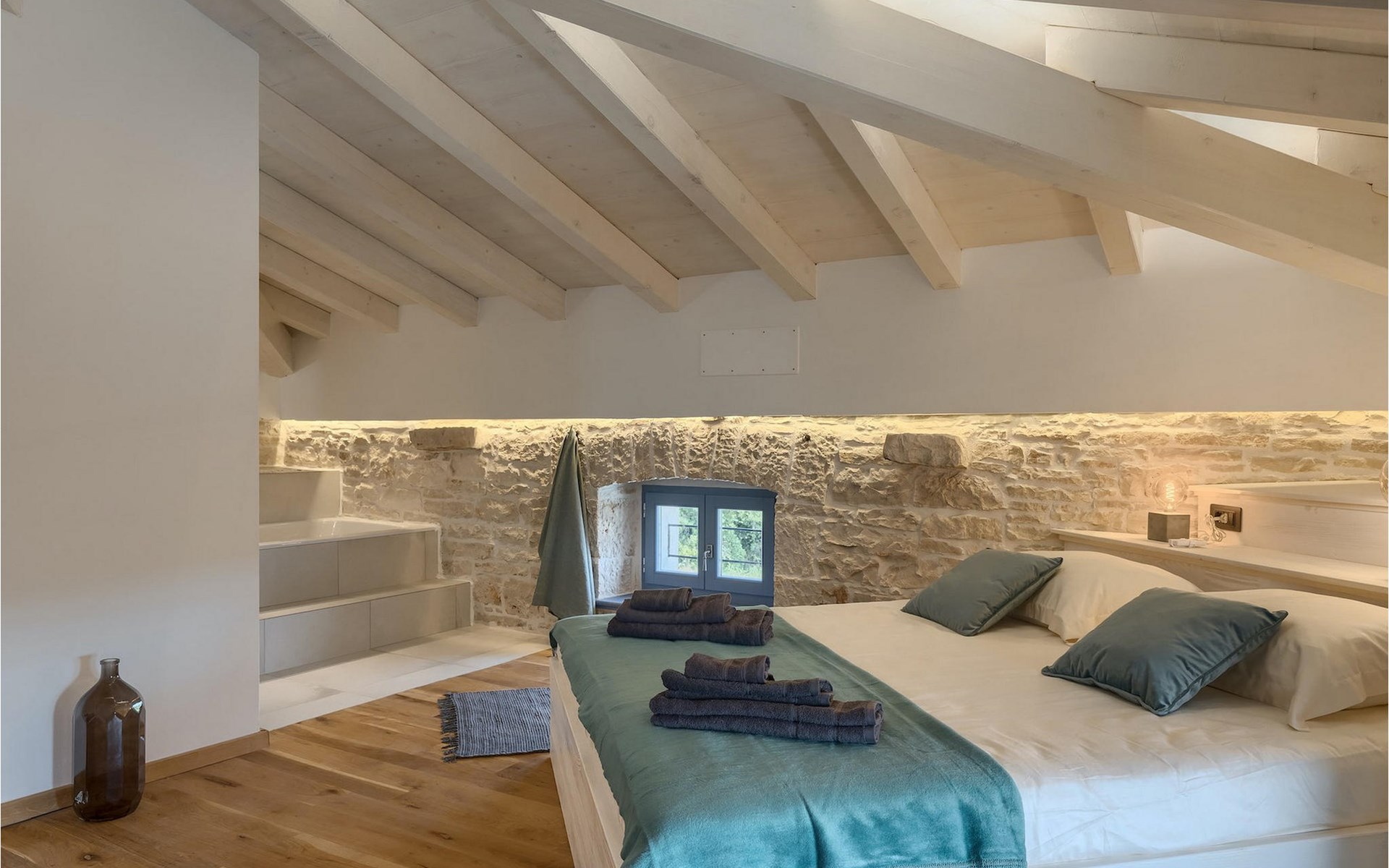 Die Villa verfügt über insgesamt 4 Schlafzimmer und bietet Platz für bis zu 10 Personen, was sie ideal für einen Familienurlaub macht. Das Innere ist modern und mit hochwertigen Geräten ausgestattet, jedoch hat die Villa auch ihren ursprünglichen Charme, der für alte Häuser Istriens typisch ist - ein gutes Beispiel sind bunte Holzfenster und Steinmauer.