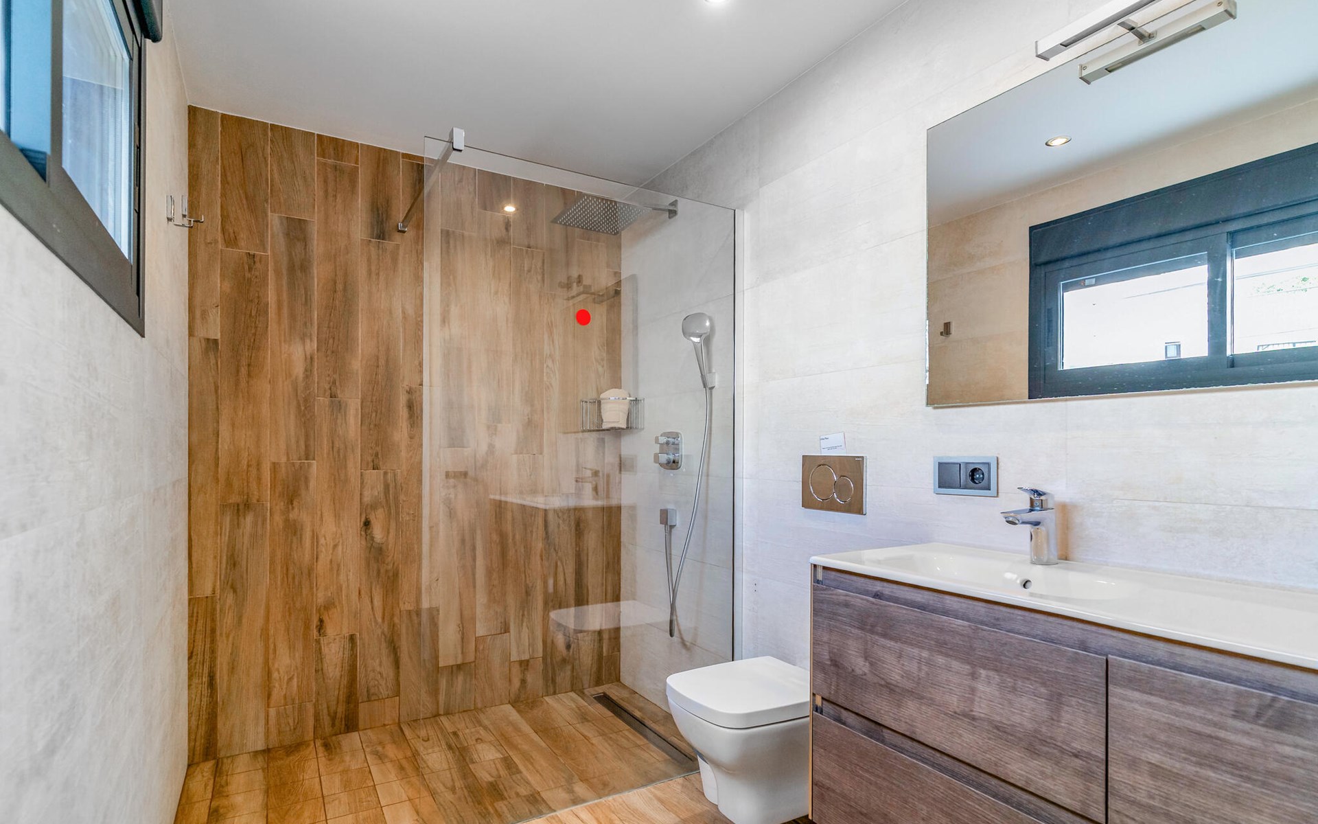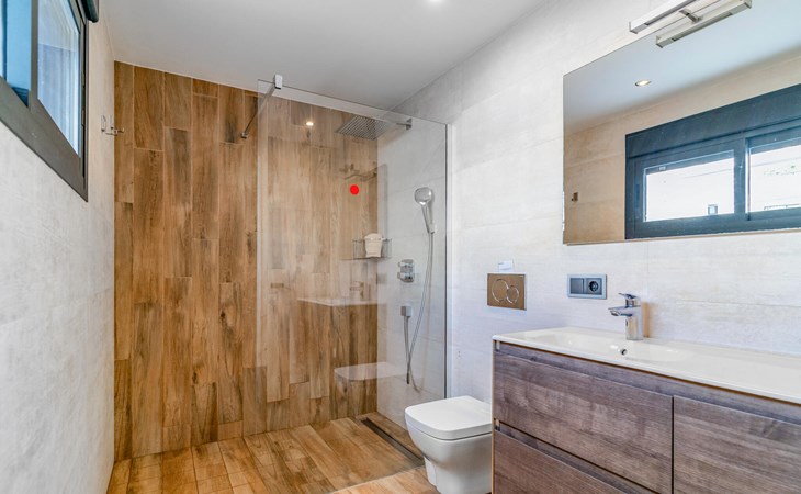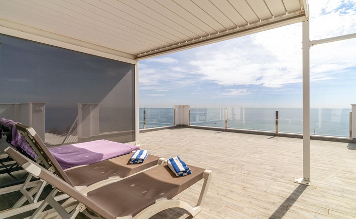Auch auf der großzügigen, teils überdachten Terrasse können Sie das Meer bestaunen. Starten Sie hier mit einem Frühstück in den Tag, spielen Sie Tischtennis und sonnen Sie sich auf bequemen Liegen. Erfrischen Sie sich nach Lust und Laune in Ihrem Pool und entfachen Sie abends den Grill.