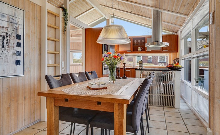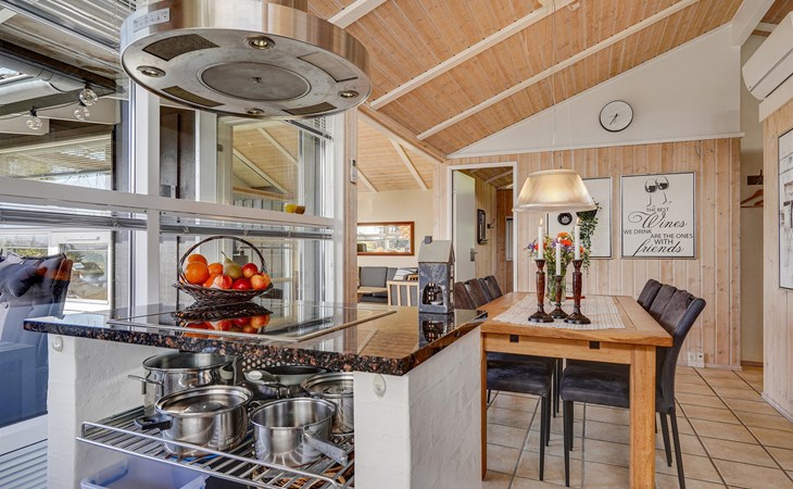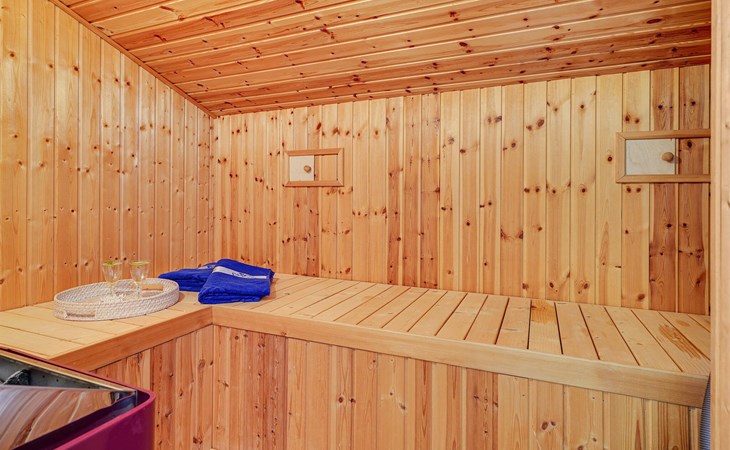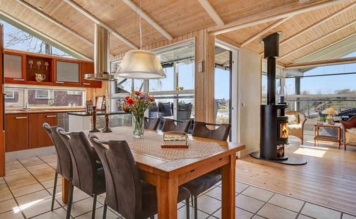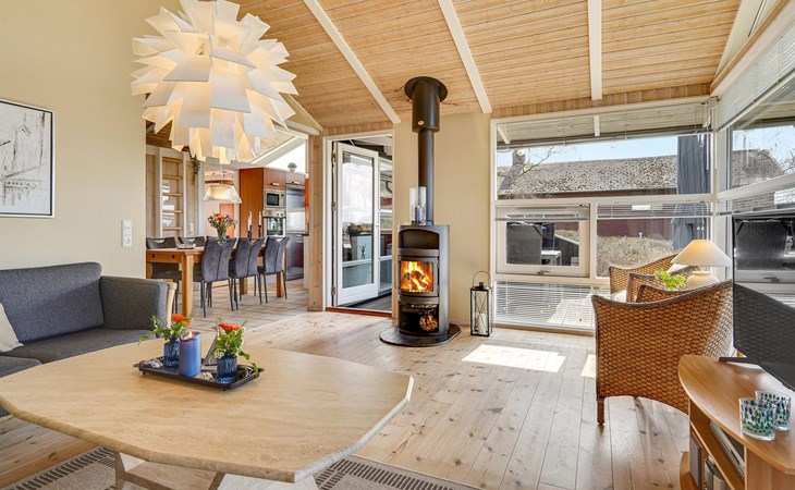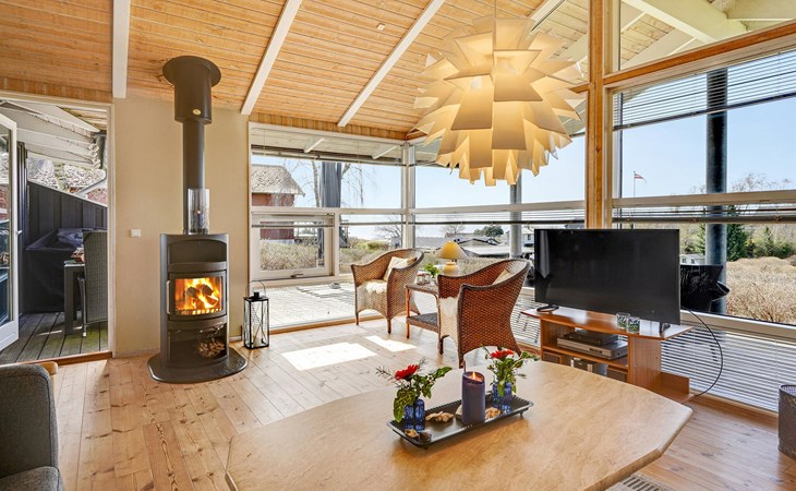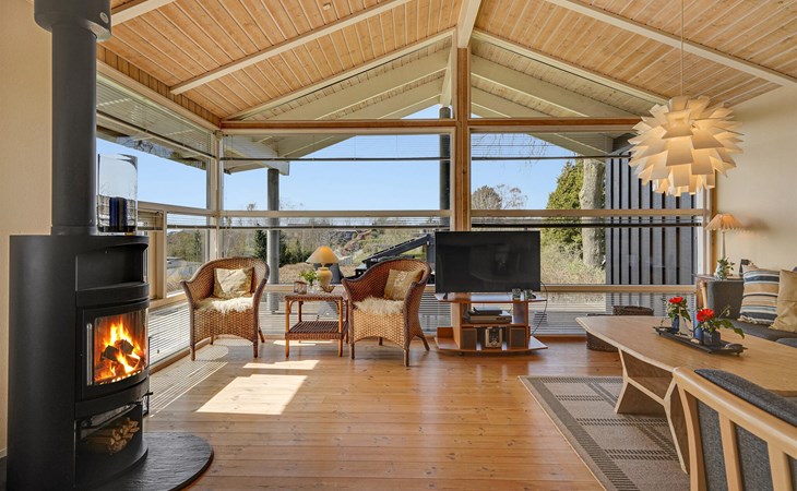 Dieses einladende Ferienhaus ist wie geschaffen für eine ruhige Auszeit vom Alltag. Durch große Fensterfronten gelangt viel Tageslicht ins Innere, während Sie aus den hellen Wohnräumen eine wunderschöne Panoramasicht auf das Wasser genießen. Entspannen Sie sich auf dem gemütlichen Sofa mit einem Glas Wein, entzünden Sie an kühleren Tagen den Kaminofen oder erholen Sie sich bei wohliger Wärme in der Sauna.