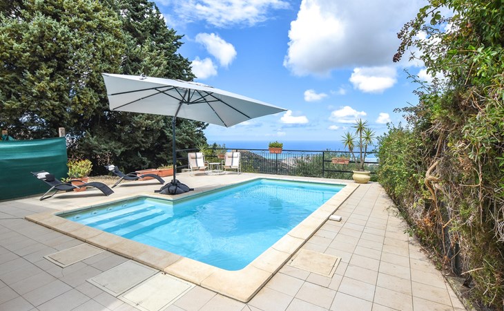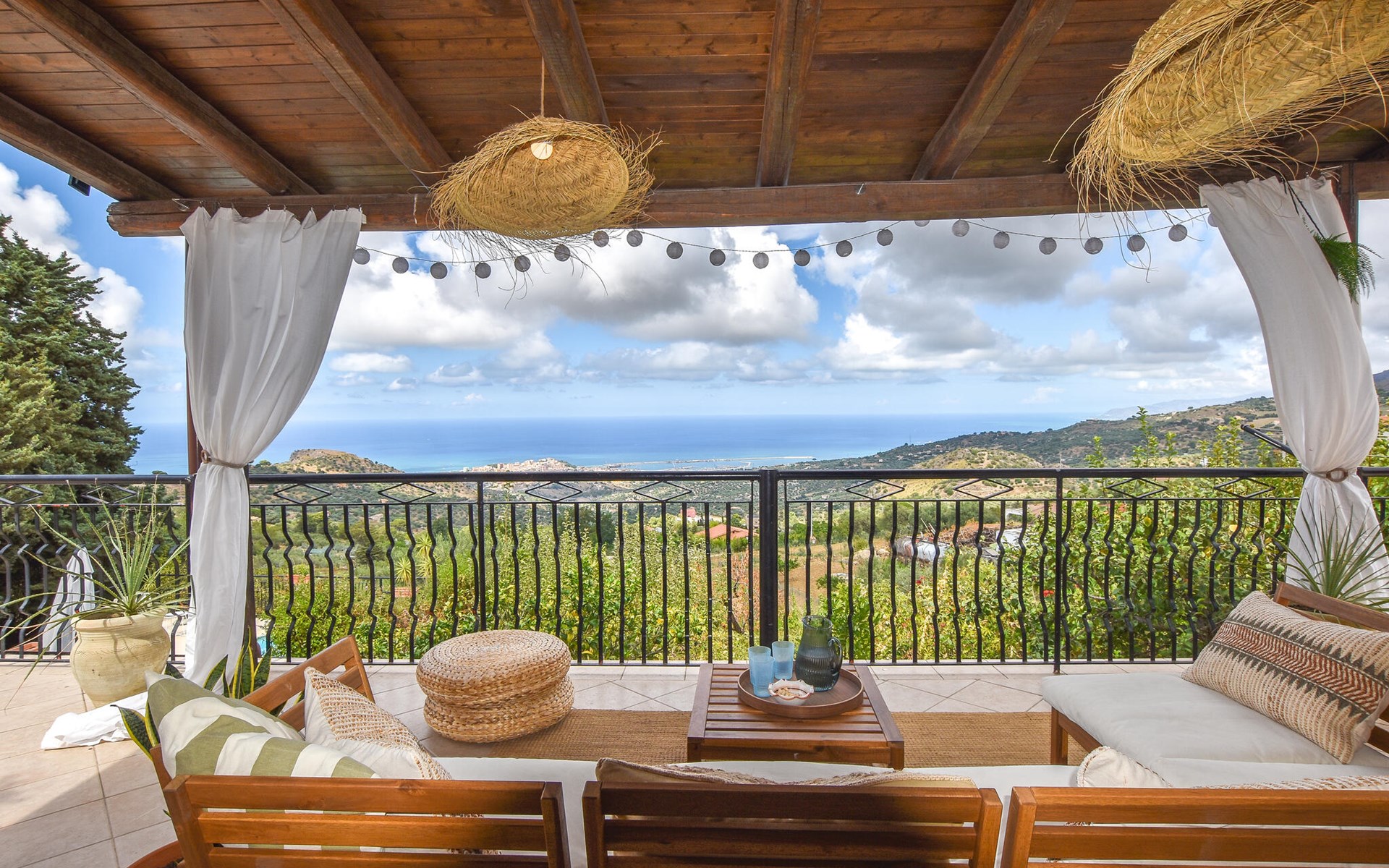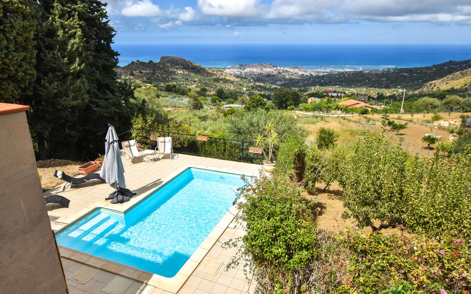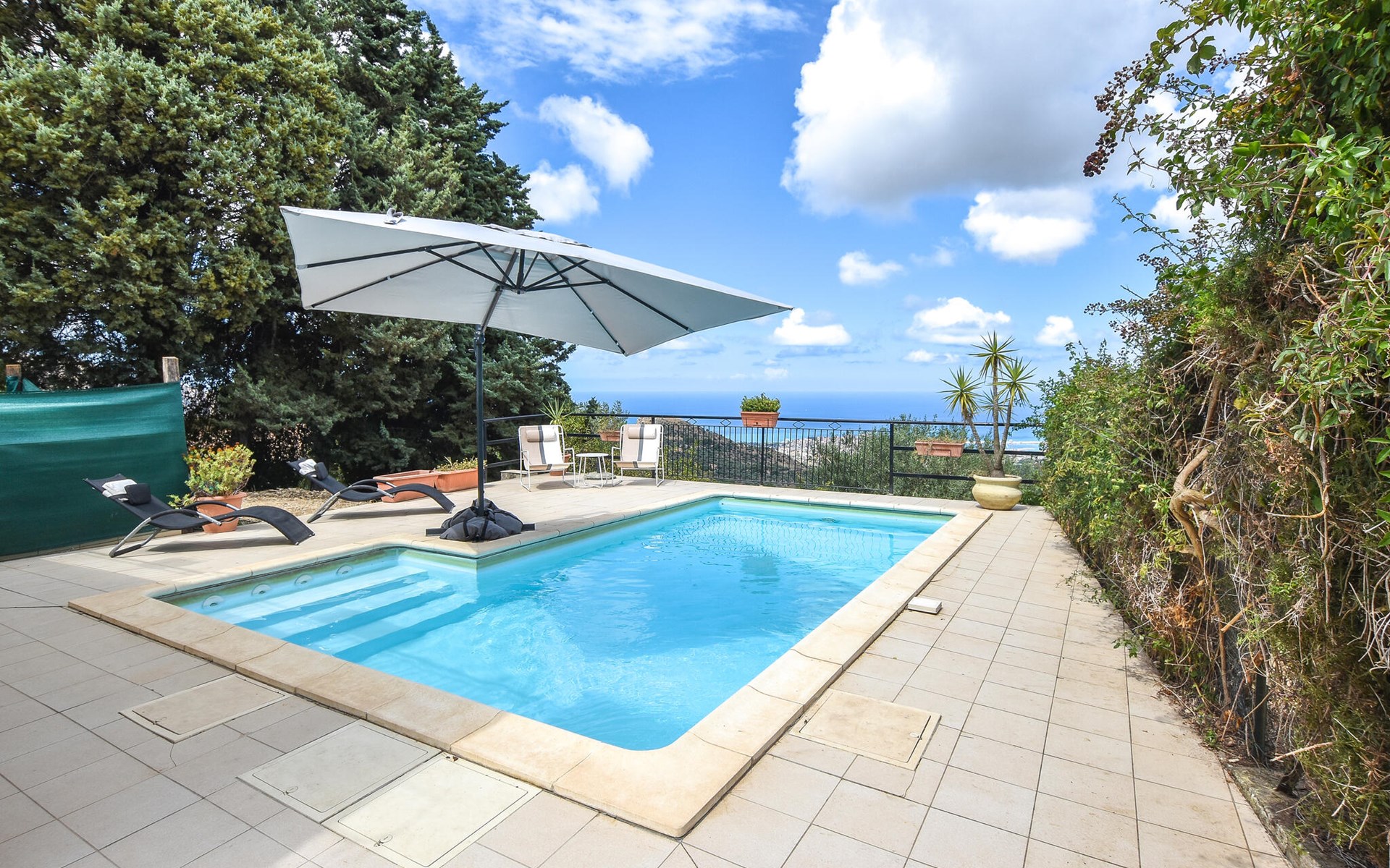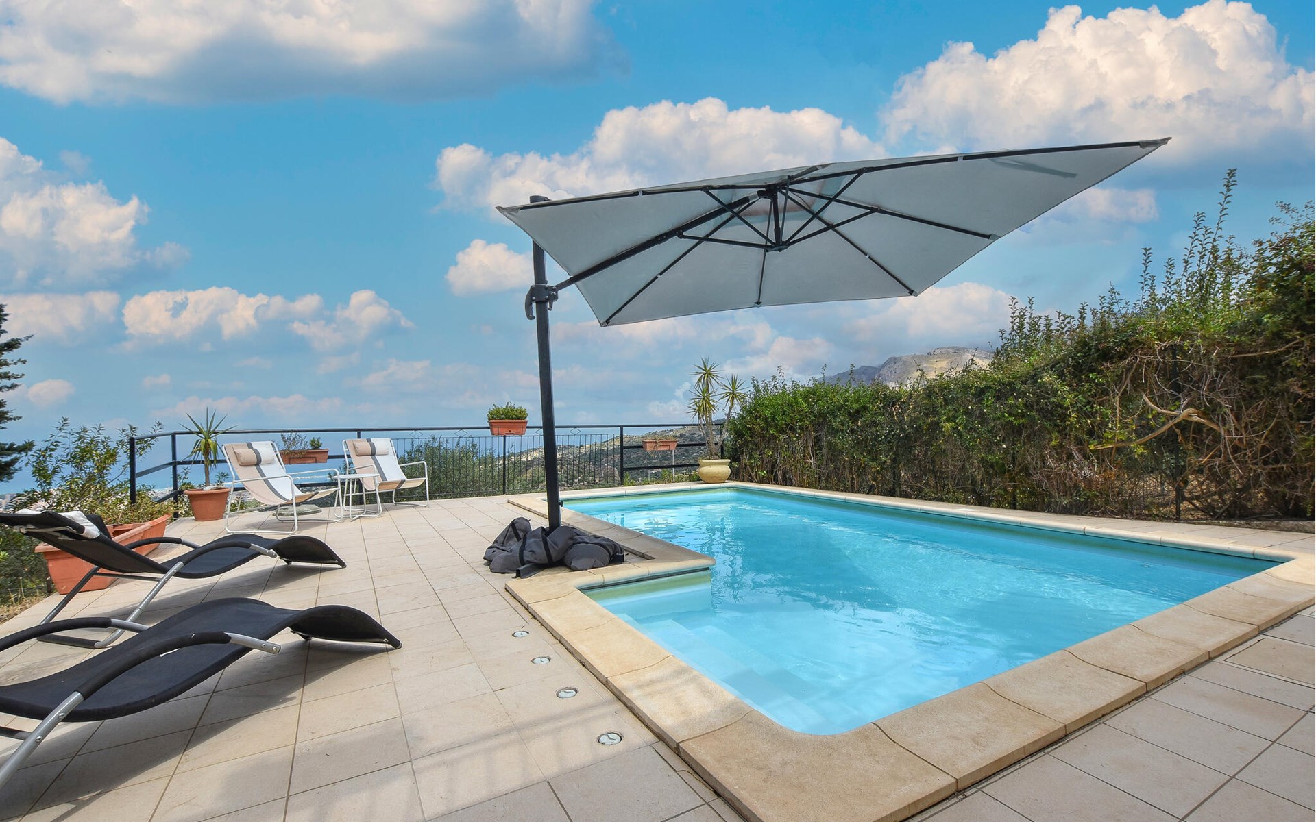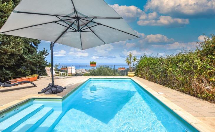Genießen Sie in diesem komfortablen Ferienhaus mit Pool einen wunderschönen Panoramablick bis zum Meer.